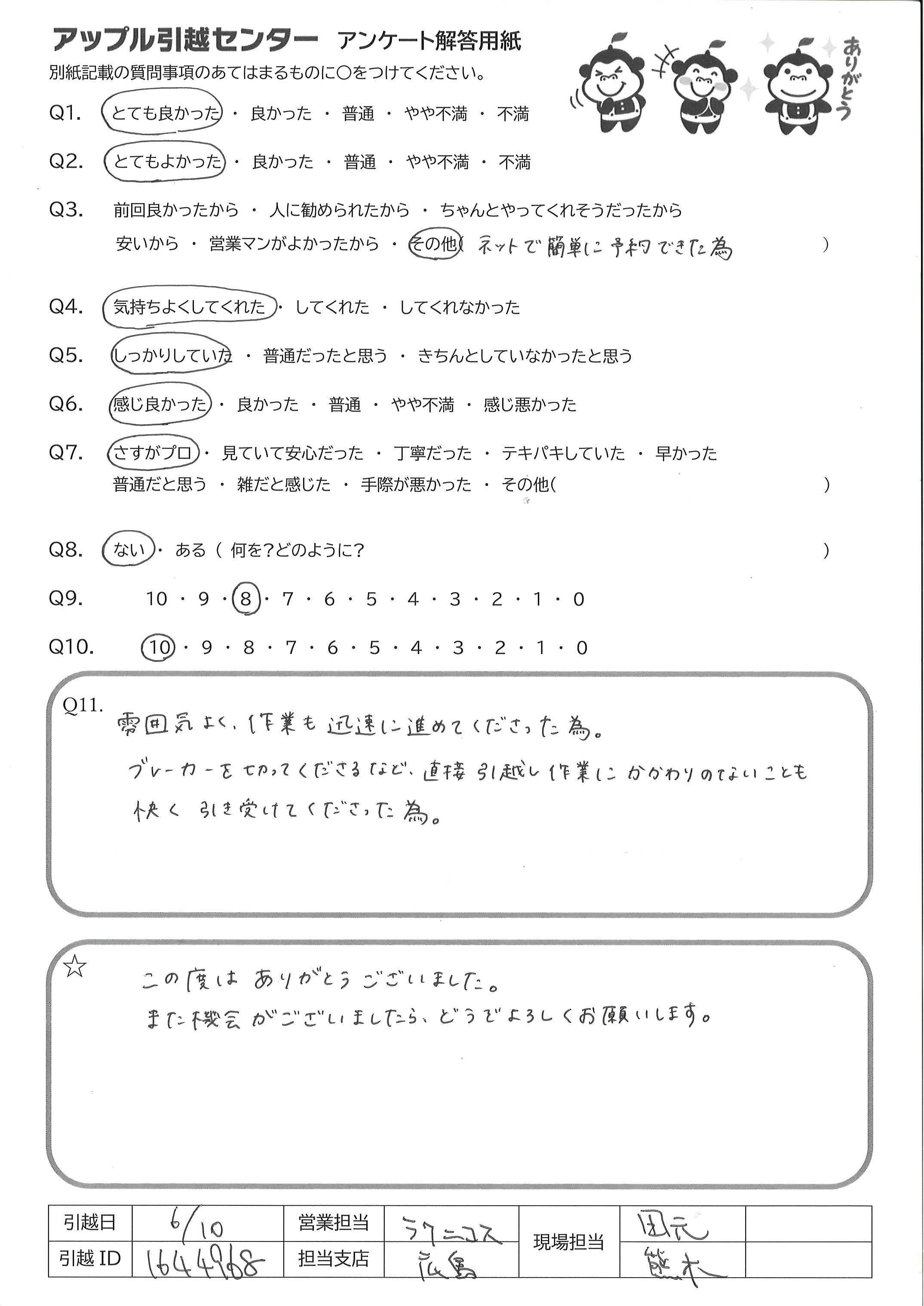 A.雰囲気よく、作業も迅速に進めてくださった為 ブレーカーを切ってくださるなど、直接引越し作業にかかわりのないことも 快く引き受けてくださった為