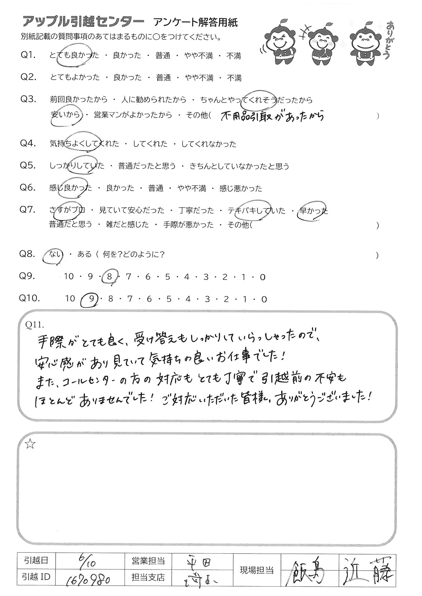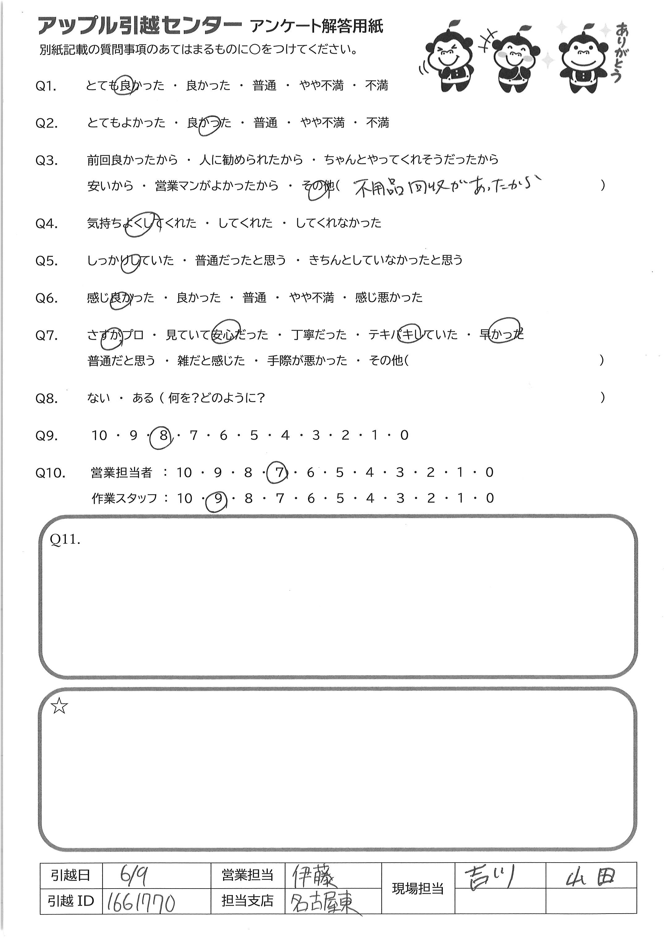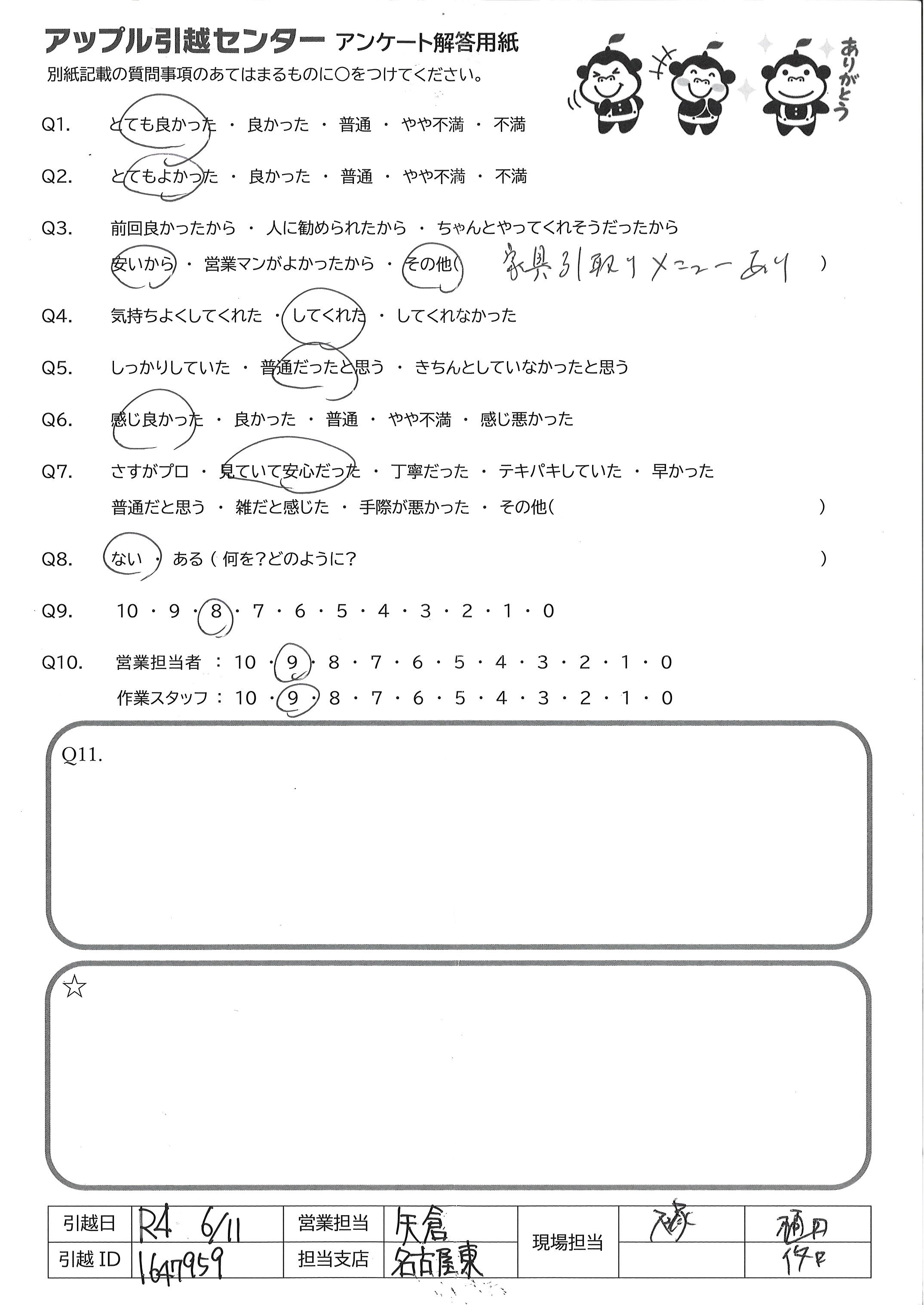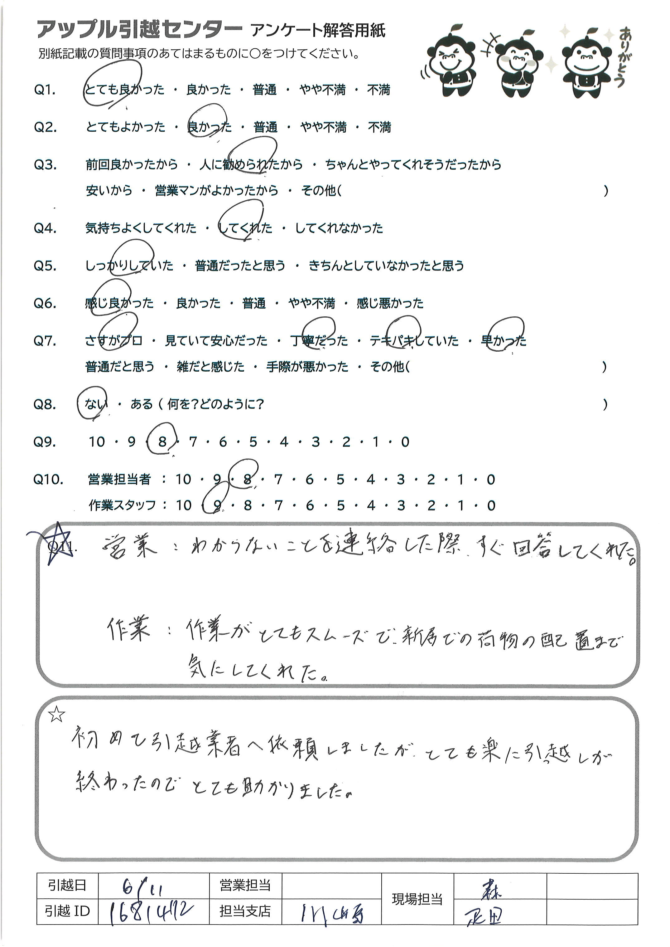 A.営業:わからないことを連絡した際、すぐ回答してくれた 作業:作業がとてもスムーズで新居での荷物の配置まで 気にしてくれた