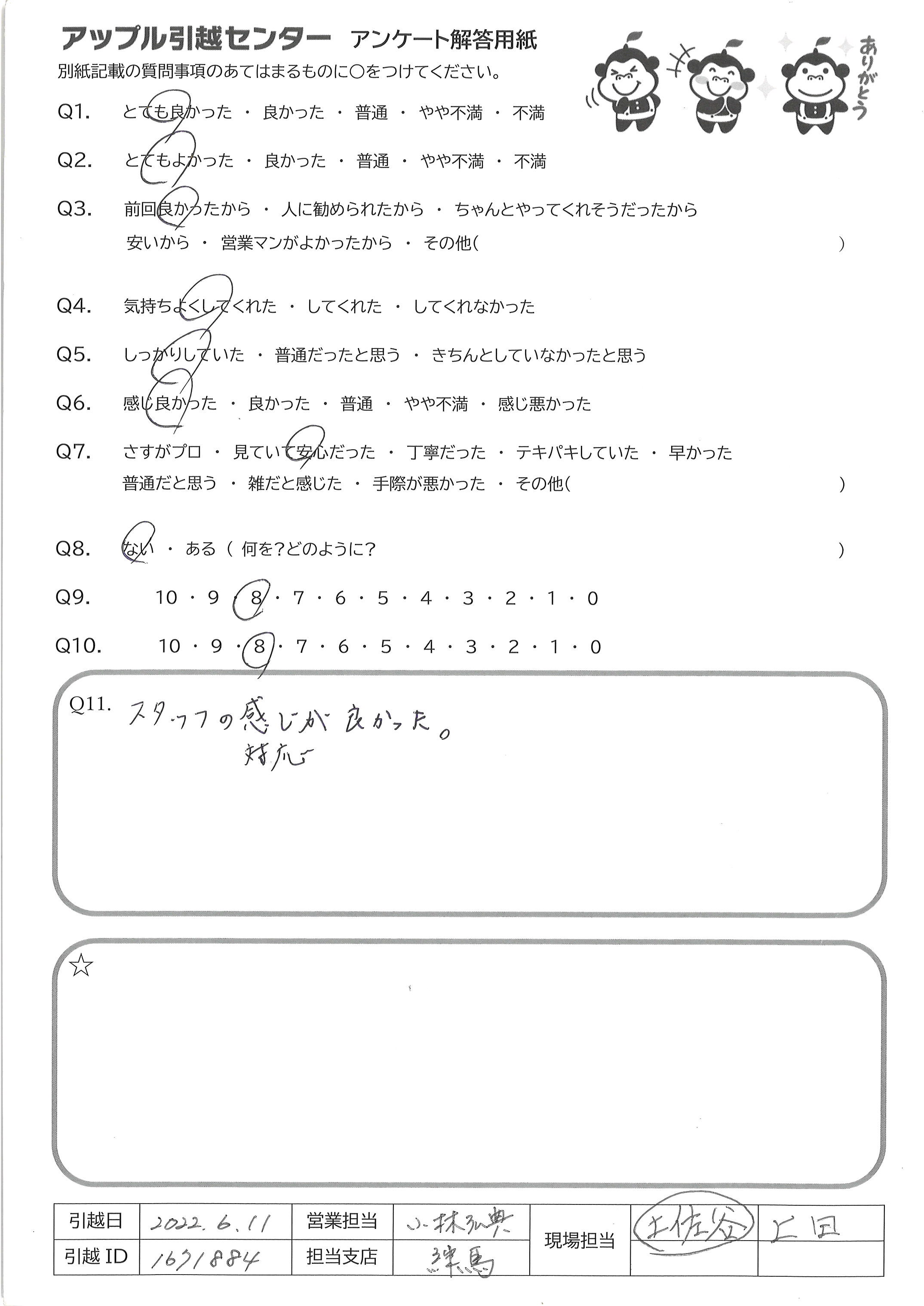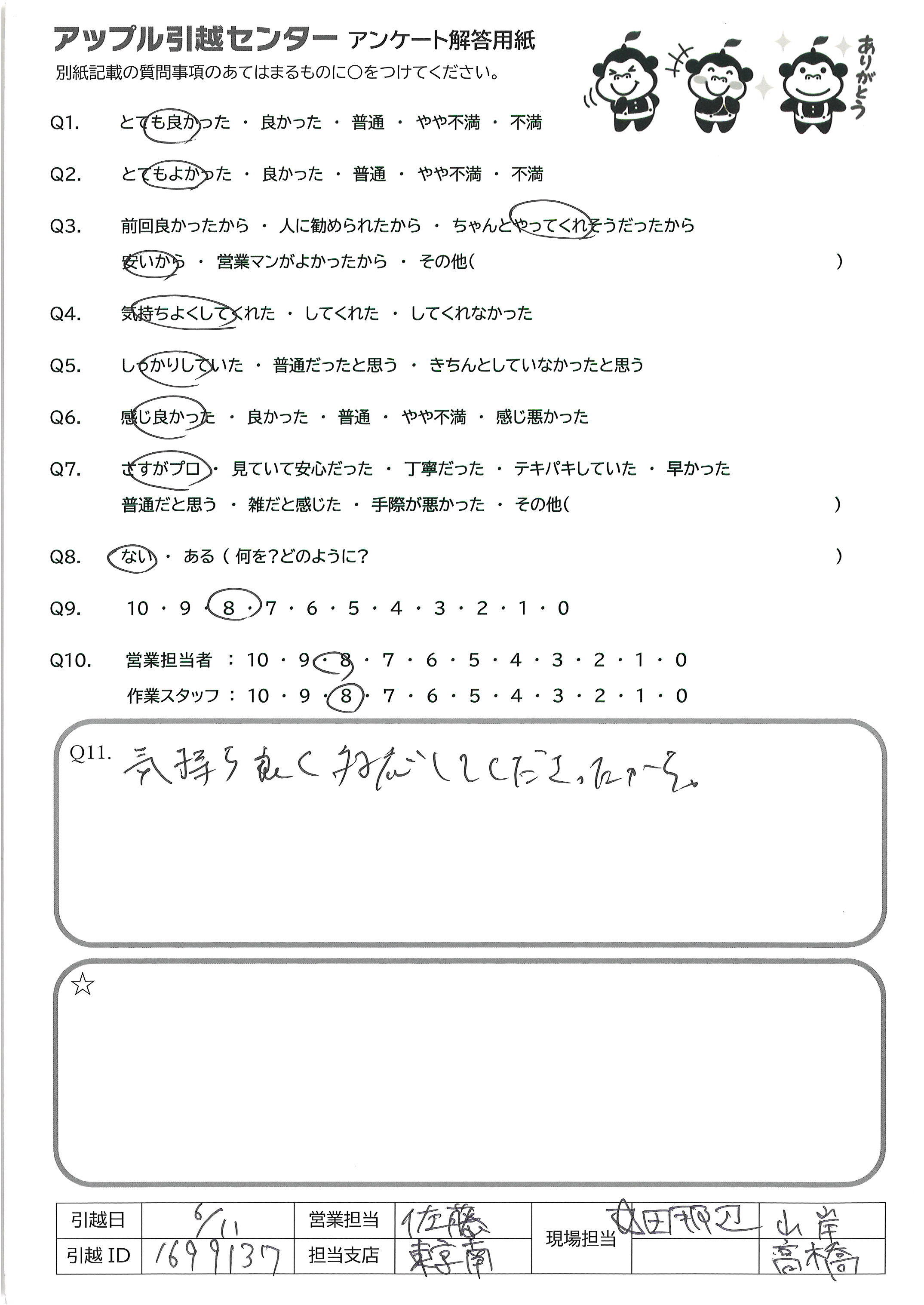 A.手際がとても良く受け答えもしっかりしていていらっしゃったので、 安心感があり、見ていて気持ちの良いお仕事でした! またコールセンターの方の対応もとても丁寧で引越前の不安も ほとんどありませんでした!ご対応いただいた皆様 ありがとうございました!
