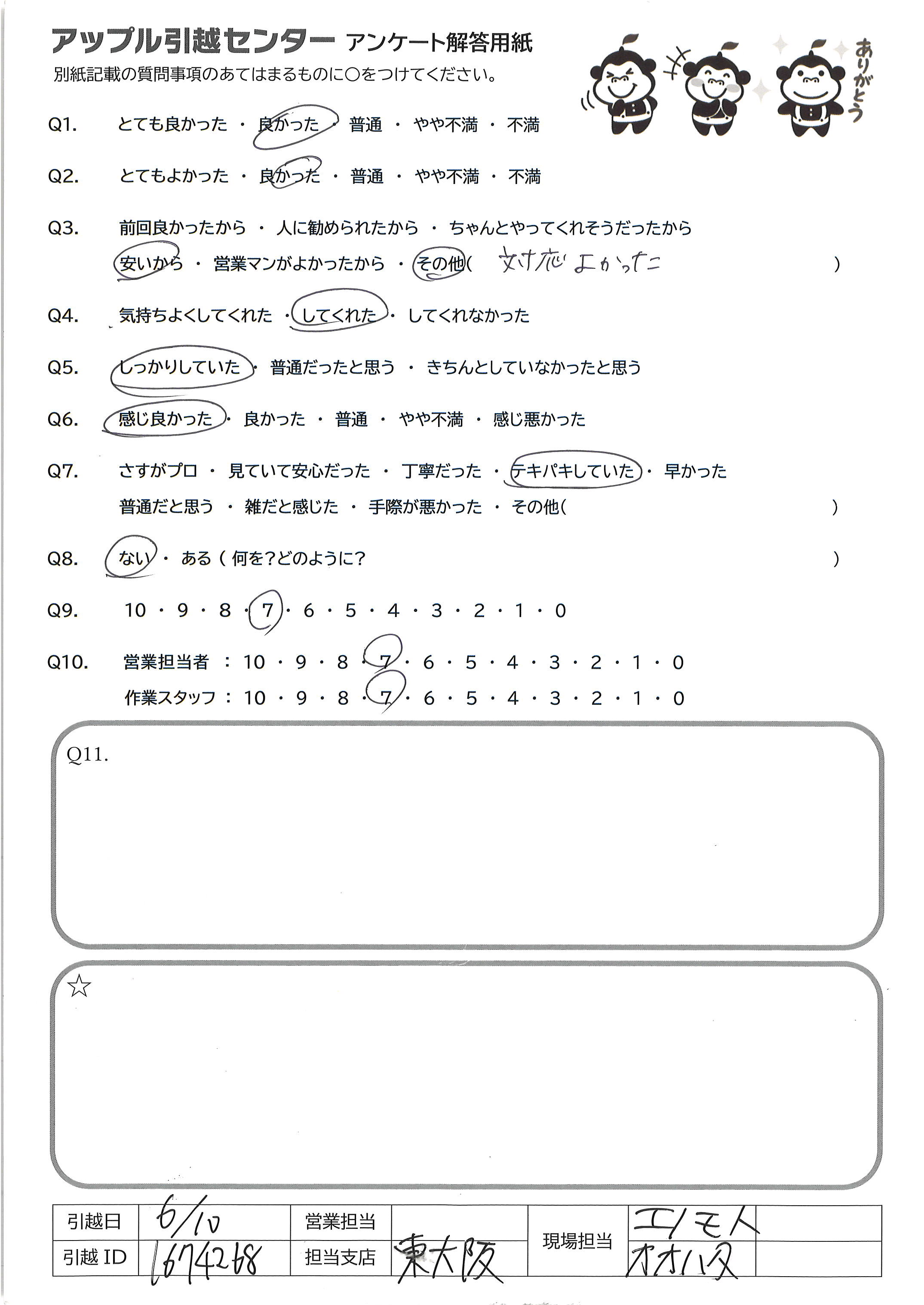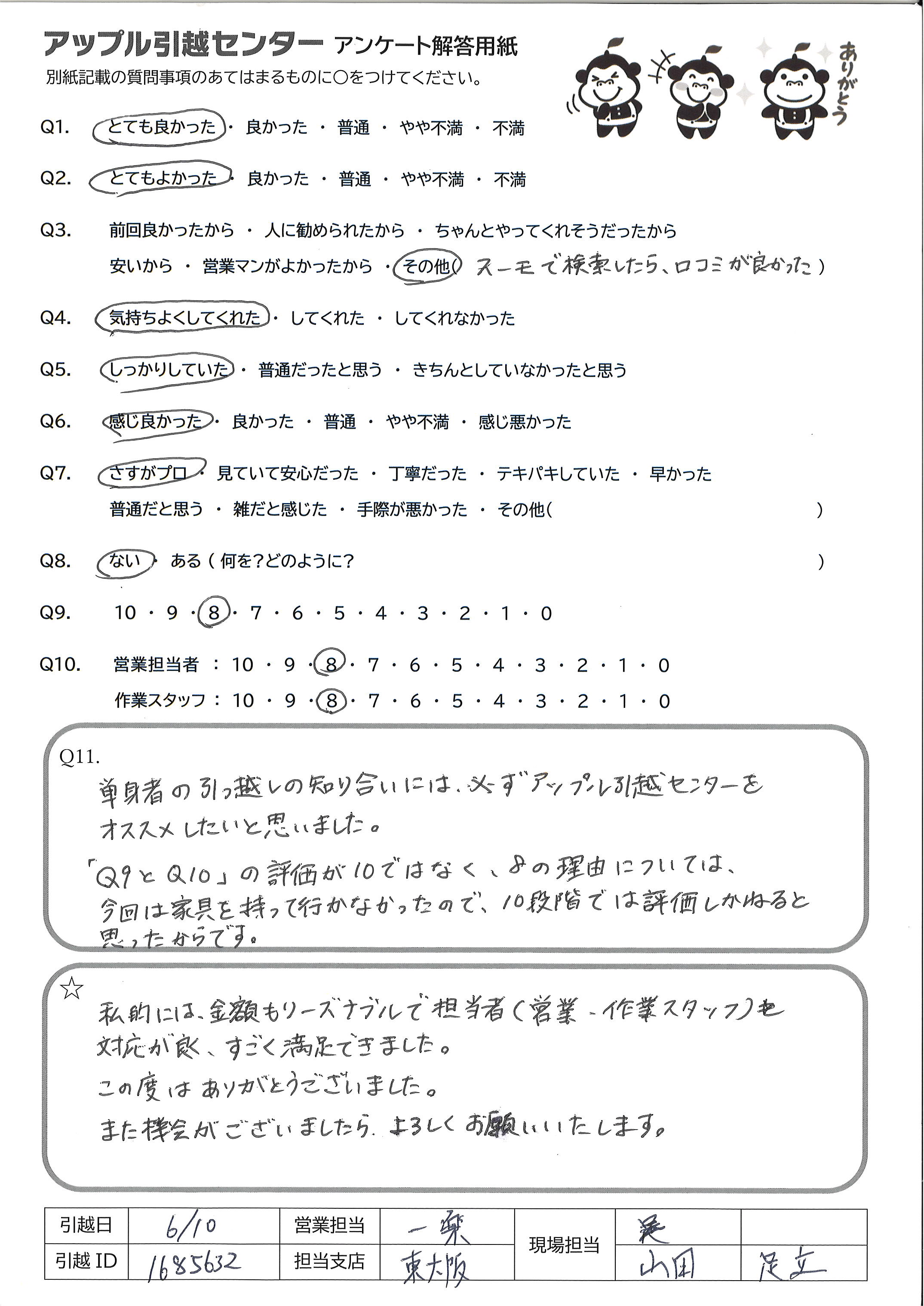 引越し日:2022年06月10日 エリア:大阪府大阪市東成区