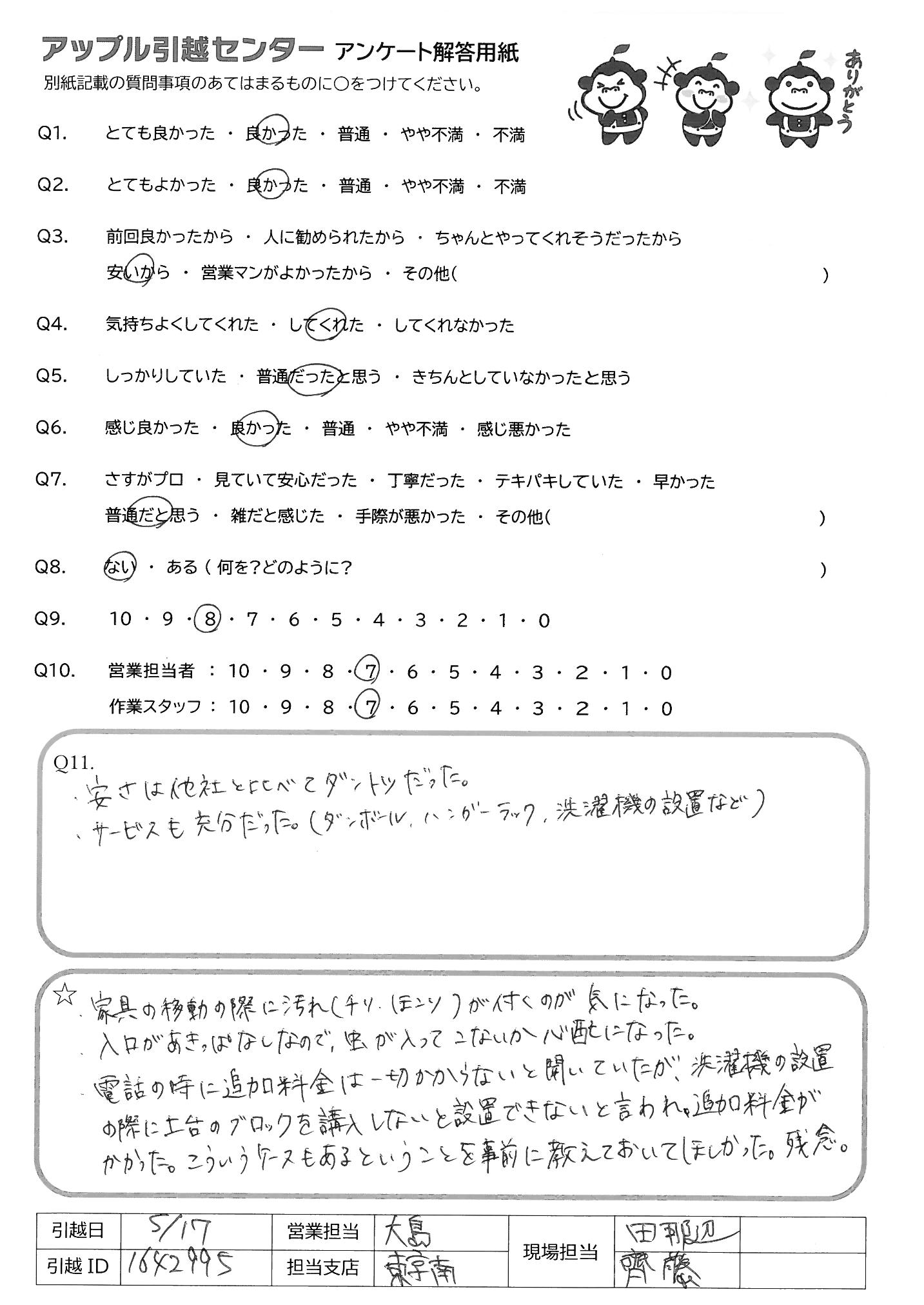 A.家具の移動の際に汚れ(チリ、ほこり)が付くのが気になった 入り口があきっぱなしなので、虫が入ってこないか心配になった。 電話の時に追加料金は一切かからないと聞いていたが、洗濯機の設置 の際に土台ブロックを購入しないと設置できないと言われ、追加料金が かかった。こういうケースもあるということを事前に教えておいてほしかった。残念