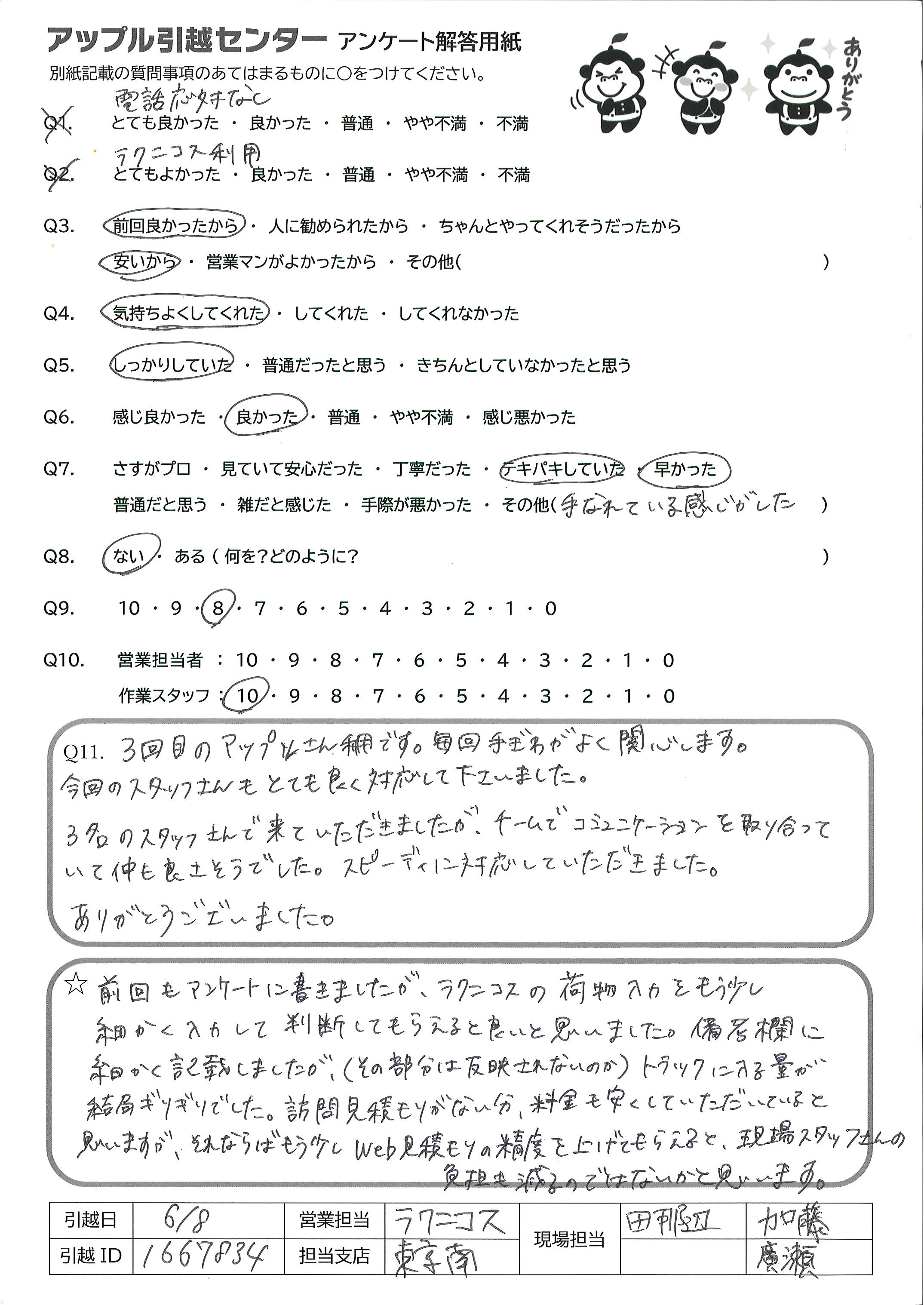 A.3回目のアップルさん利用です。毎回手ぎわがよく聞こえます 今回のスタッフさんもとても良く対応して下さいました 3名のスタッフさんで来ていただきましたが。チームでコミュニケーションを 取り合っていて仲も良さそうでした。スピーディに対応していただきました ありがとうございました