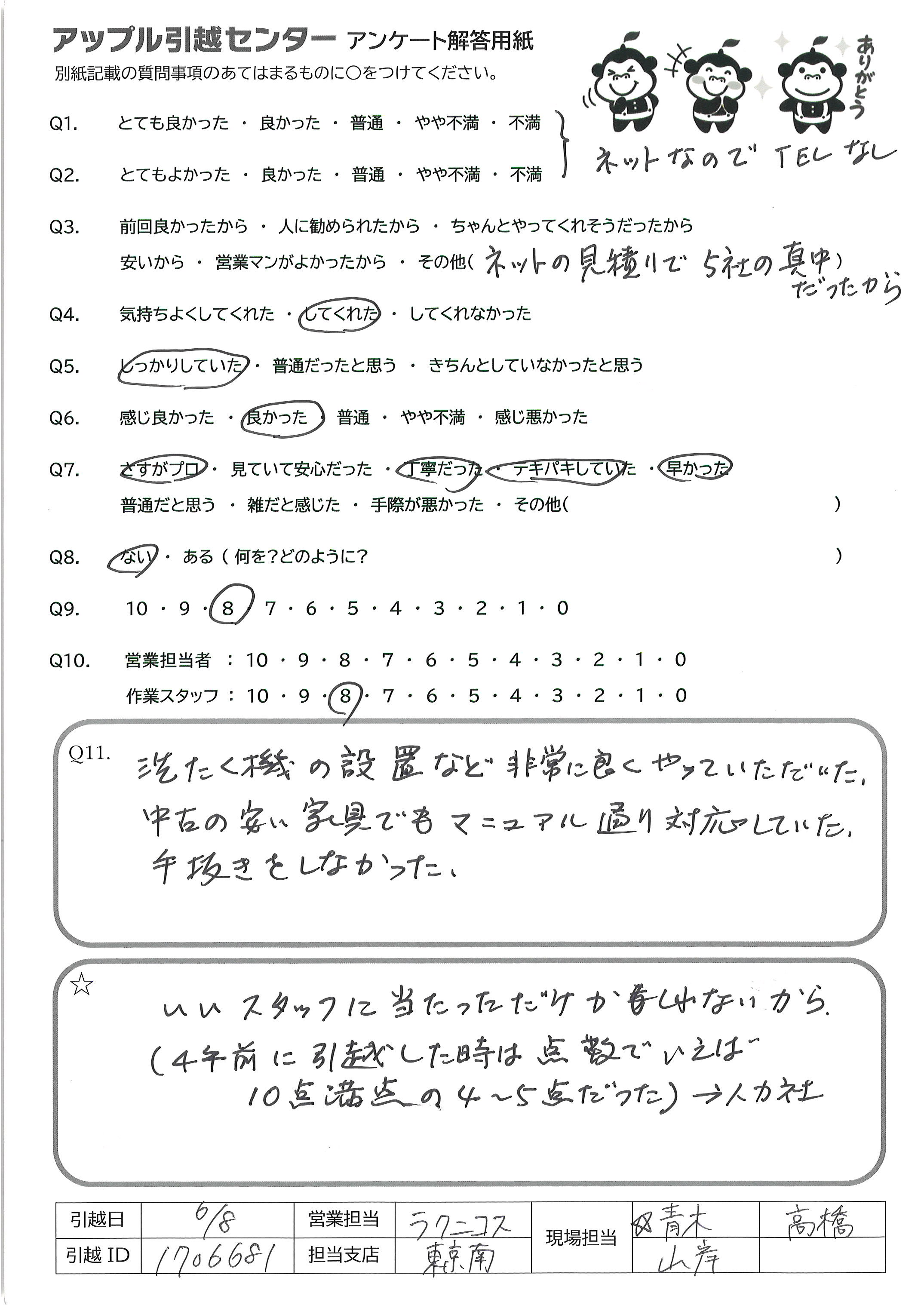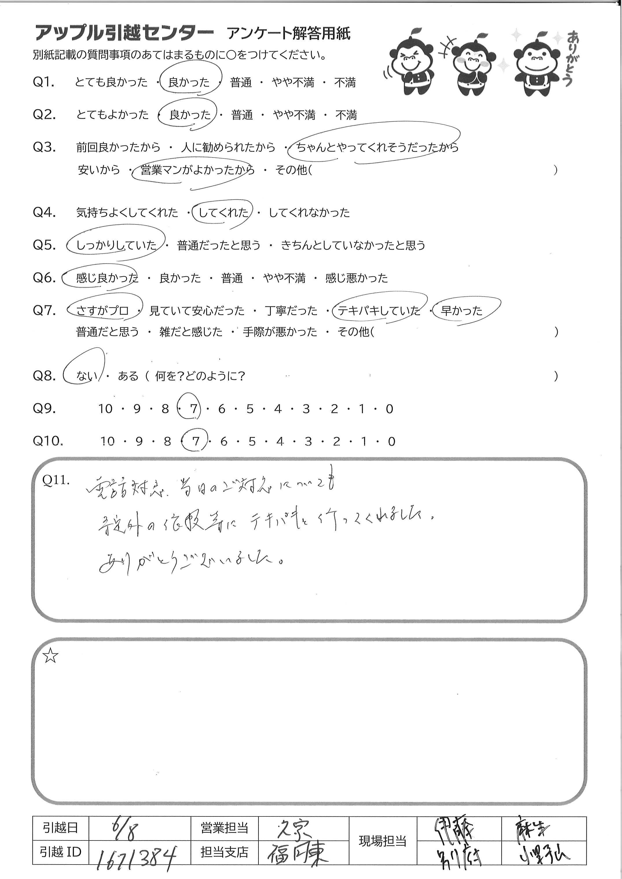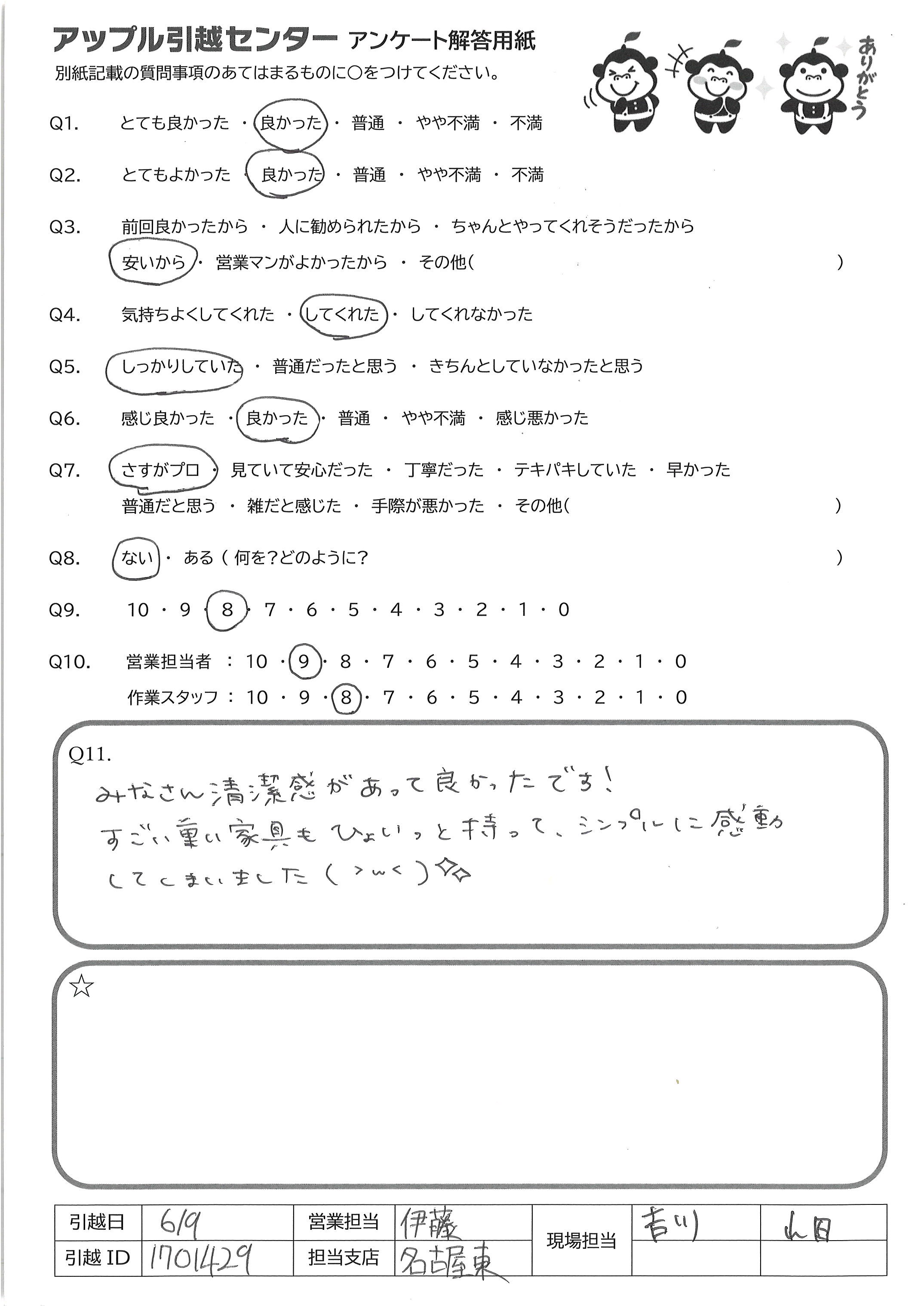 A.感謝しています。 これからも頑張ってほしいです。 まえから引越しはなんかいも経験してるので大変だと思います。 慣れだ感じで手早くして頂きました。