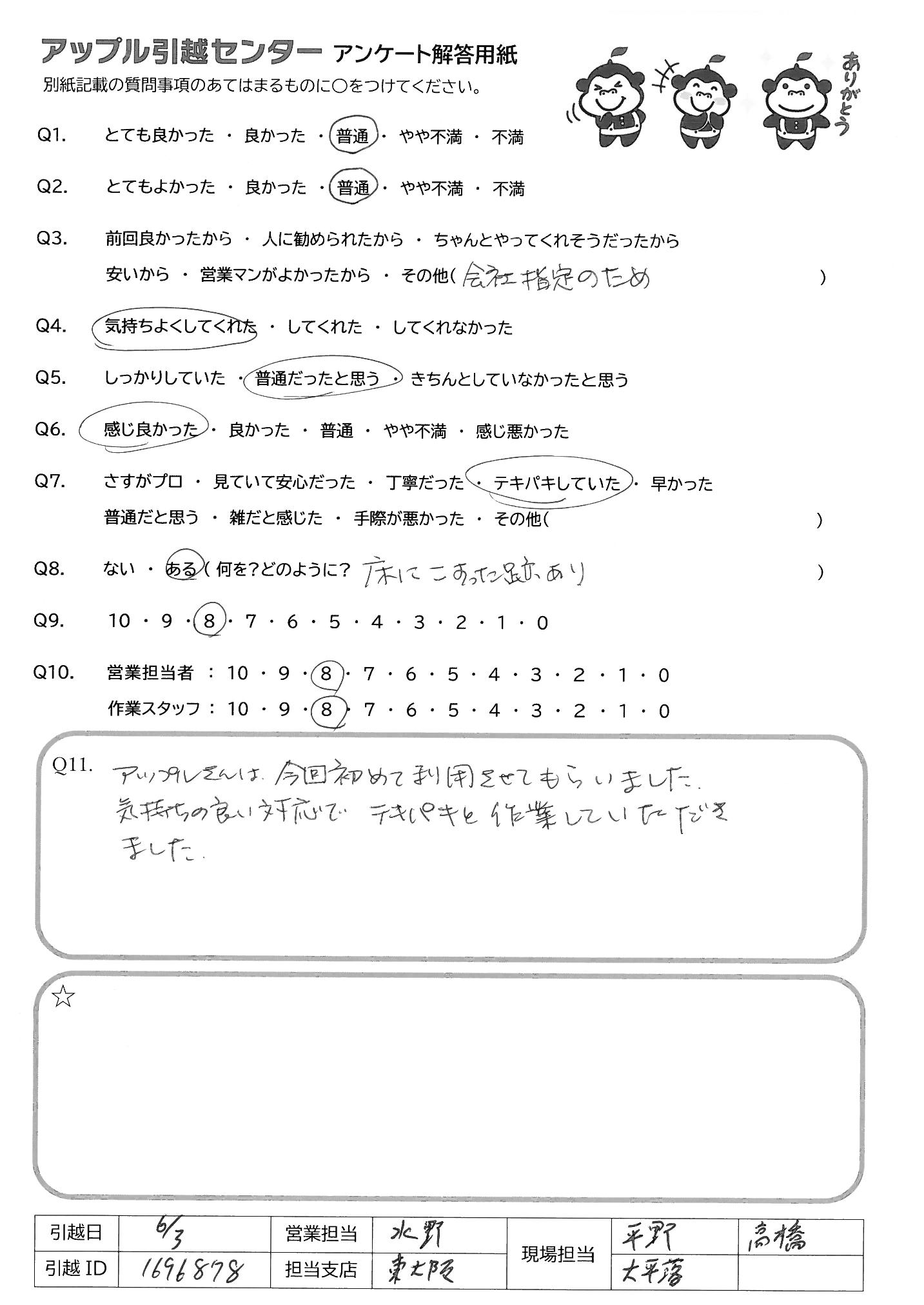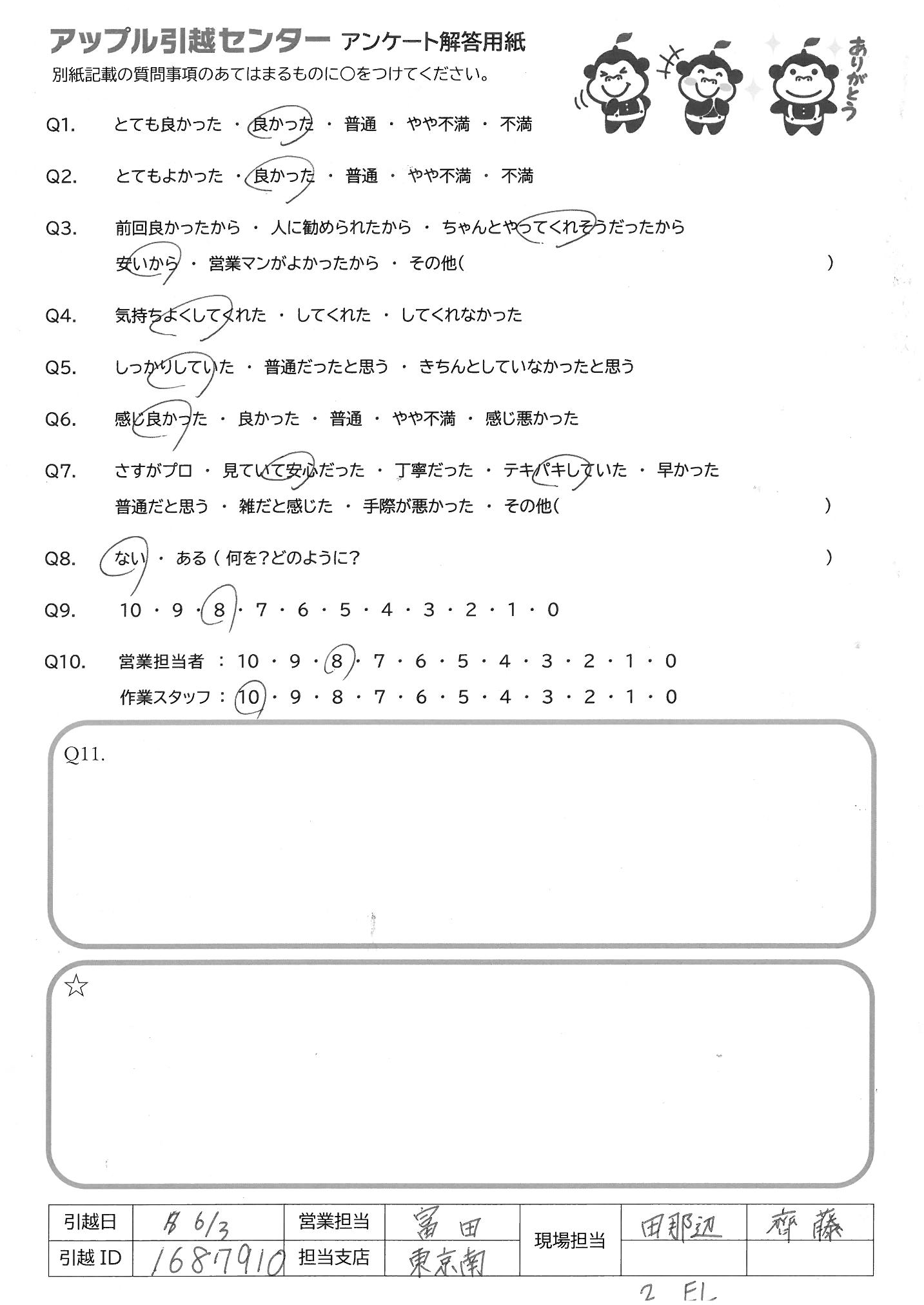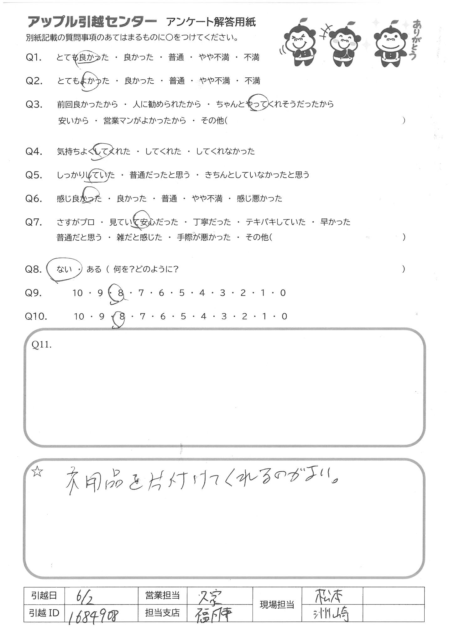 A.今回、同じマンション内での移動だったのですが、すごくスムーズに進めて くれて助かった。他社より対応もよく、お安くしていただいて助かった 利用して良かった。また利用したい