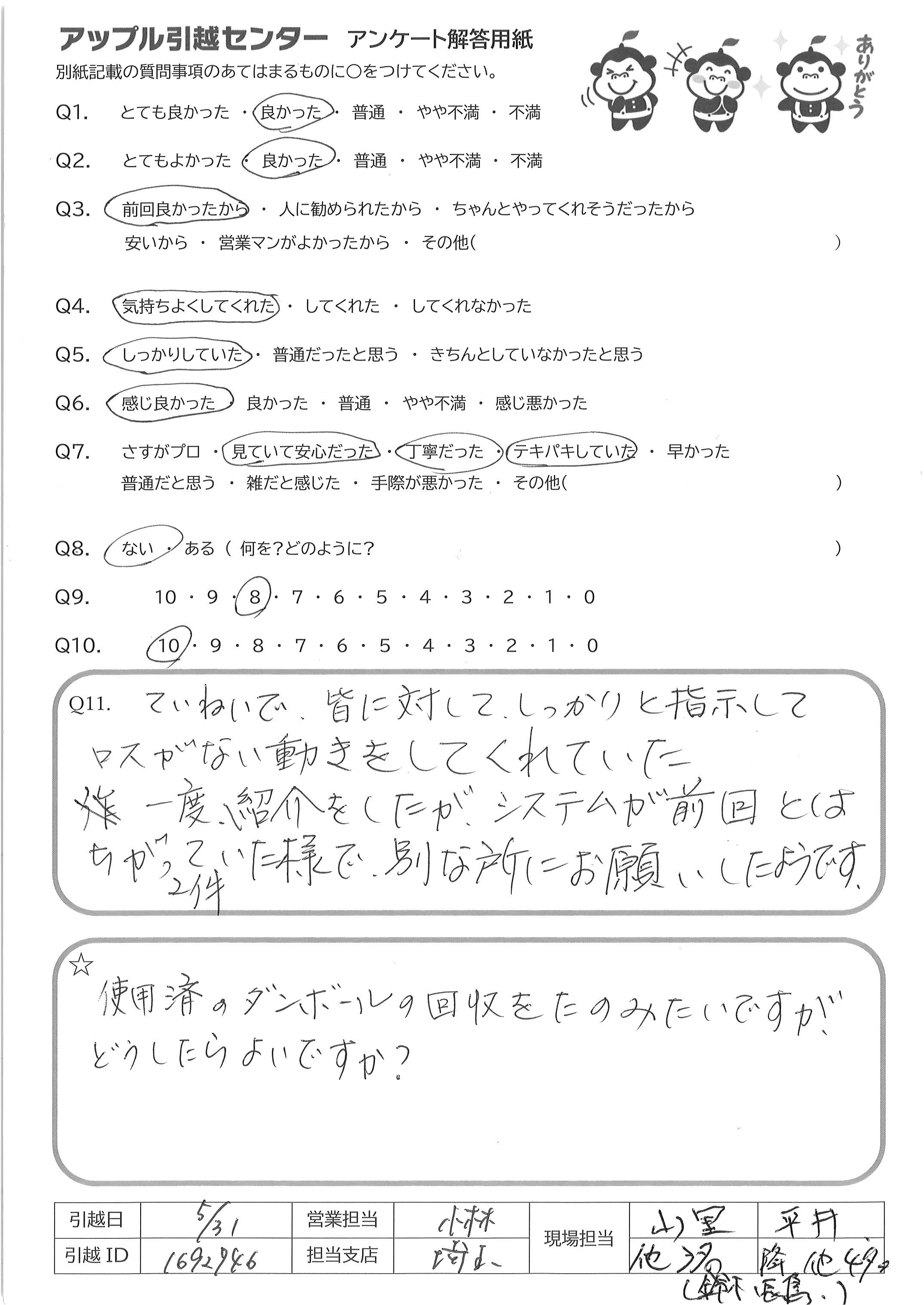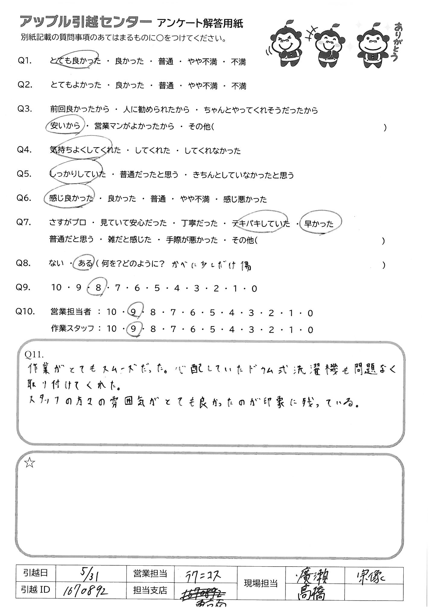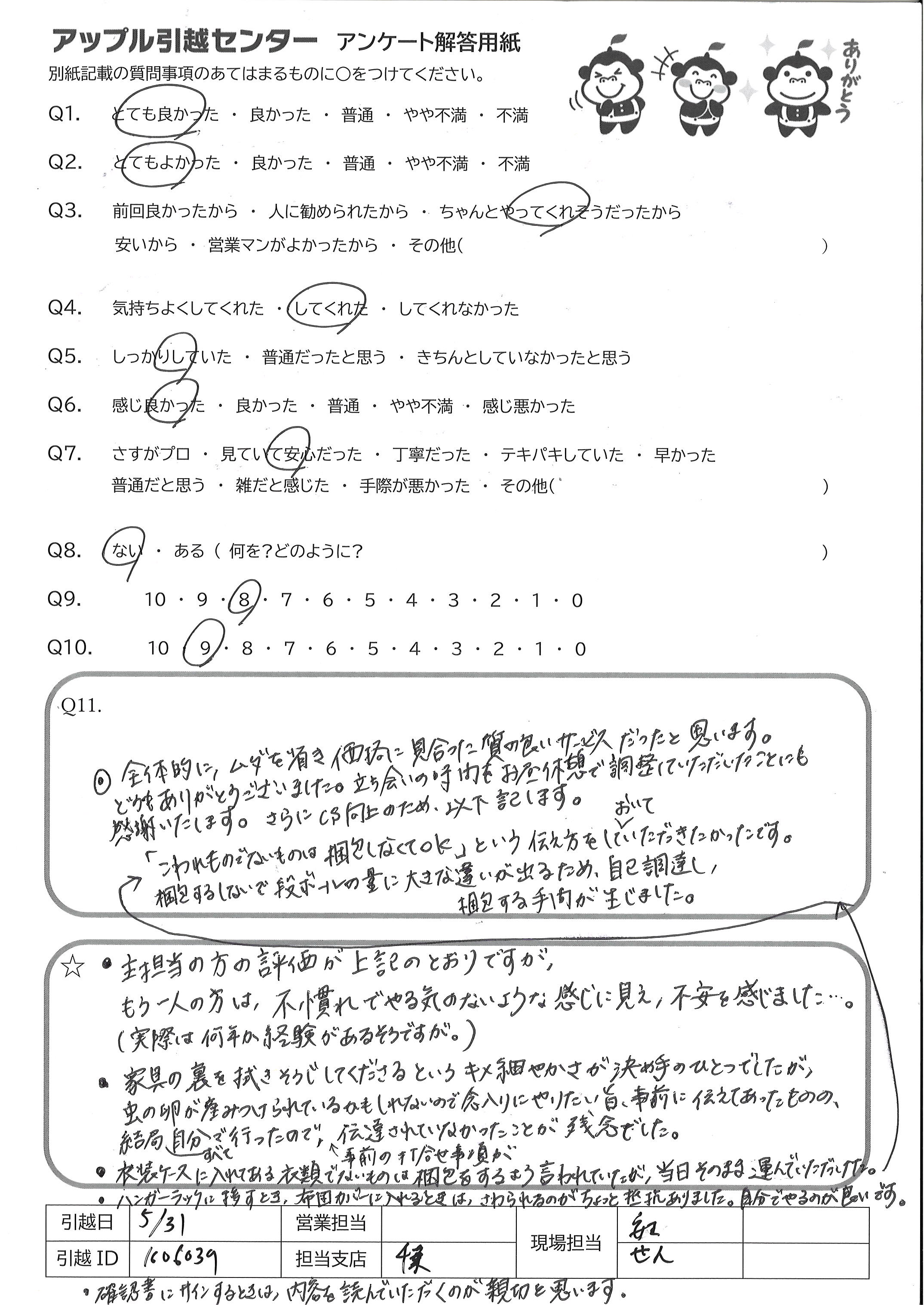 A.Q9→全体的には良かったと思います。作業が始まった際、トラックの置き方で(停め方) こちらの意見を汲んでもらえず、大丈夫かと心配になりましたが それ以降はスムーズにしていただけましたし、良かったと思います Q10→今回、引越業者に頼む事自体、初めてでしたので、できればお2人ともベテランの 方ならより安心でした。こちらも業者さんとのやりとりに慣れない中、業者さんの 1人が新人さんと思われる方でしたので、少し、心元なかったのが正直なところです。 (それでも一生けん命作業して下さっていたのは、すごく見てわかりましたが、あくまで 安心感の面での意見です)