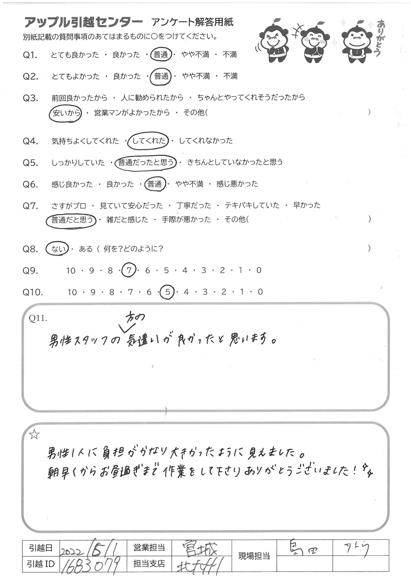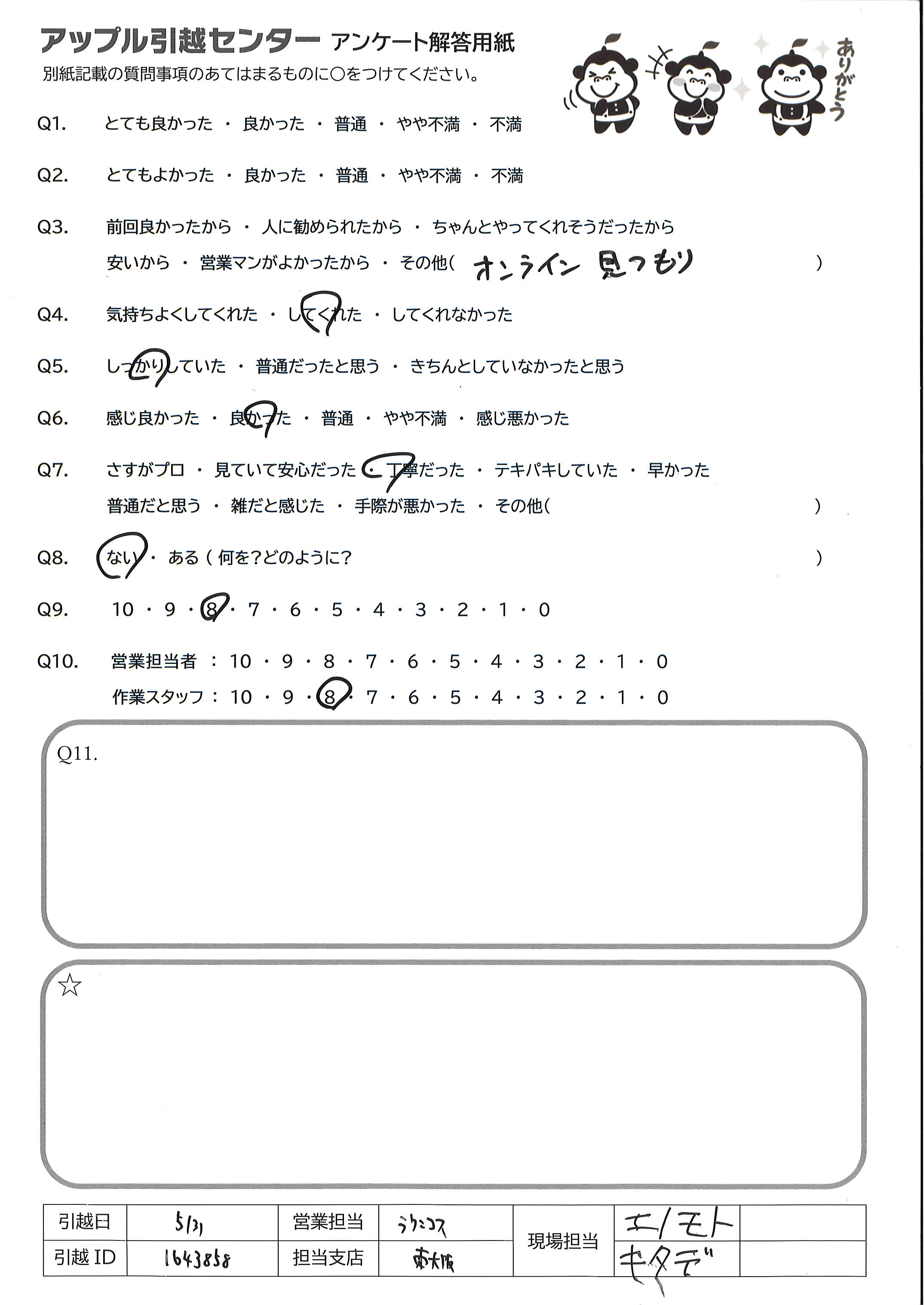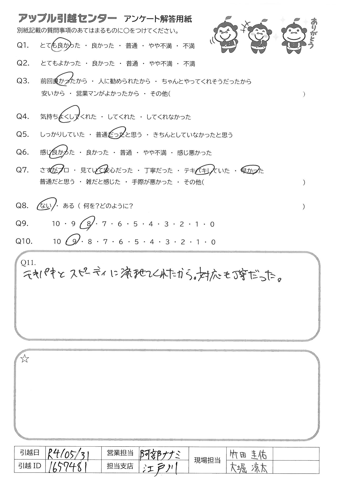 A.Q9→全体的には良かったと思います。作業が始まった際、トラックの置き方で(停め方) こちらの意見を汲んでもらえず、大丈夫かと心配になりましたが それ以降はスムーズにしていただけましたし、良かったと思います Q10→今回、引越業者に頼む事自体、初めてでしたので、できればお2人ともベテランの 方ならより安心でした。こちらも業者さんとのやりとりに慣れない中、業者さんの 1人が新人さんと思われる方でしたので、少し、心元なかったのが正直なところです。 (それでも一生けん命作業して下さっていたのは、すごく見てわかりましたが、あくまで 安心感の面での意見です)