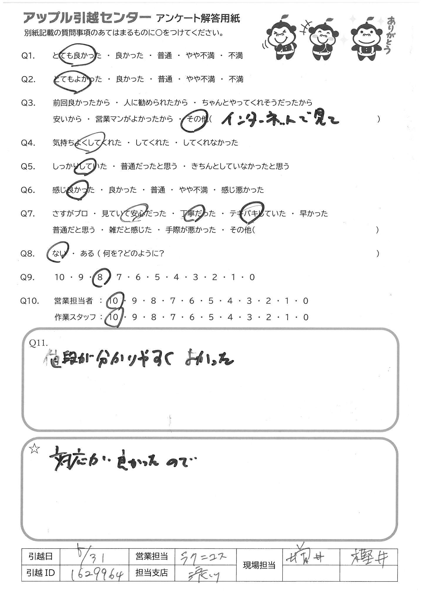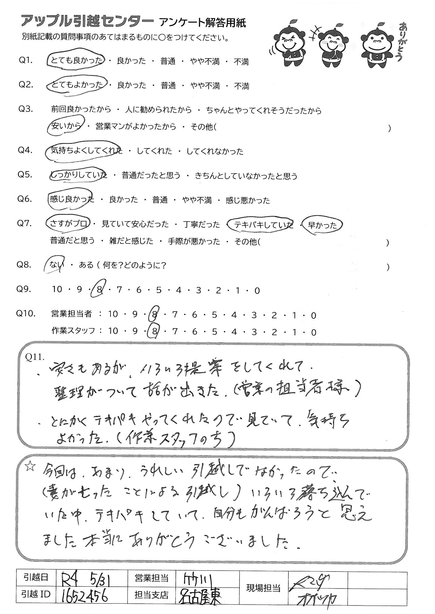 A.今回は、あまり、うれしい引越しではなかったので (妻が亡くなったことによる引越し)いろいろ落ち込んで いた中、テキパキしていて自分もがんばろうと思え ました。本当にありがとうございました