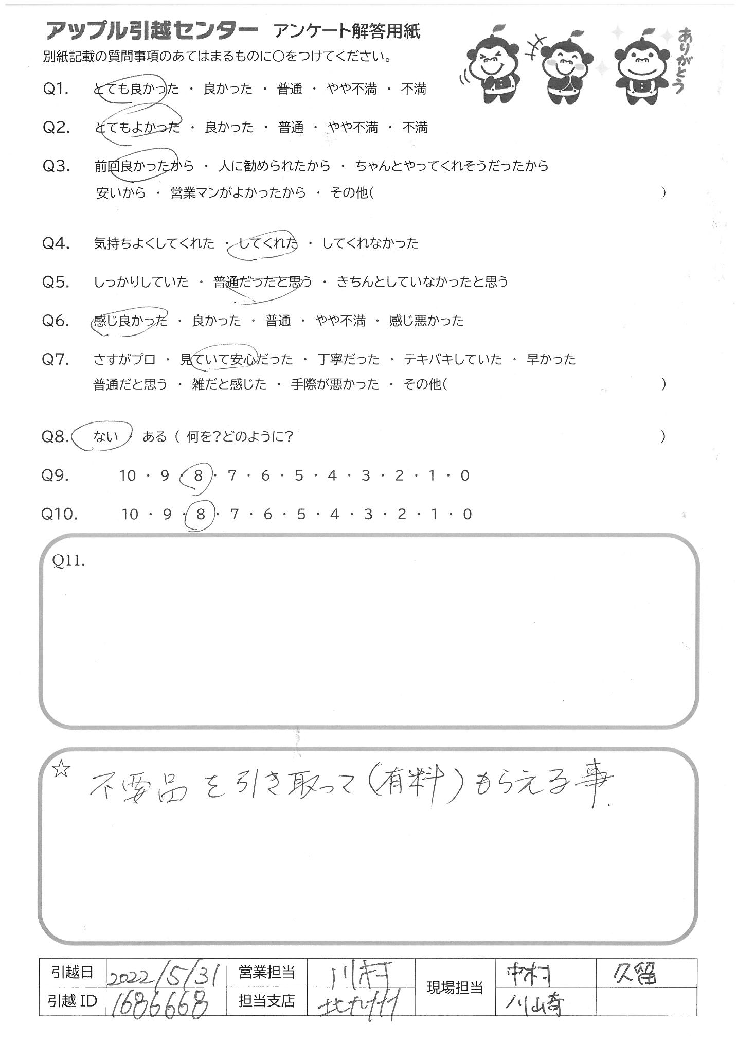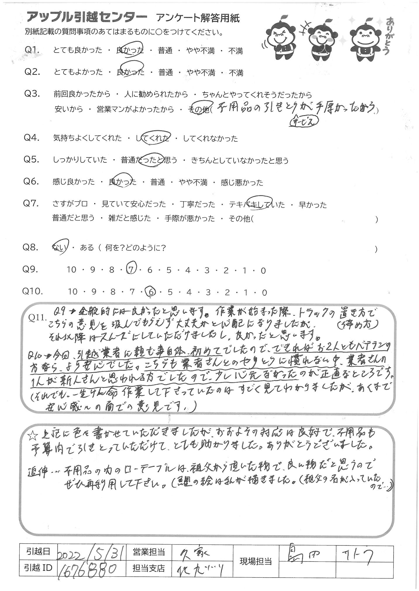 A.上記に色々書かせていただきましたが、おおよその対応は良好で、不用品も 予算内で引き取っていただけて、とても助かりました。ありがとうございました 追伸・・不用品の内のローテーブルは祖父から引き継いだもので良い物だと思うので ぜひ、再利用して下さい(鯉の絵は私が描きました。(祖父の名が入っていたので)