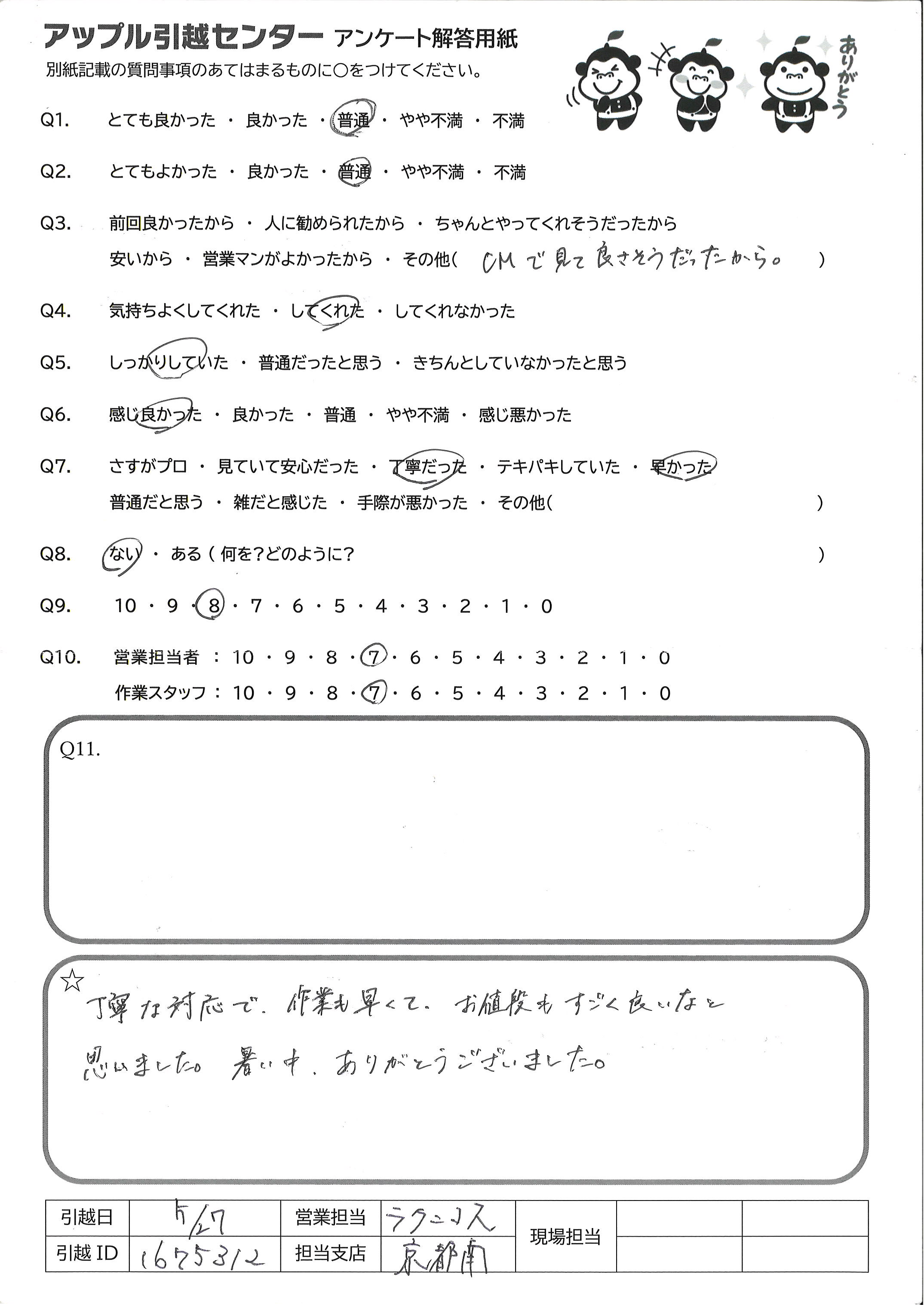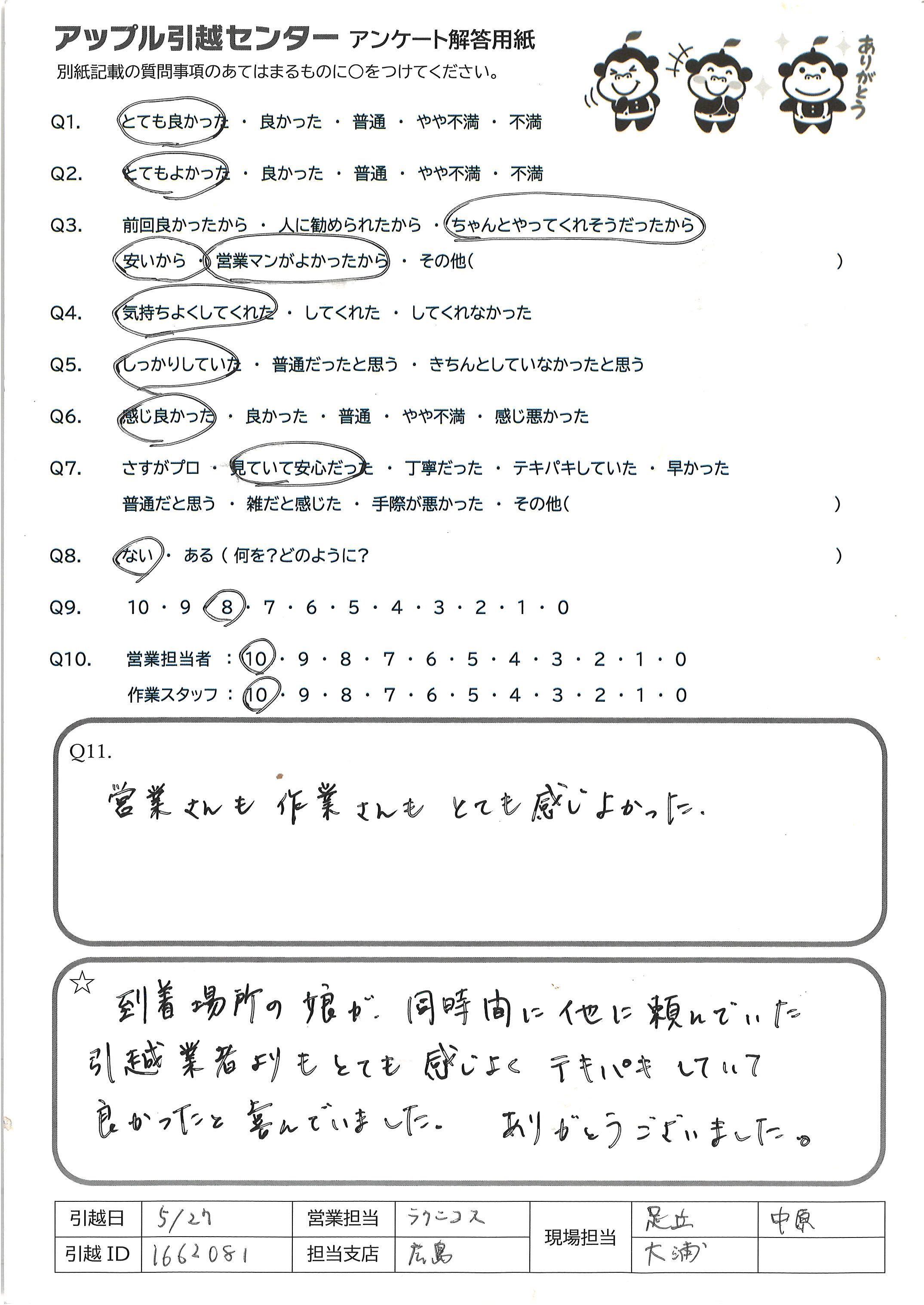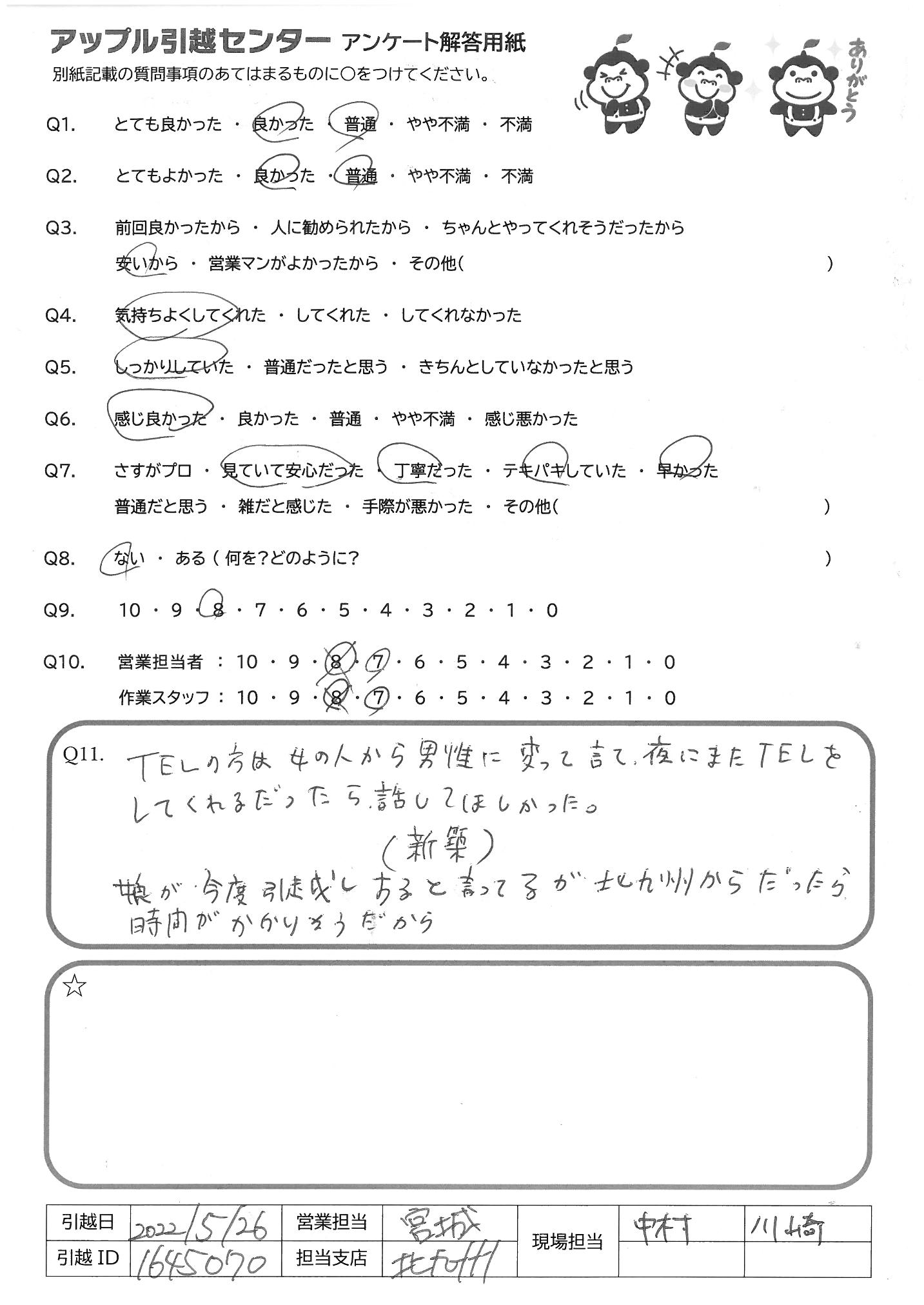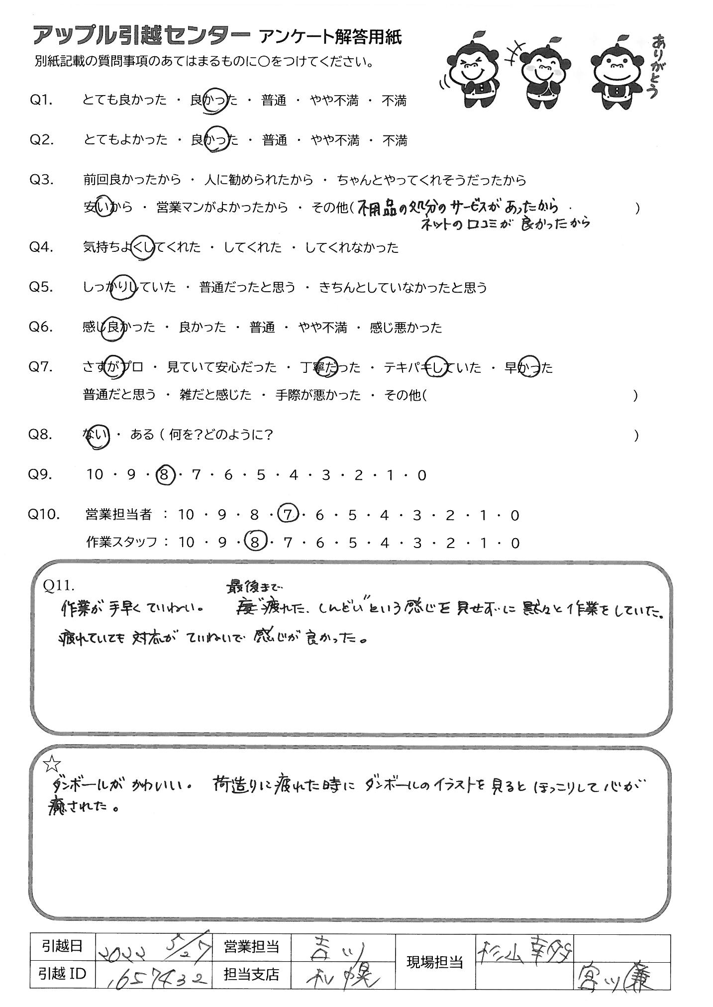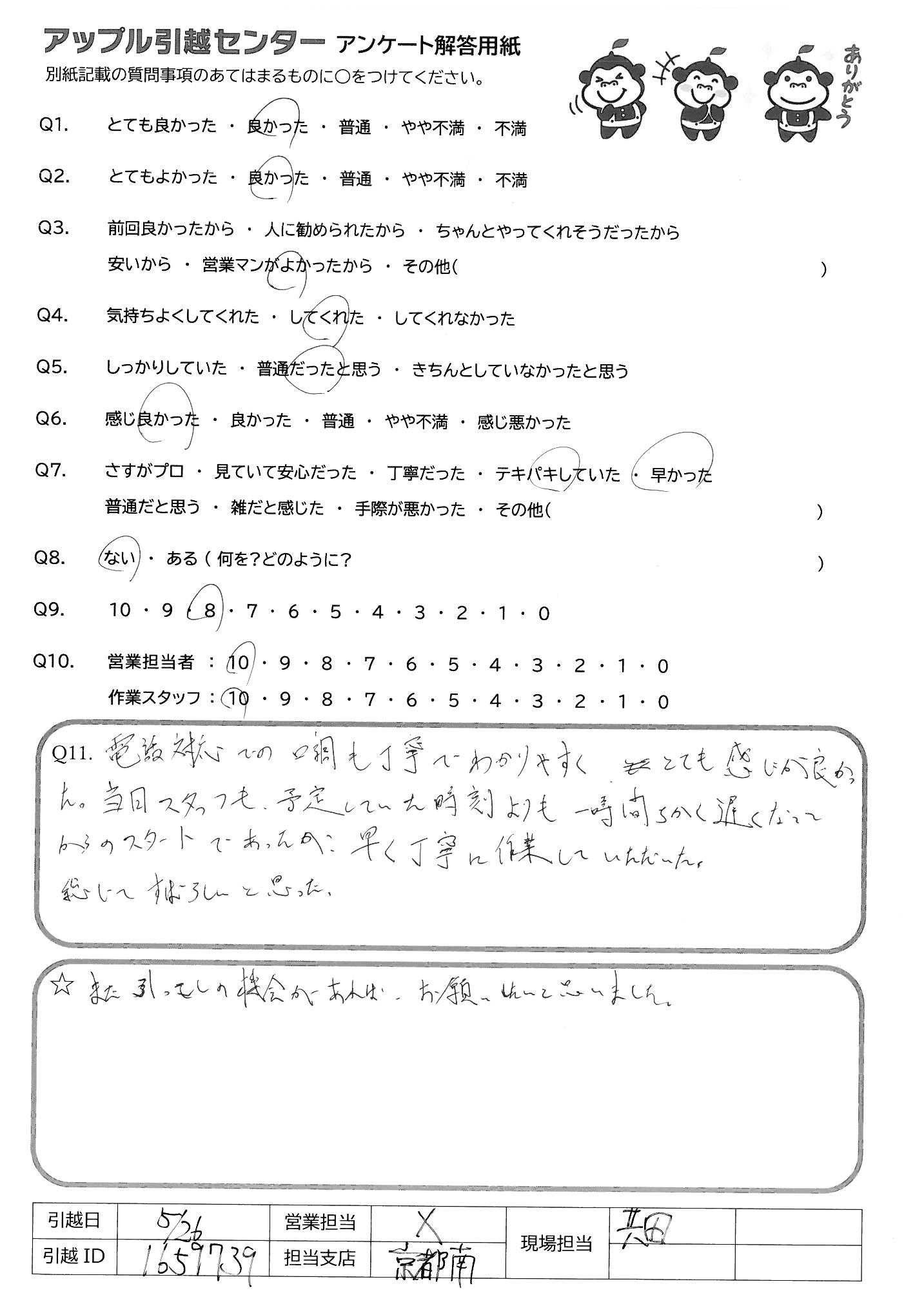 A.到着場所の娘が同時間に他に頼んでいた 引越業者よりもとても感じよくテキパキしていて 良かったと喜んでいました。ありがとうございました
