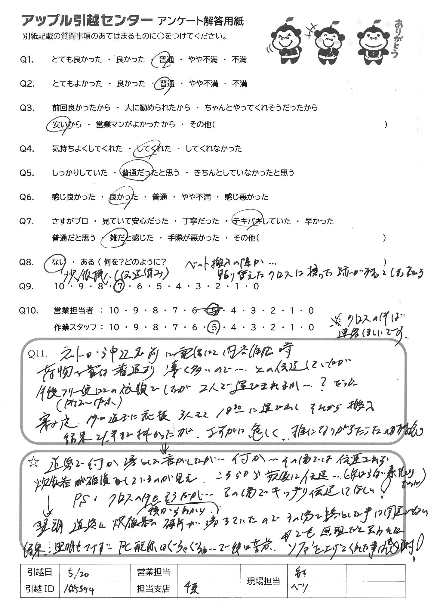 A.ネットから申し込みむ前に電話にて内容確認の時 荷物の量は普通より凄く多いので・・・との伝達していたが 午後フリー運の依頼でしたが2人で運びきれるか・・・・?だった 案の定、17:00過ぎに応援3人きて18:30に運び出しそれから搬入 結果21半まで掛ったが、さすがに危しく、雑になりがちだったのが残念
