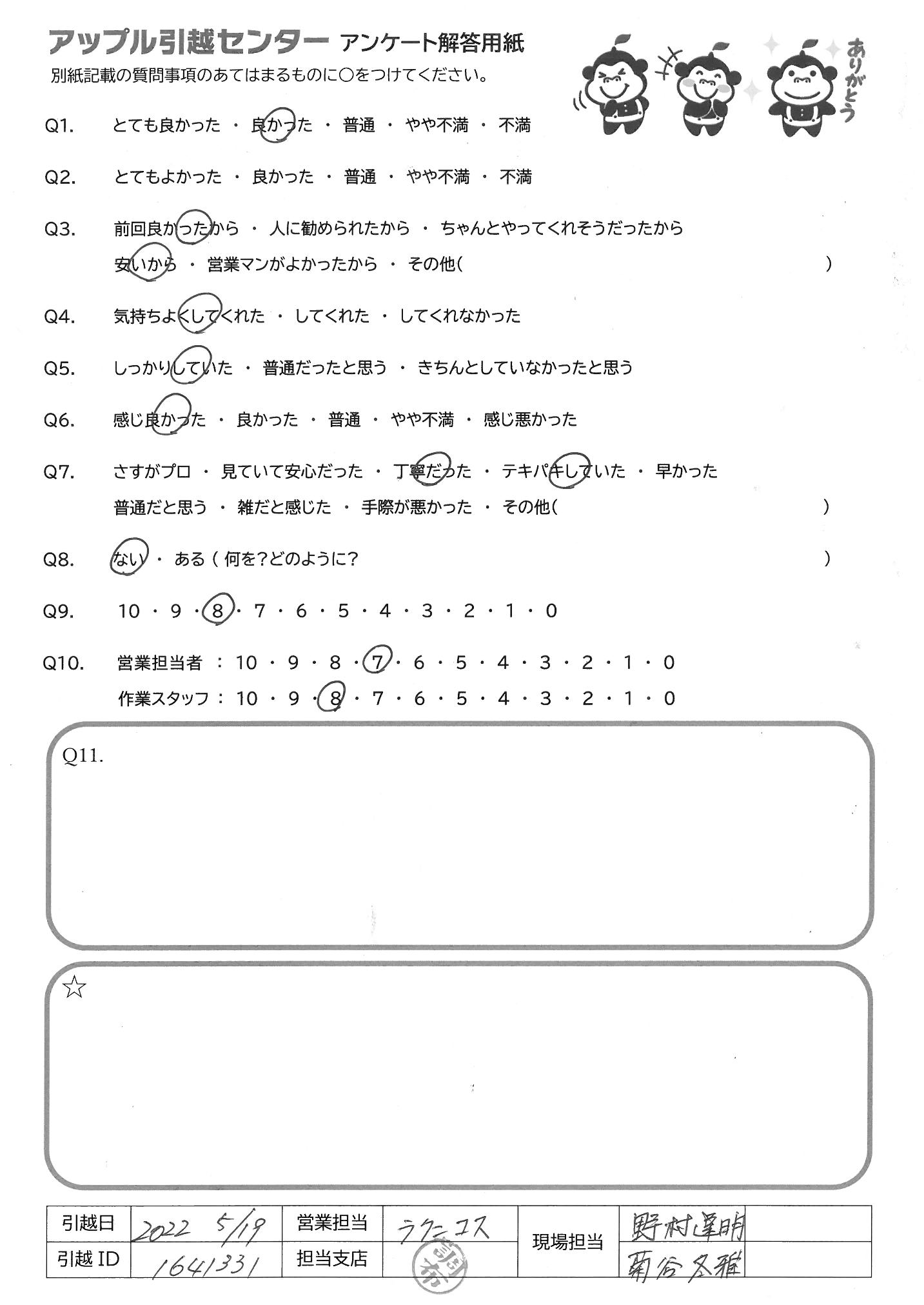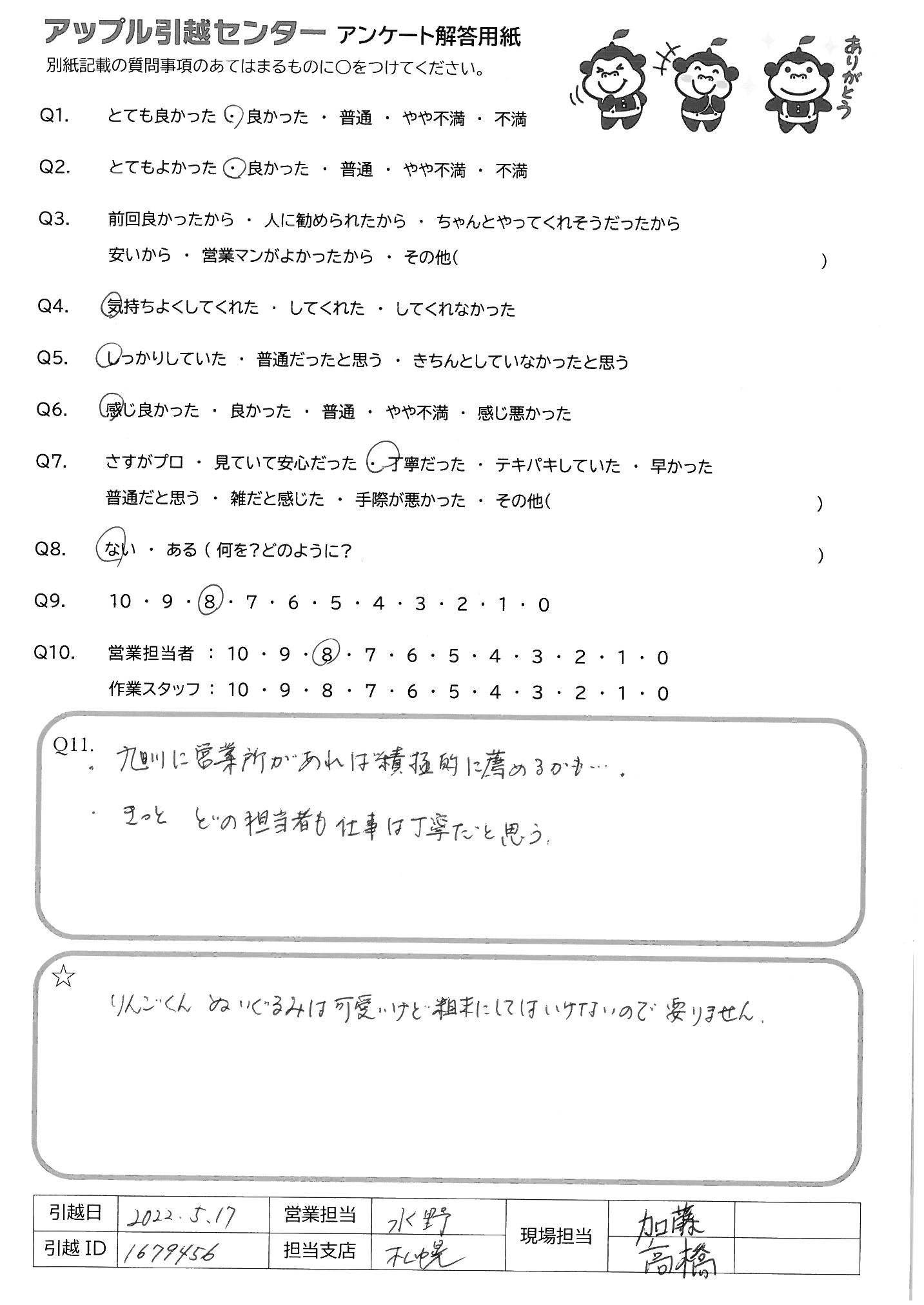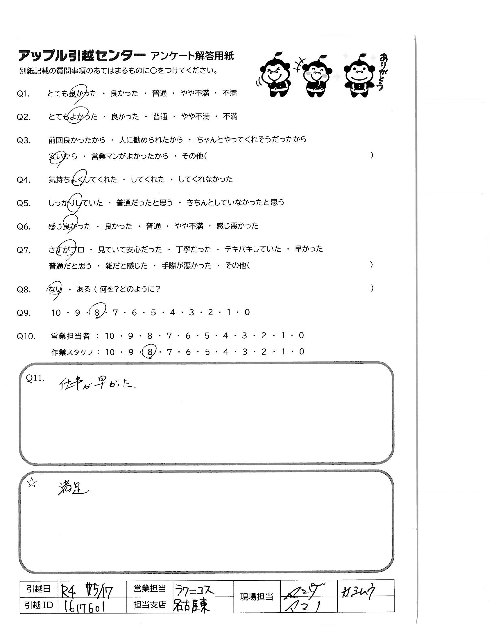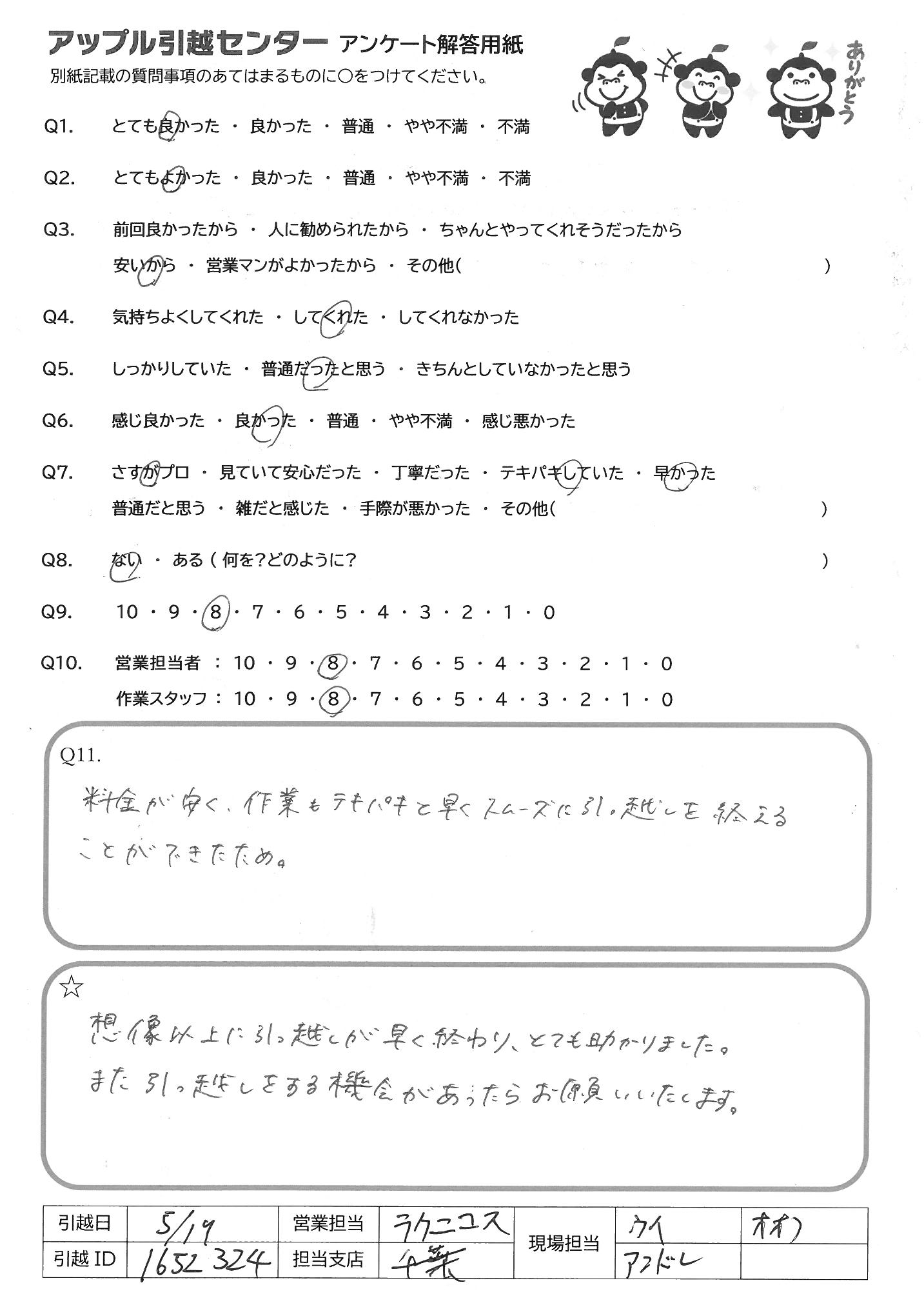 A.作業も早く安心してお任せできました。 もし引っ越すことがありましたら、またお願いいたします。