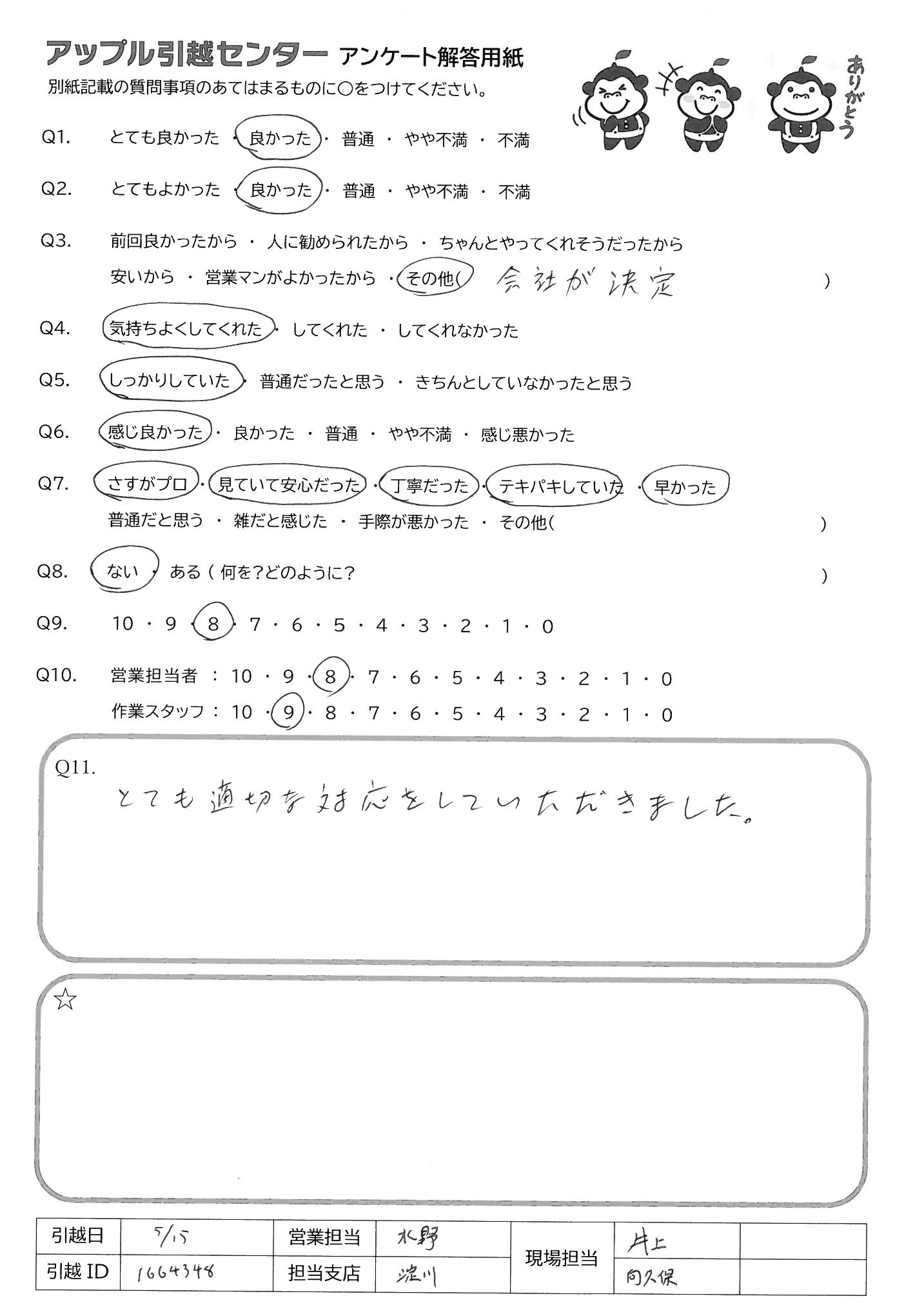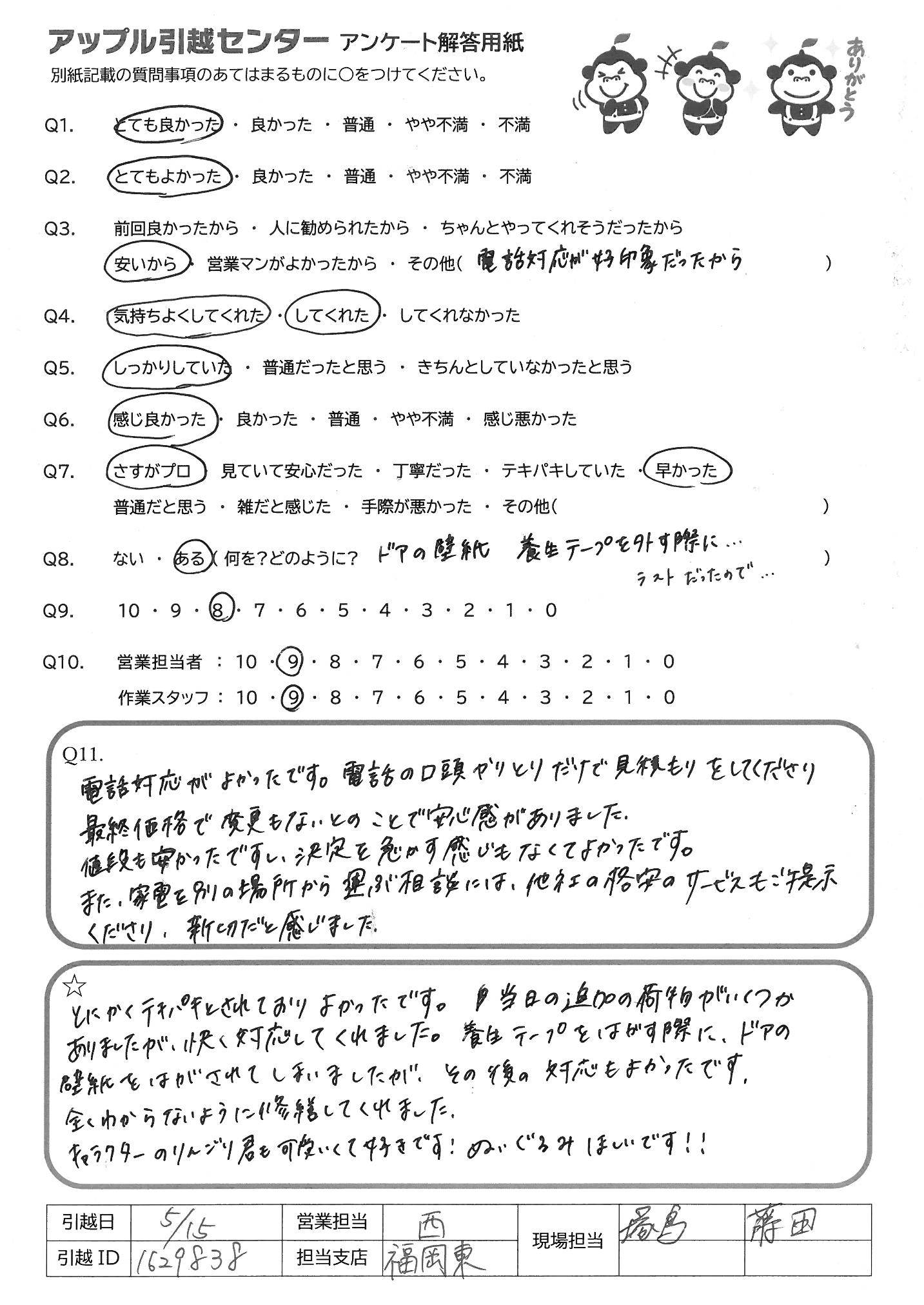 A.とにかくテキパキとされておりよかったです。当日の追加の荷物がいくつか ありましたが快く対応してくれました。養生テープをはがす際に、ドアの 壁紙をはがされてしまいましたがその後の対応もよかったです 全くわからないように修繕してくれました。 キャラクターのりんごり君も可愛くて好きです!ぬいぐるみほしいでです!!