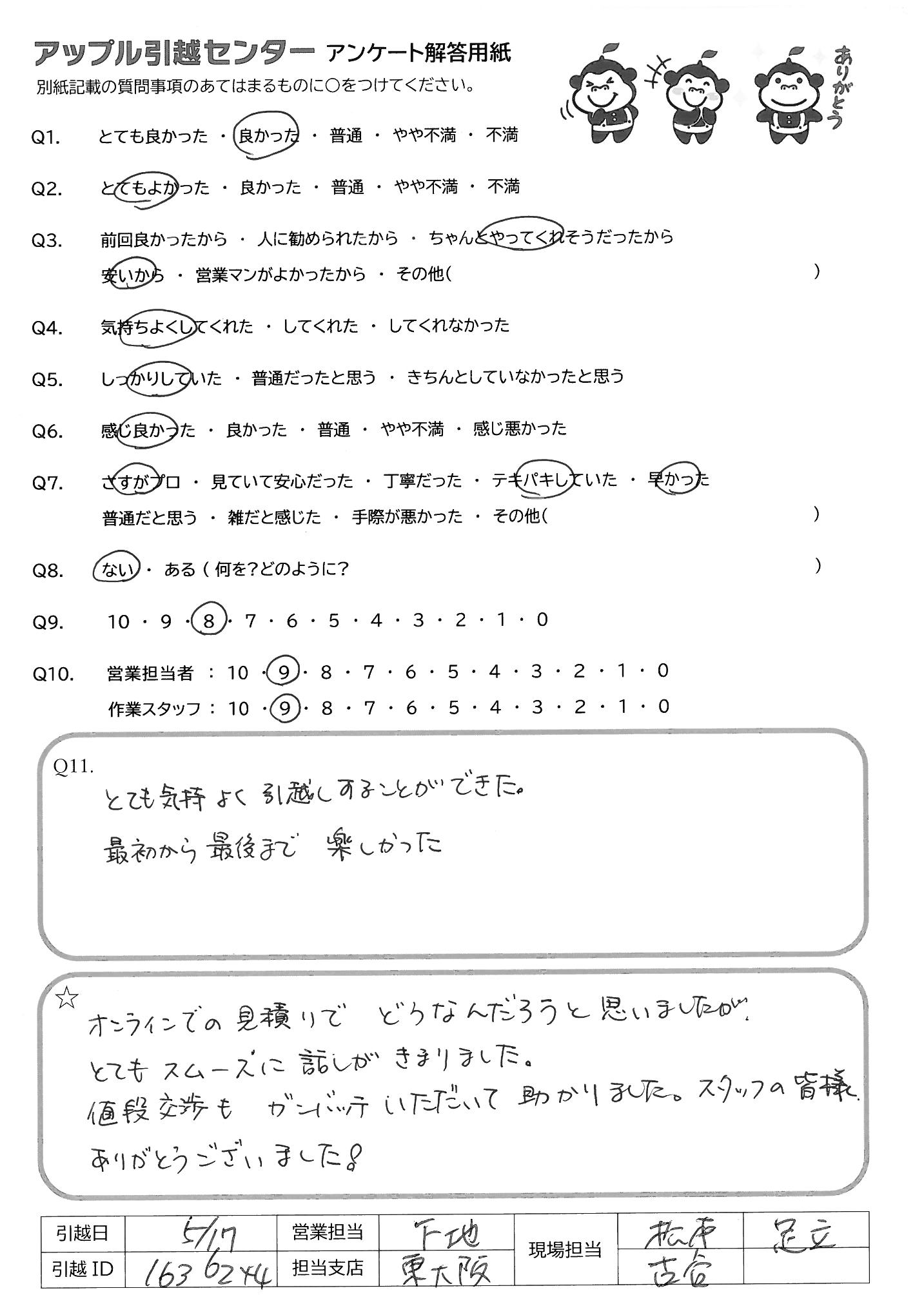 引越し日:2022年05月15日 エリア:大阪府大阪市東淀川区