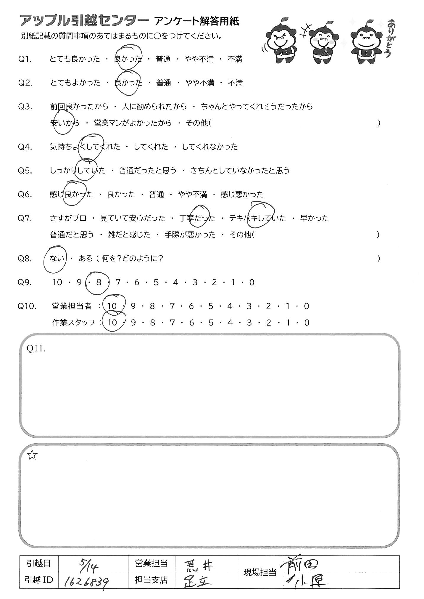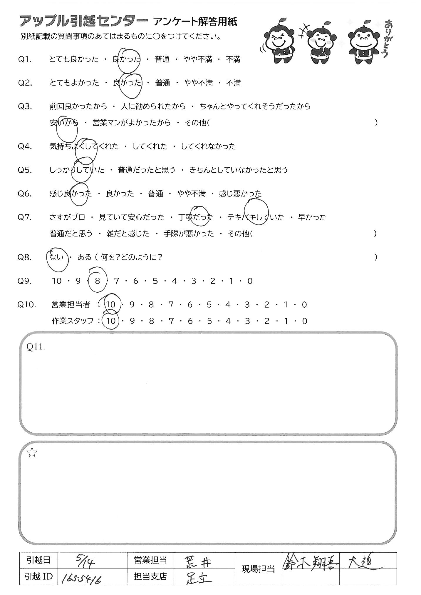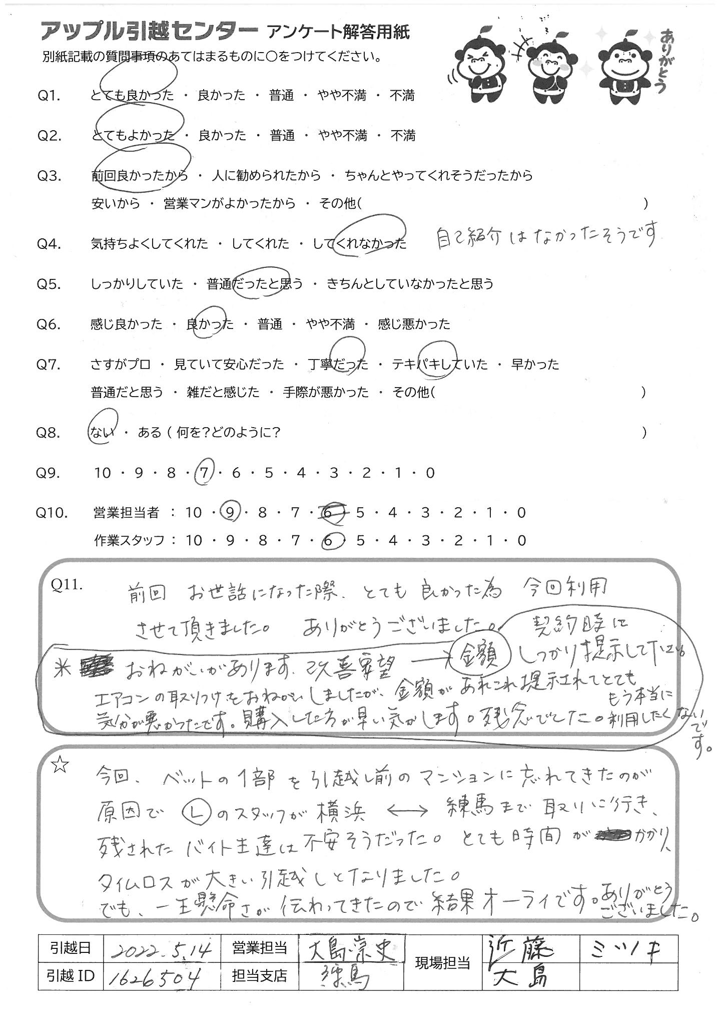 A.今回、別途の1部を引越し前のマンションに忘れてきたのが 原因でLのスタッフが横浜⇔練馬まで取りに行き 残されたバイト達は不安そうだった。とても時間がかかり、 タイムロスが大きい引越しとなりました でも、一生懸命さが伝わったので、結果オーライです。ありがとうございました