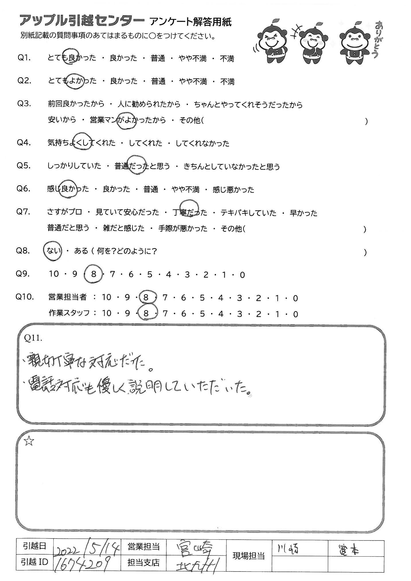 A.仕事はテキパキと早くてとても良かったです。 おそらく新人の男性の方だと思いますが、電子レンジ(結構大きくて重量のあるもの)の持ち方が下の部分ではなく、扉の取手の部分を持とうとしていて、扉の取手に負荷がかかりそうで扉の破損が不安だったため、『その持ち方は危ないと思います』とこちらから声かけさせていただきました。その電子レンジを新居に運んで部屋に下ろす時も、何かにつまずいて落としかけてるような感じだったので(毛布にくるんであったのと、布団が下にあったので直接床への落下は免れましたが)、もちろんスピード感は大事だと思いますが、安全に配慮し、新人教育はしっかり見ながら行ってほしいと思いました。 それと盗聴器調査サービスのオプションをお願いしましたが、結局なかったです。こちらも終わってから気づいたので今更はやらなくて大丈夫です。 雨でしたが、小雨だったためか、段ボールに雨粒がついたまま運ばれてきたので拭き取りなどはしないんだなと思いました。 総合的には、お値段もとても安くしていただき、テキパキと仕事をしていてあっという間に引っ越しが完了したのでよかったです。 また機会があればよろしくお願いします。