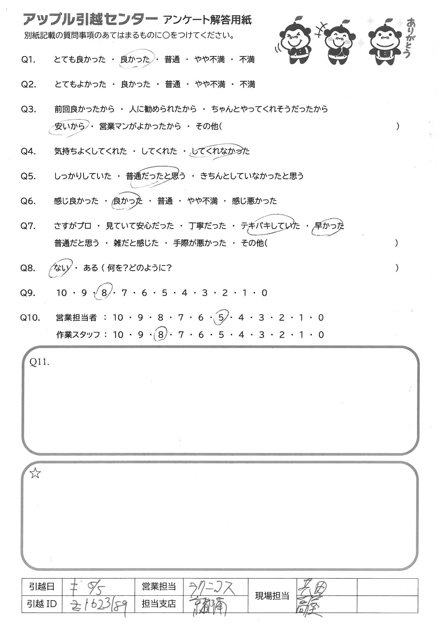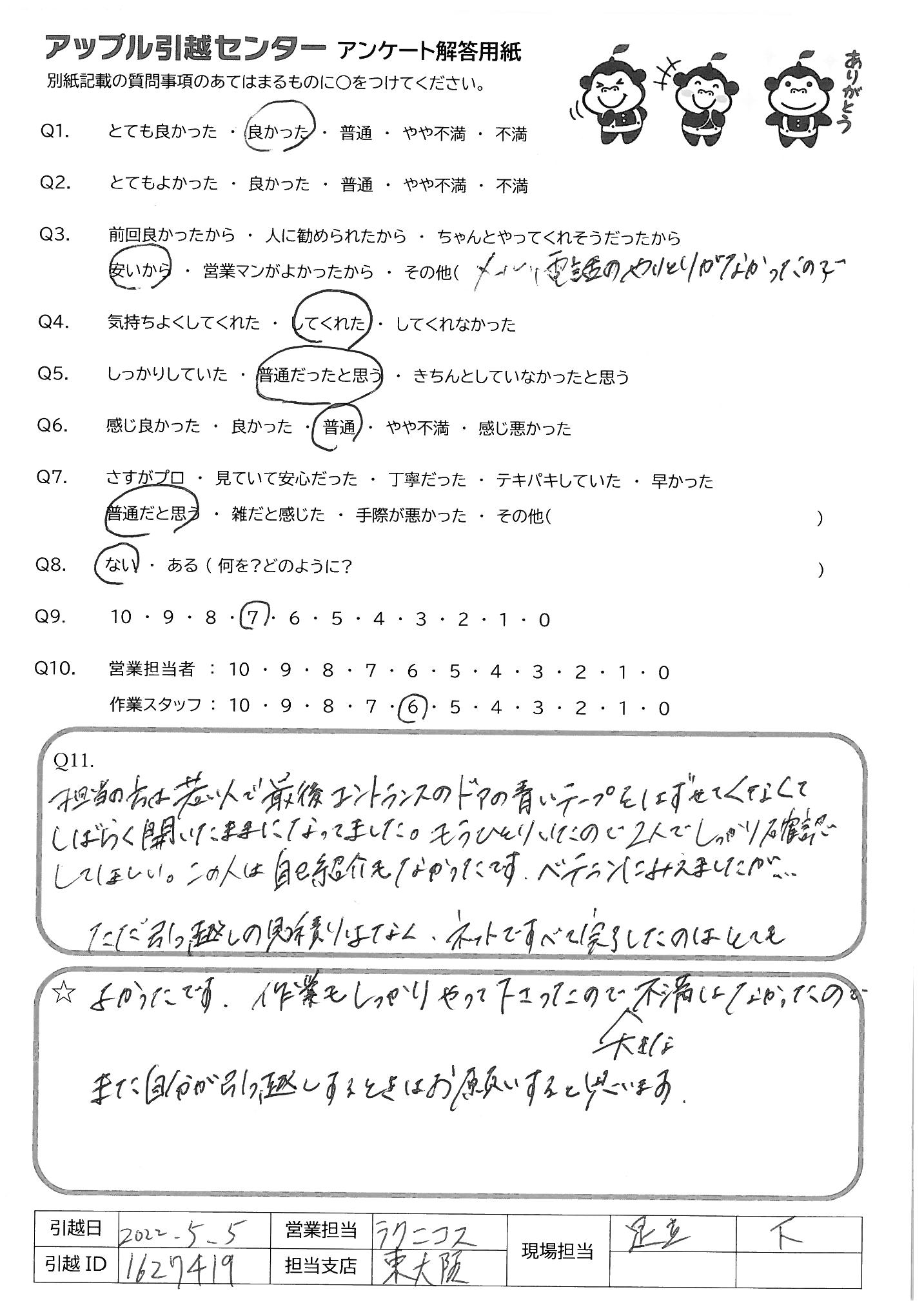 A.営業マンの方も 作業員の方も 感じ良く丁寧だったのでまた 引っ越しがあればお願いしたいと思います。 ありがとうございました。