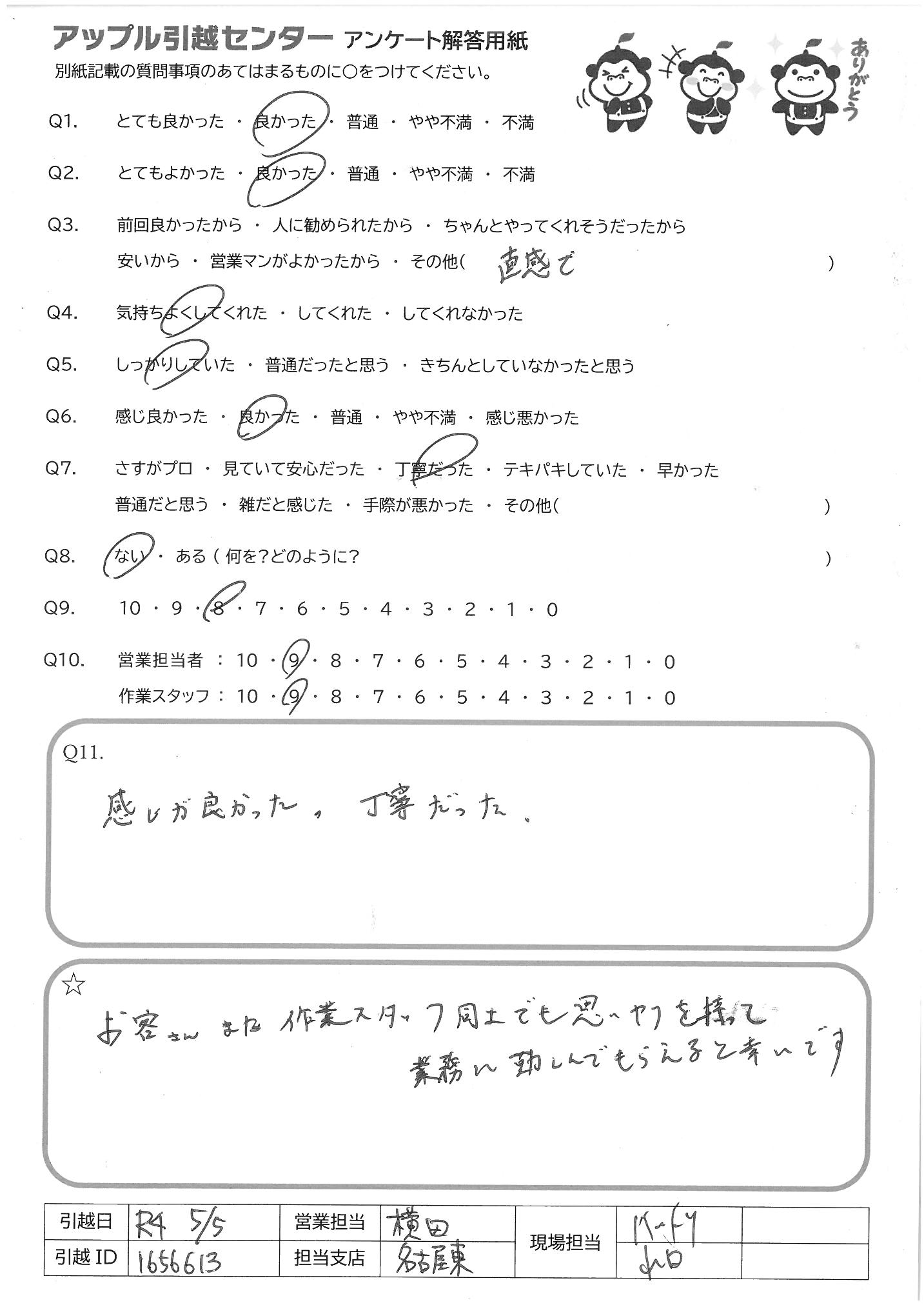 A.これまで何度も引っ越し経験があります。毎回、数社で見積もりをとって一番お安くしてくださったところに頼むと決めていましたが 今回はじめて、最安値ではなかったアップルさんに頼みました。小林様(眼鏡の男性営業の方)がとても感じが良く、お任せください!とい対応で、この会社にお願いしたいなと思ったためです。 当日来てくださった若いスタッフの方3名は、ものすごくテキパキと作業を進めてくださって、また皆さん能力が高く安心してお任せできました。 実は翌日になって、2段ベッドの組み方が間違っていたことに気づき、慌ててご連絡したのですが その際に電話対応してくださった男性の方も丁寧で、安心できました。