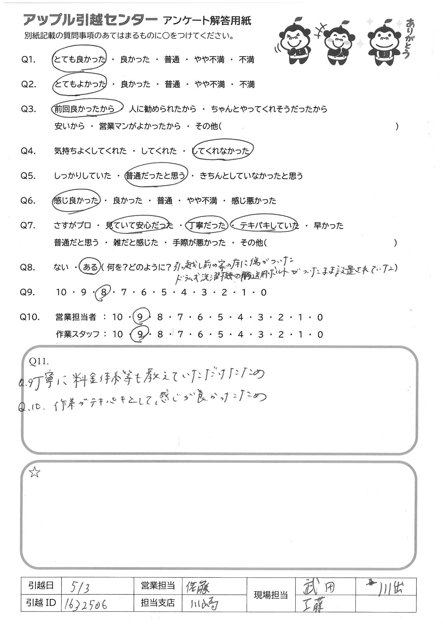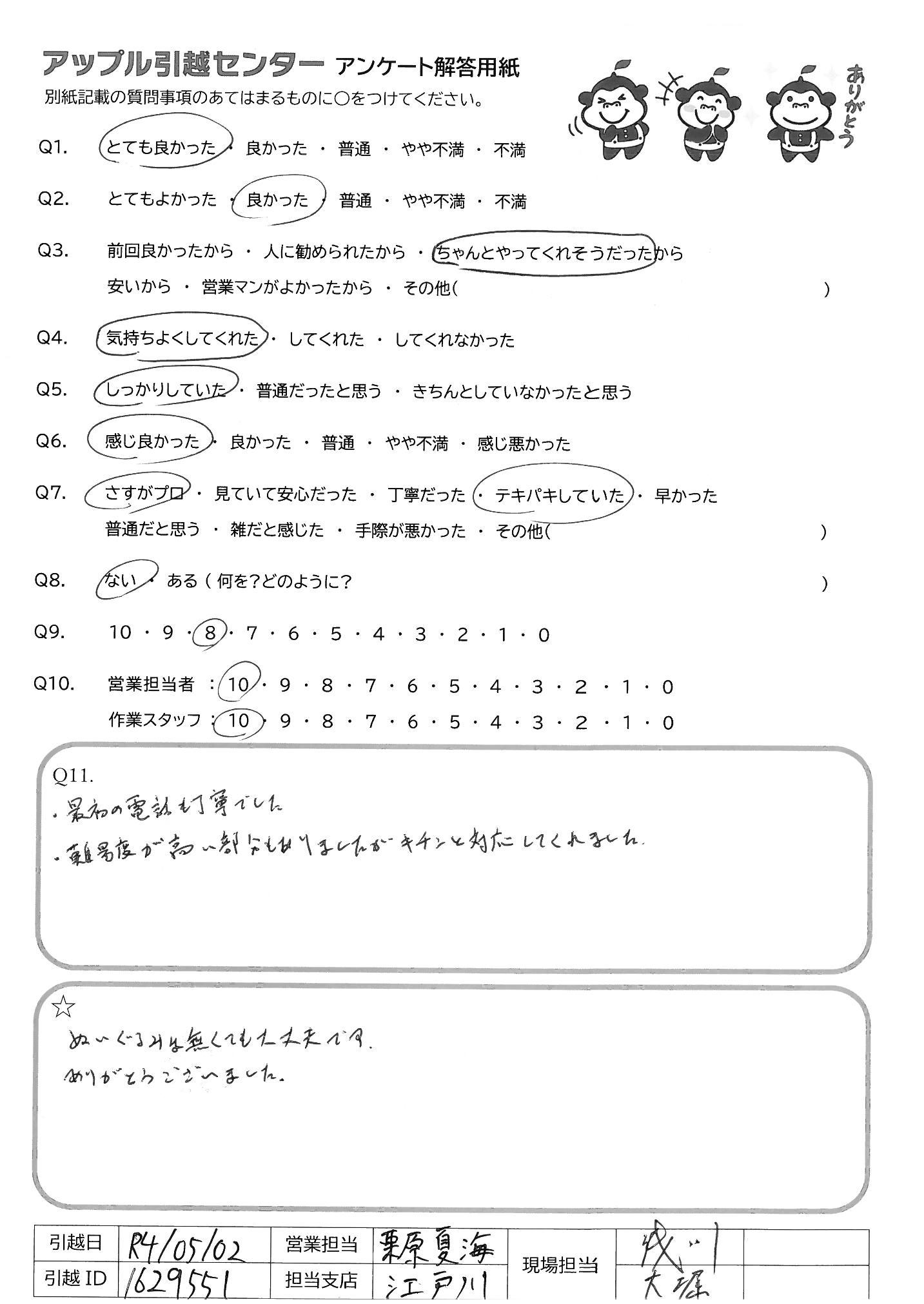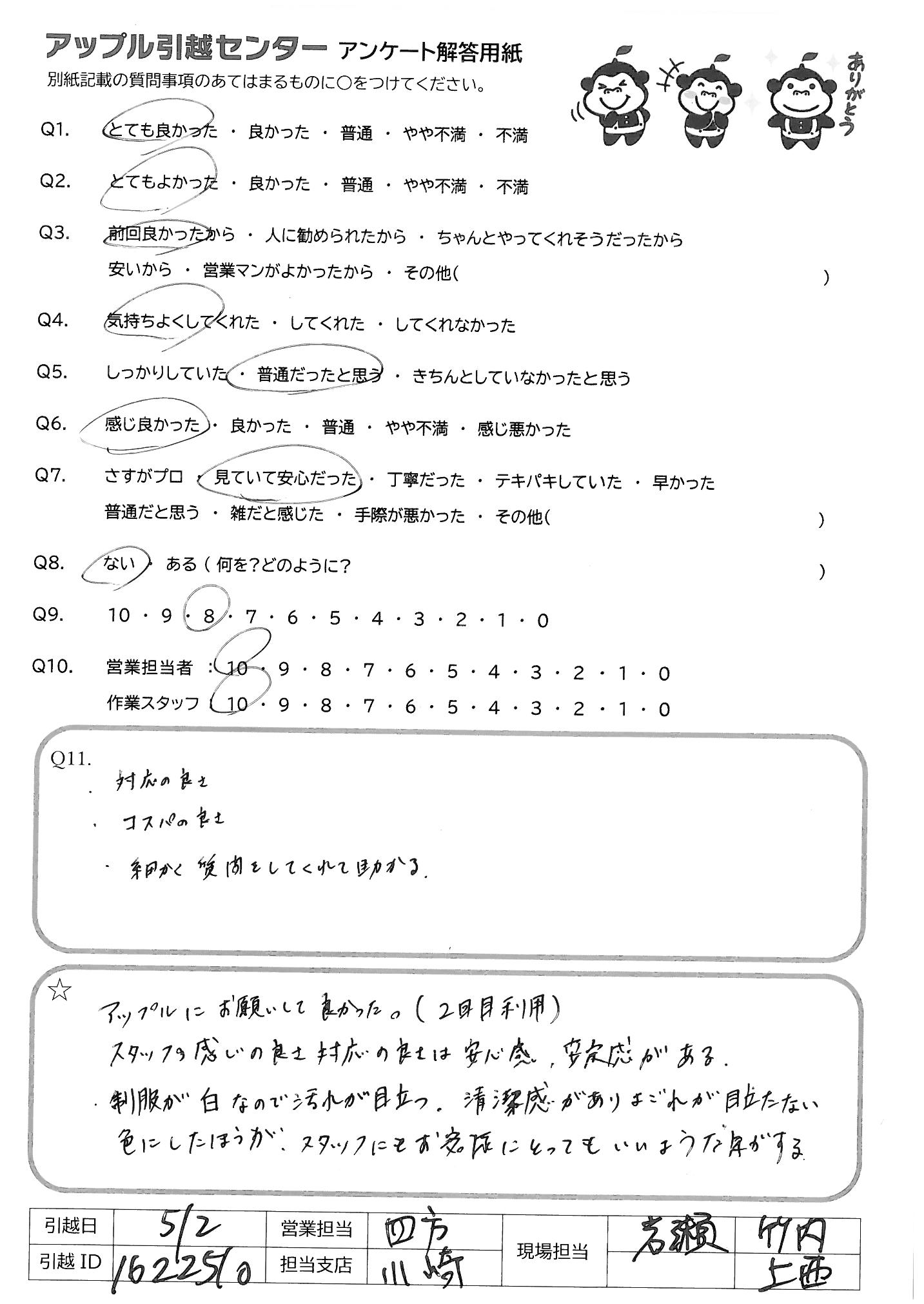 A.Q9:元々、友人等に何かを紹介したりしないので、10にはしませんでしたが もし機会があれば紹介しようと思います Q10:営 不明点もきちんと説明してくれて常に笑顔で気持ち良く対応いただいたため 作 1名途中でケガをされたのでちょっと不安でしたが、2名でテキパキ作業して いただき予定終了時間前に完了していただいたため