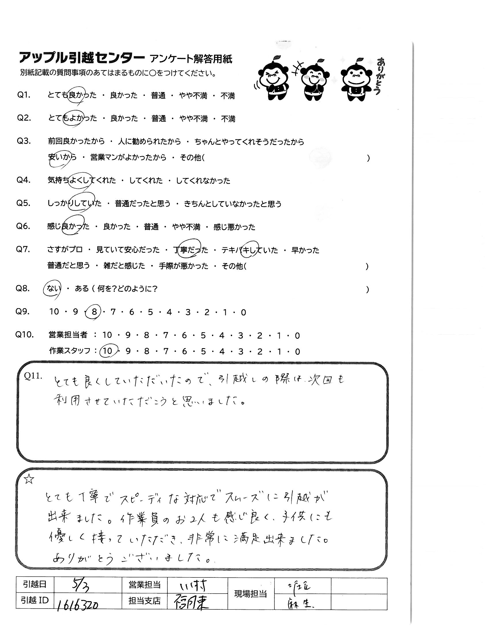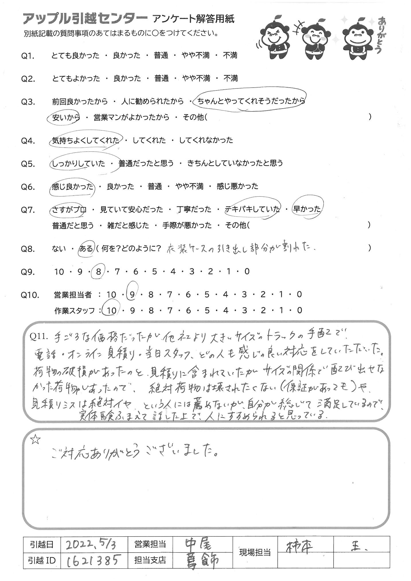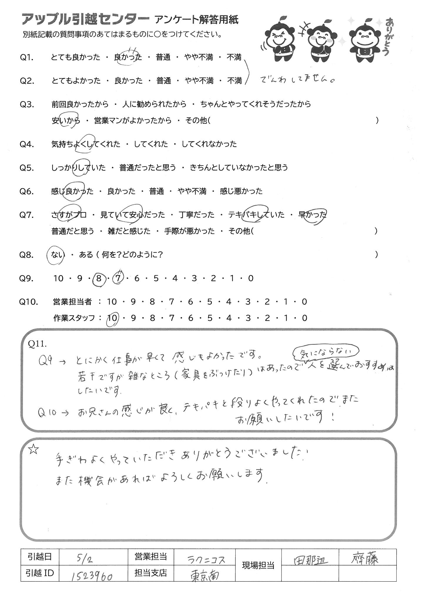 A.Q9:元々、友人等に何かを紹介したりしないので、10にはしませんでしたが もし機会があれば紹介しようと思います Q10:営 不明点もきちんと説明してくれて常に笑顔で気持ち良く対応いただいたため 作 1名途中でケガをされたのでちょっと不安でしたが、2名でテキパキ作業して いただき予定終了時間前に完了していただいたため