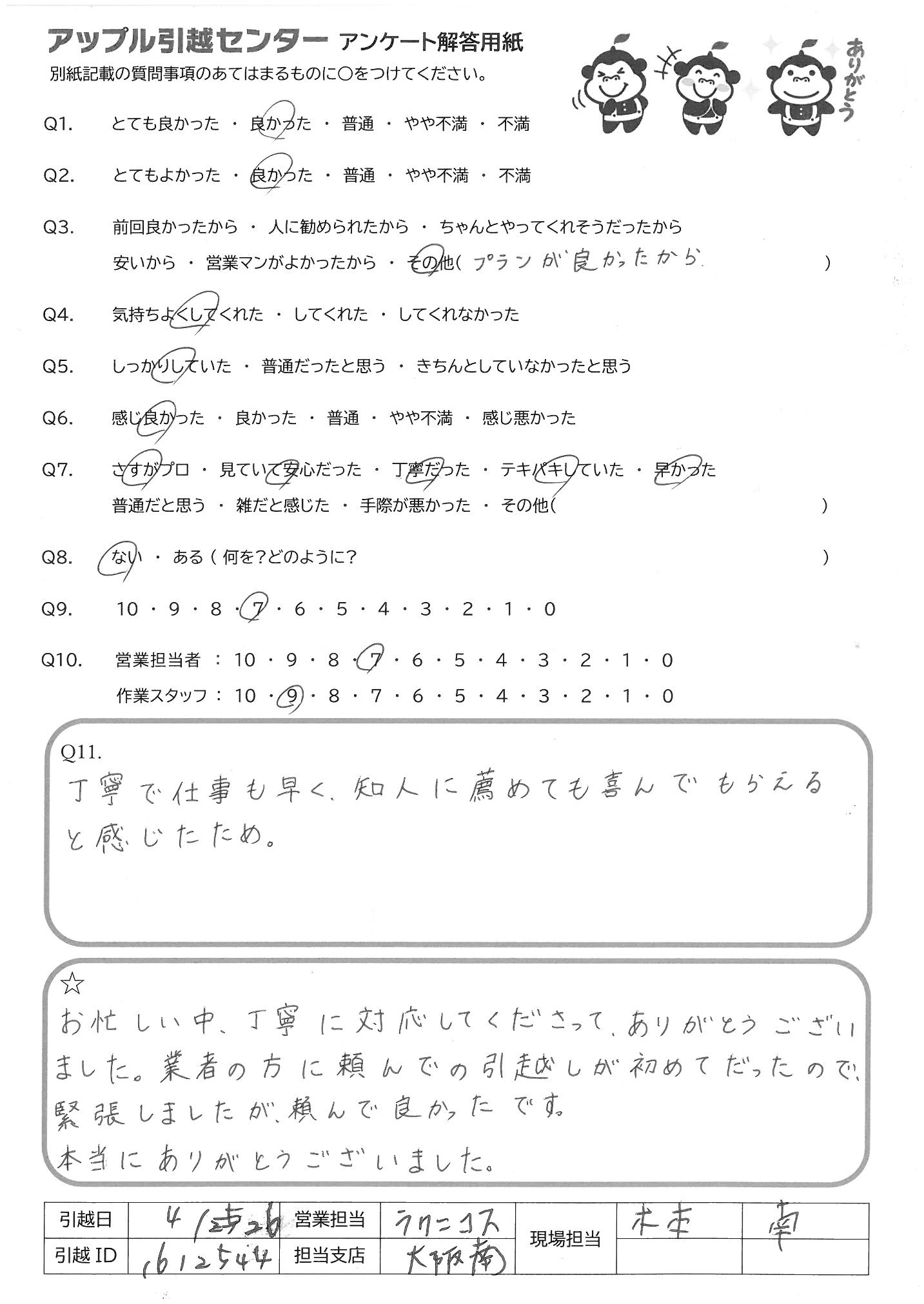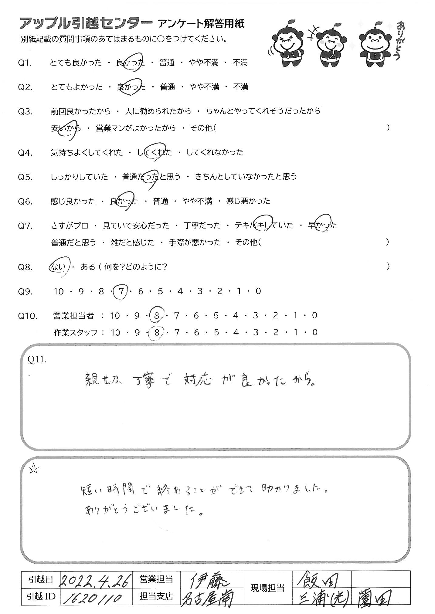 A.お忙しい中、丁寧に対応してくださって、ありがとうござい ました。業者の方に頼んでの引越しが初めてだったので 緊張しましたが頼んで良かったです 本当にありがとうございました