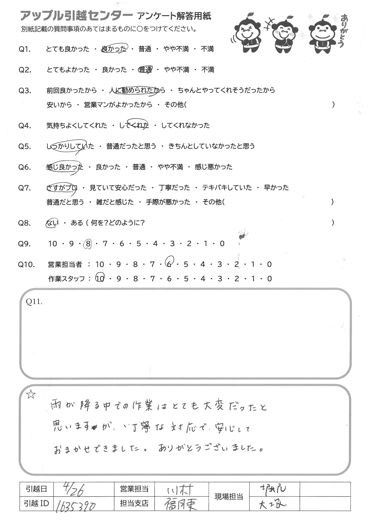 A.引越し前の連絡からしっかり対応していただき安心して任せられました、ありがとうございます。 作業中もこちらの疑問にはしっかり答えてくれて、作業自体も丁寧に行なっていただいたので、御社にお願いして良かったと思っております。