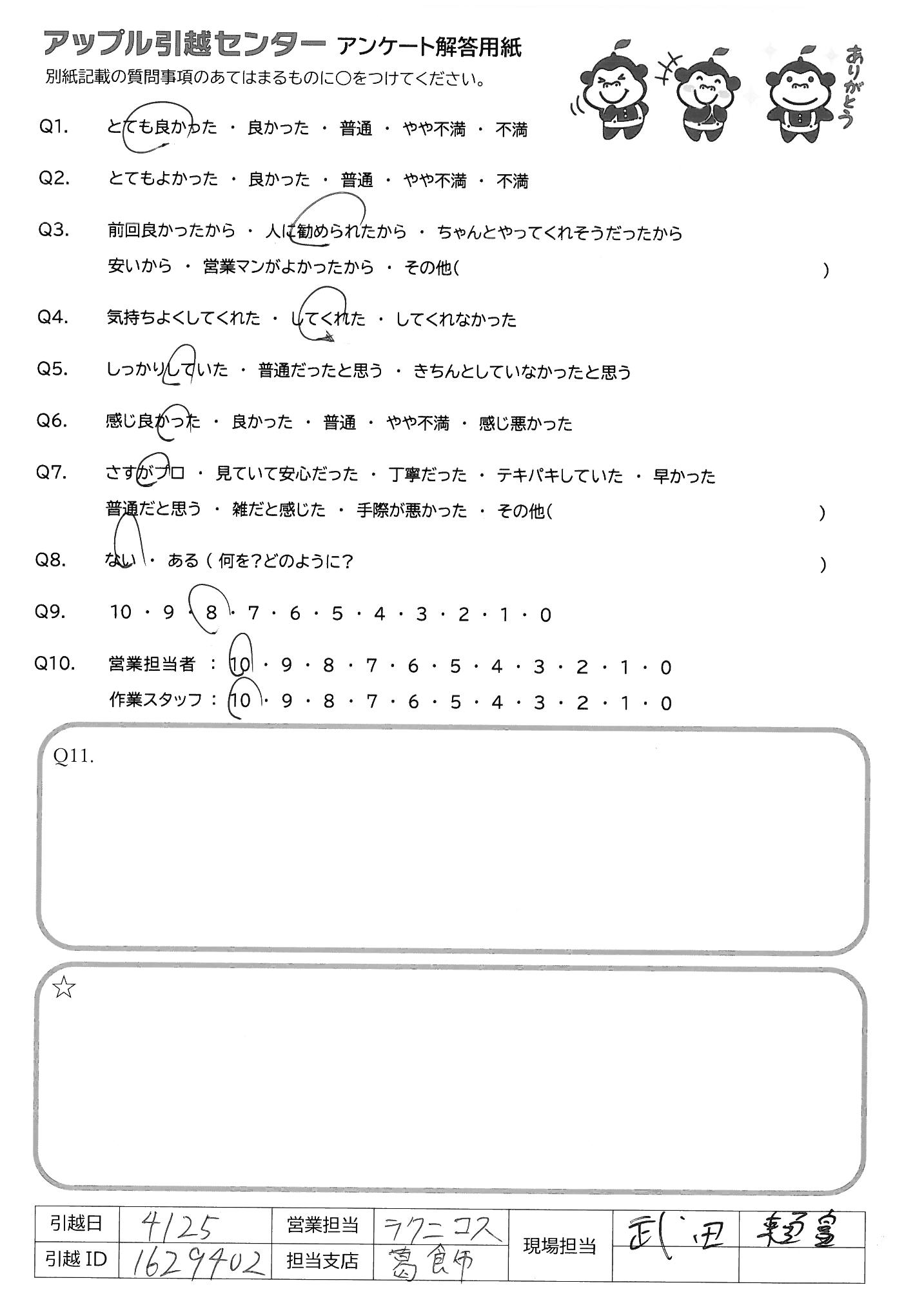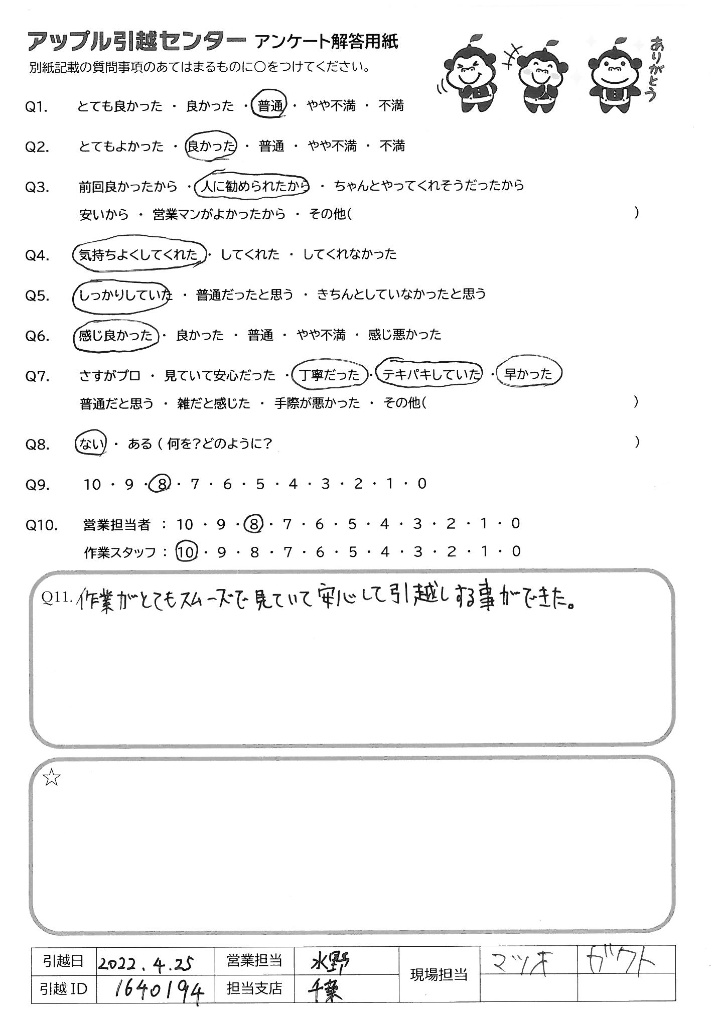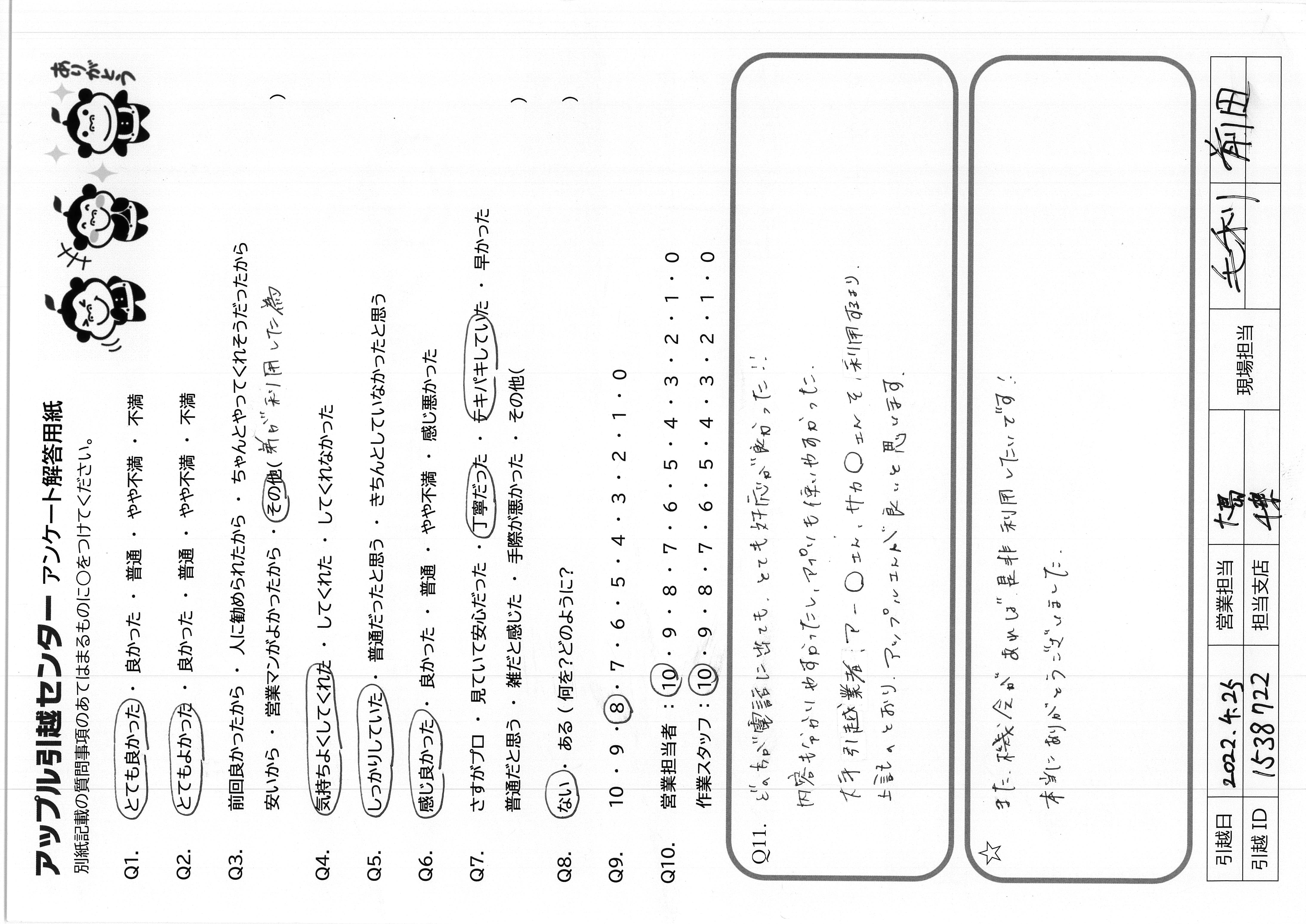 A.どっちが電話に出ても、とても好感が良かった 内容も分かりやすかったし、使いやすかった 大手引越業者、アー〇さん、サカ〇さんを利用するより 上記のとおり、アップルさんが良いと思います