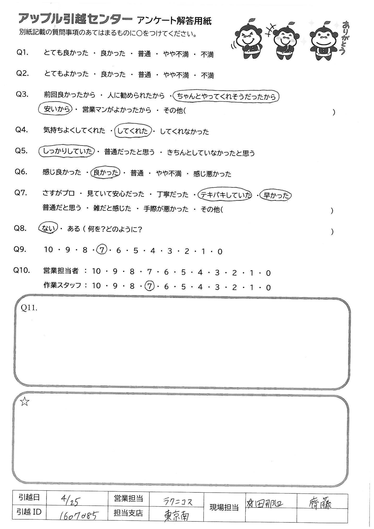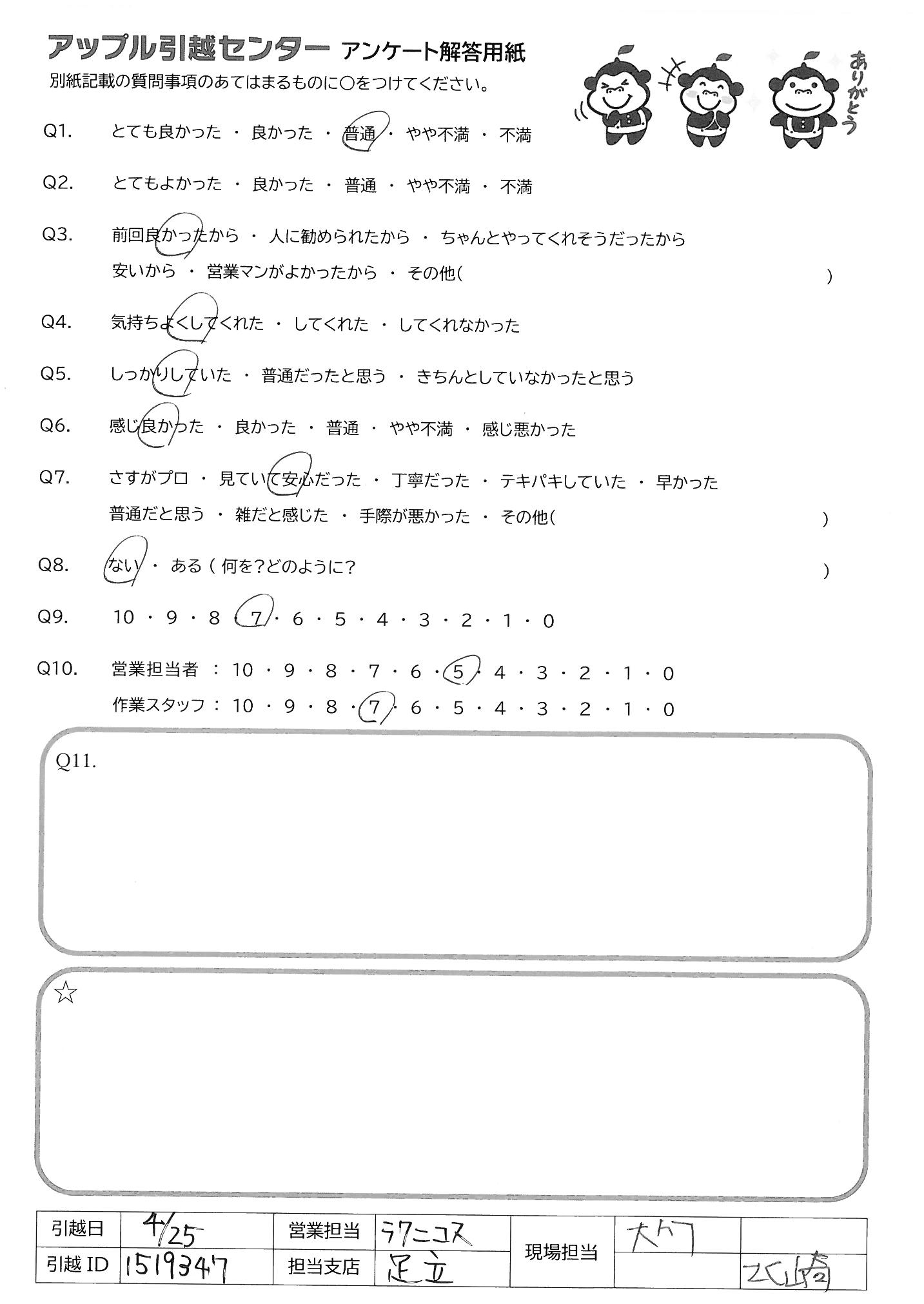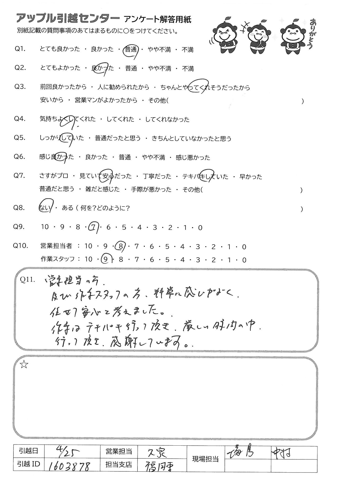 A.どっちが電話に出ても、とても好感が良かった 内容も分かりやすかったし、使いやすかった 大手引越業者、アー〇さん、サカ〇さんを利用するより 上記のとおり、アップルさんが良いと思います