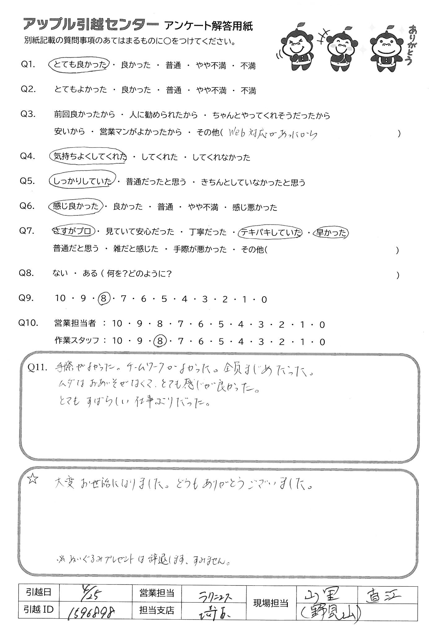 A.営業担当の方がコロナに罹患された時に、必要な連絡がとれないことがあり、心配なコトが多くありました。 引越日の作業スッタフの方々はとてもテキパキ・丁寧に作業されていて、感心しました。が、前日梱包の方々が他で回答した通りなので80点としました。