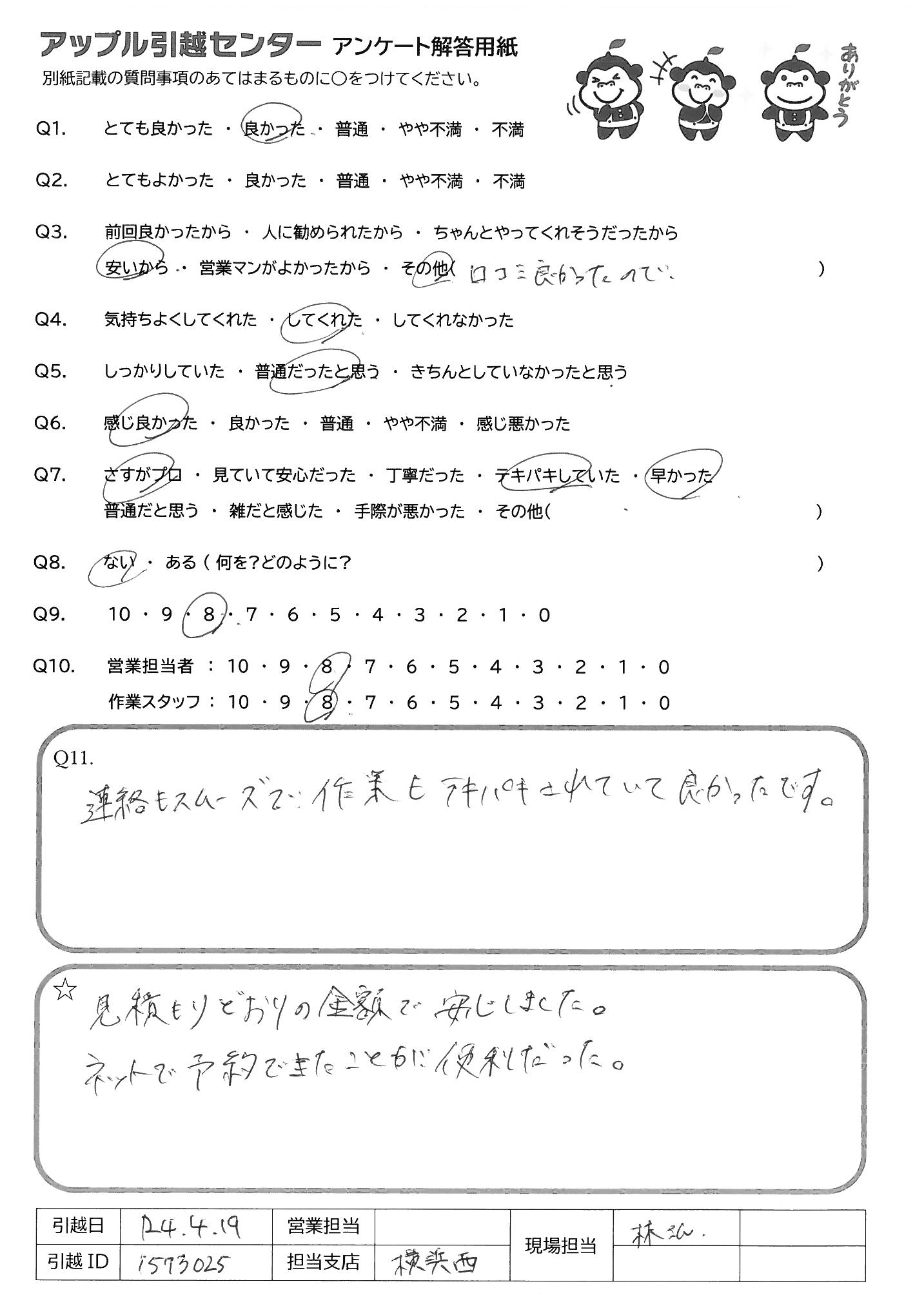 A.見積もりどうおりの金額で安心しました ネットで予約ができたことが便利だった