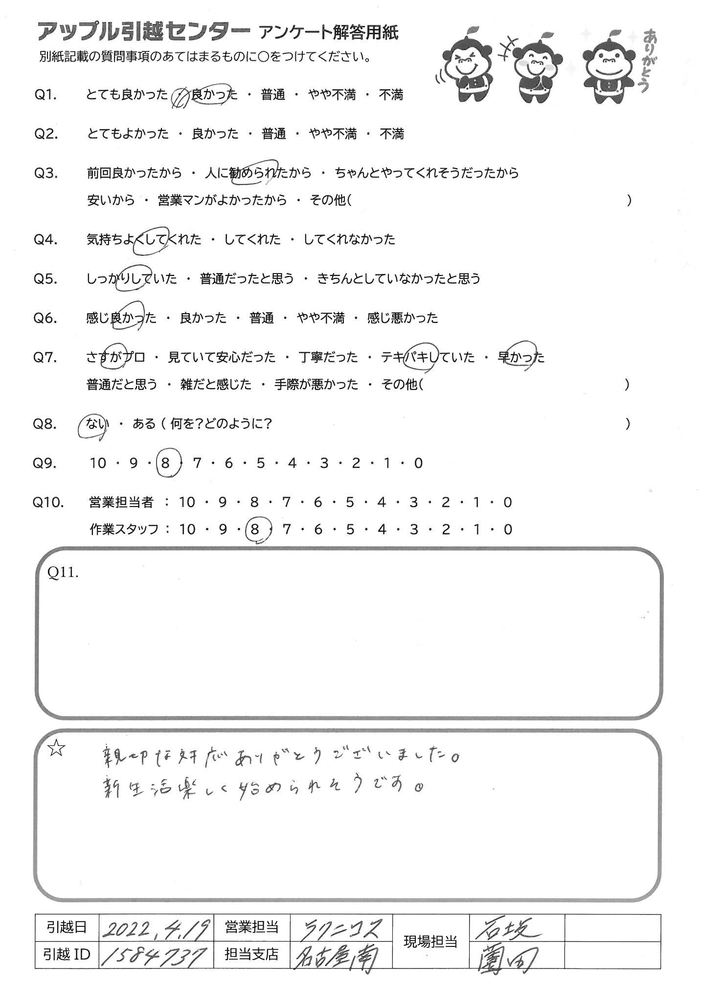 引越し日:2022年04月19日 エリア:愛知県名古屋市中村区