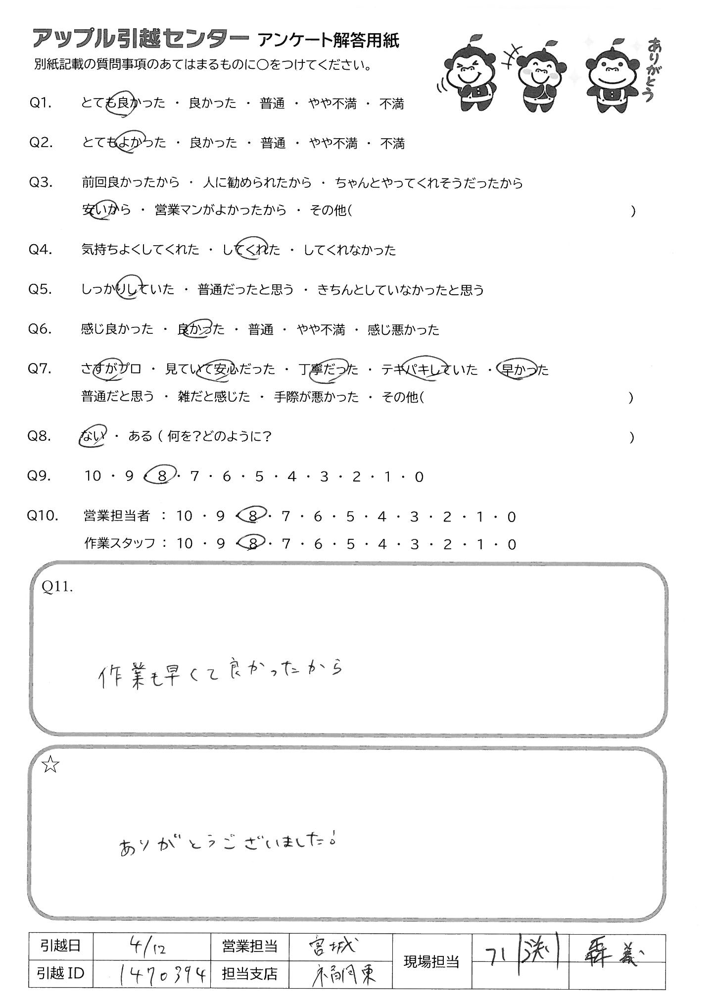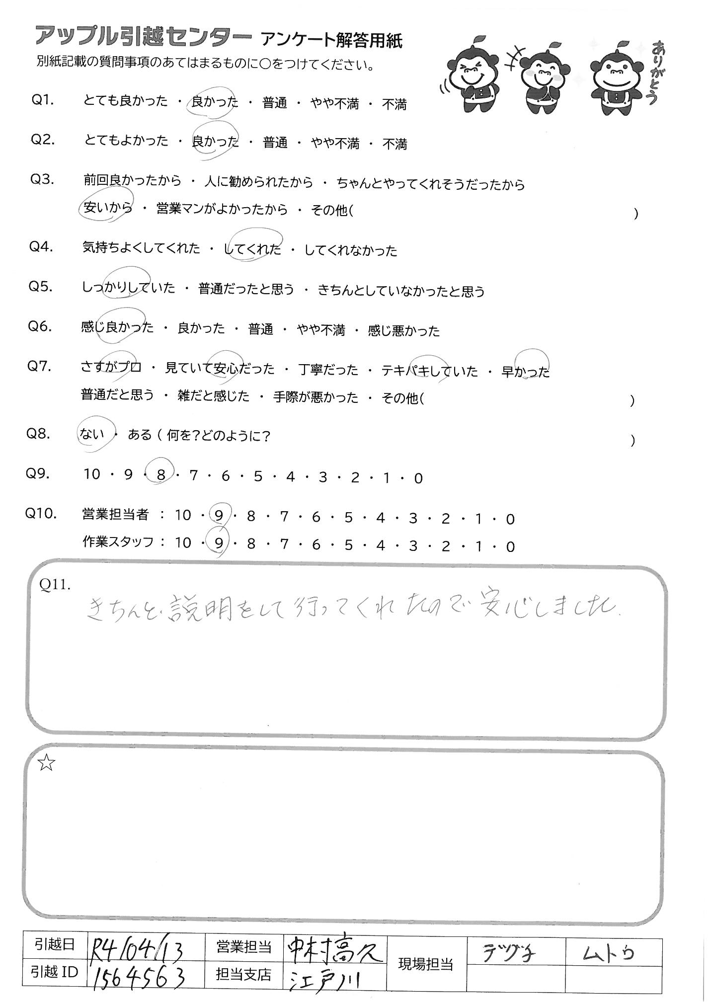 A.テキパキと引っ越しも終わり値段も安く満足してます。ありがとうございました。