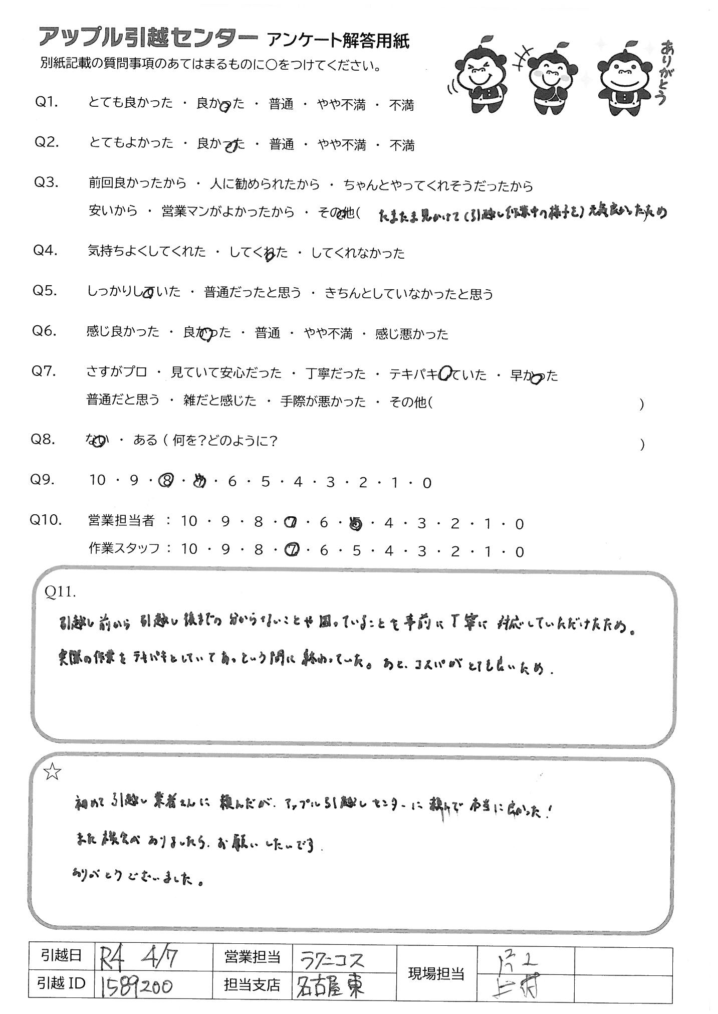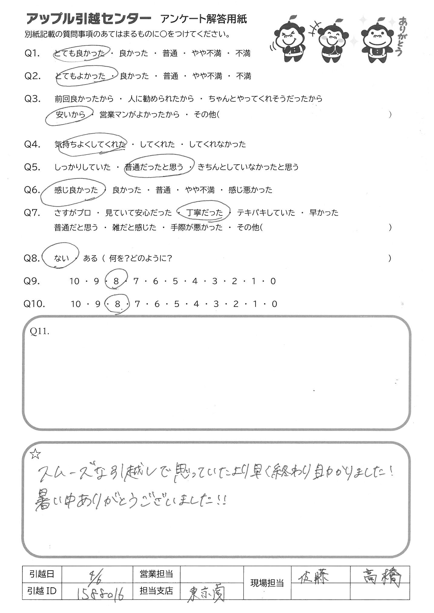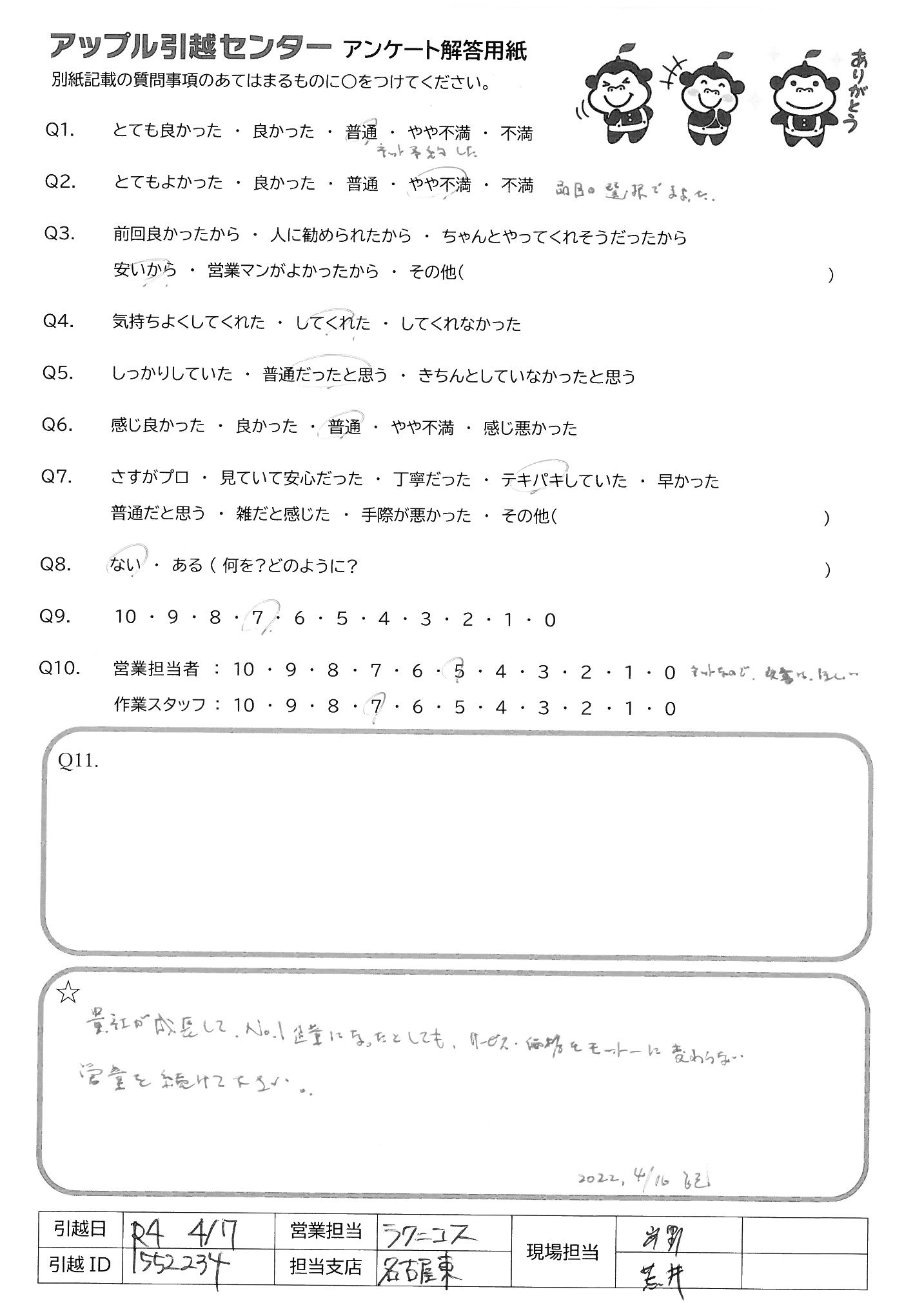 A.初めて引越し業者に頼んだがアップル引越しセンターに頼んで本当に良かった! また機会がありましたらお願いしたいです ありがとうございました。