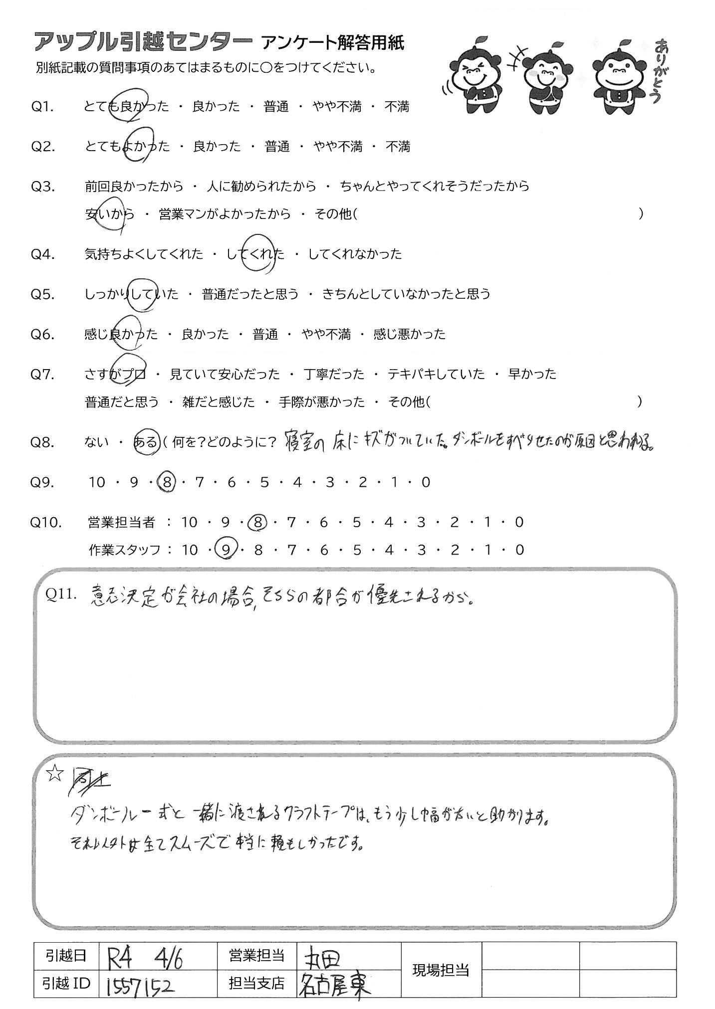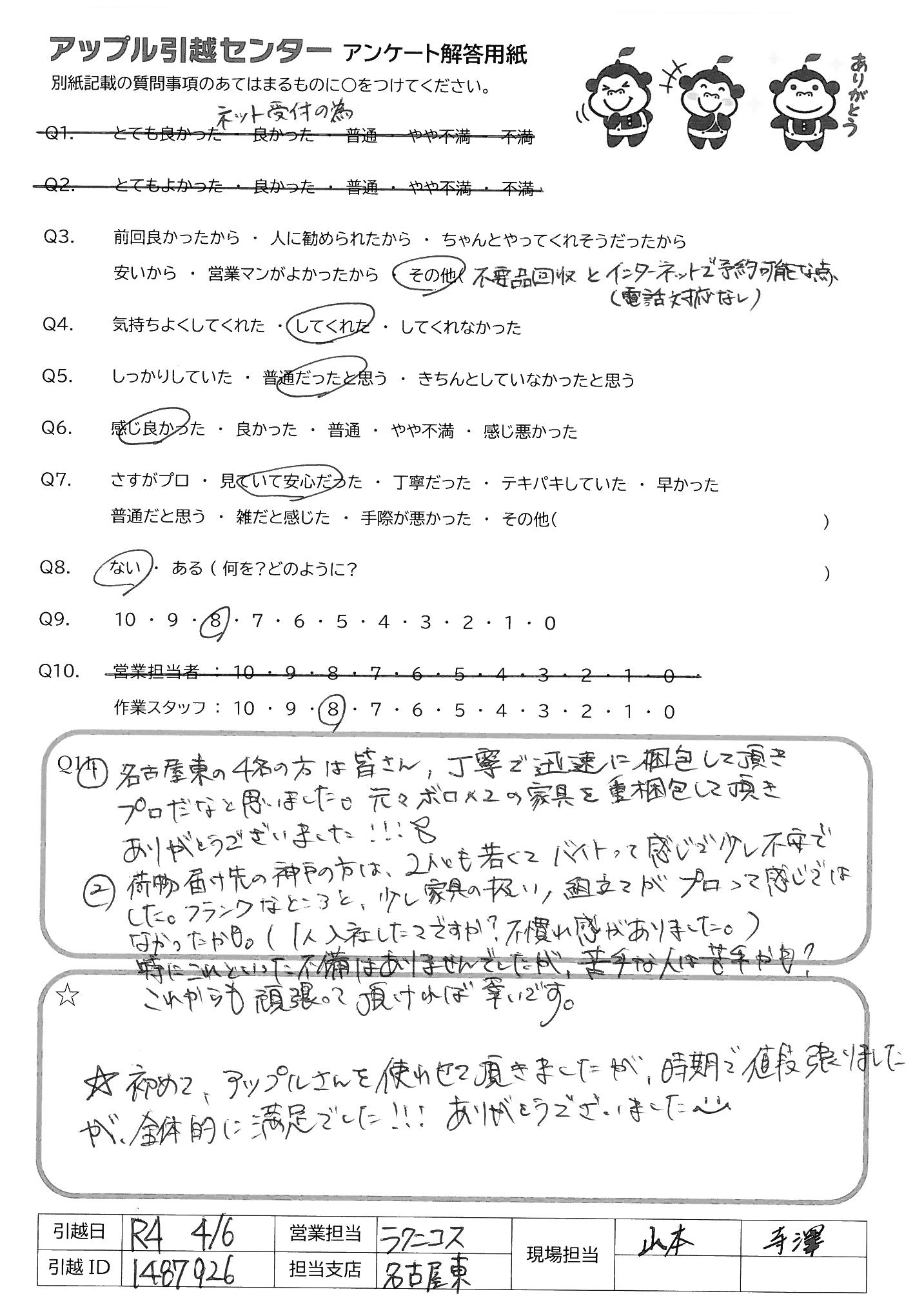 A.①名古屋東の4名の方は皆さん、丁寧で迅速に梱包して頂き プロだなと思いました。元々ボロ×2の家具を重梱包して頂き ありがとうございました!!! ②荷物届け先の神戸の方は、2人とも若くて、バイトって感じで少し不安で した。フランクなところと、少し家具の扱い、組立てがプロって感じでは なかったが(1人入社したてですか?不慣れな感がありました) 特にこれといった不備はありませんでしたが、苦手な人は苦手かも? これからも頑張って頂ければ幸いです。