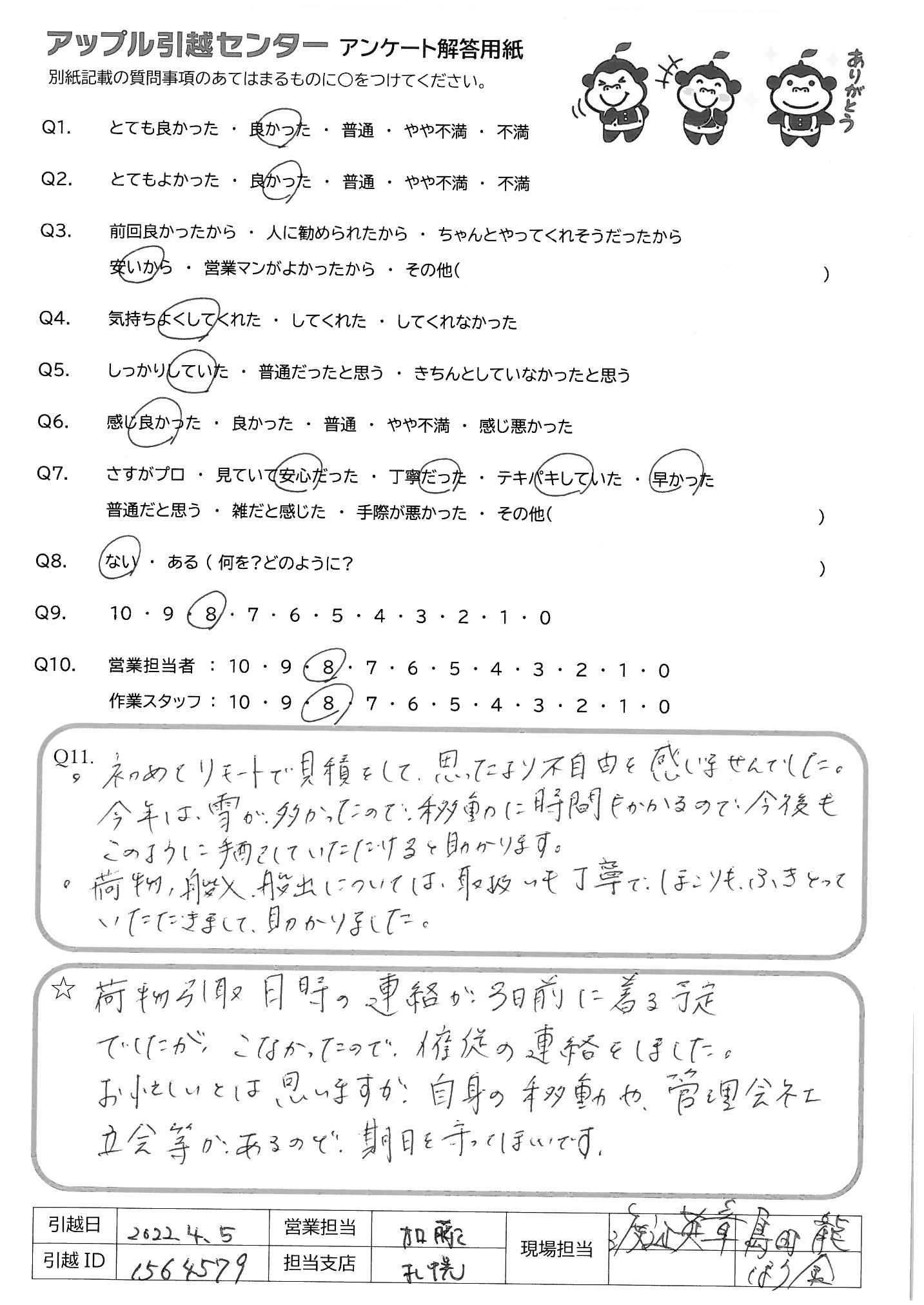 A.・初めてリモート見積をして思ったより不自由を感じませんでした 今年は雪が多かったので、移動に時間もかかるので、今後も このように手配していただけると助かります 荷物、搬入、搬出については取扱いも丁寧でほこりもふきとって いただきまして助かりました