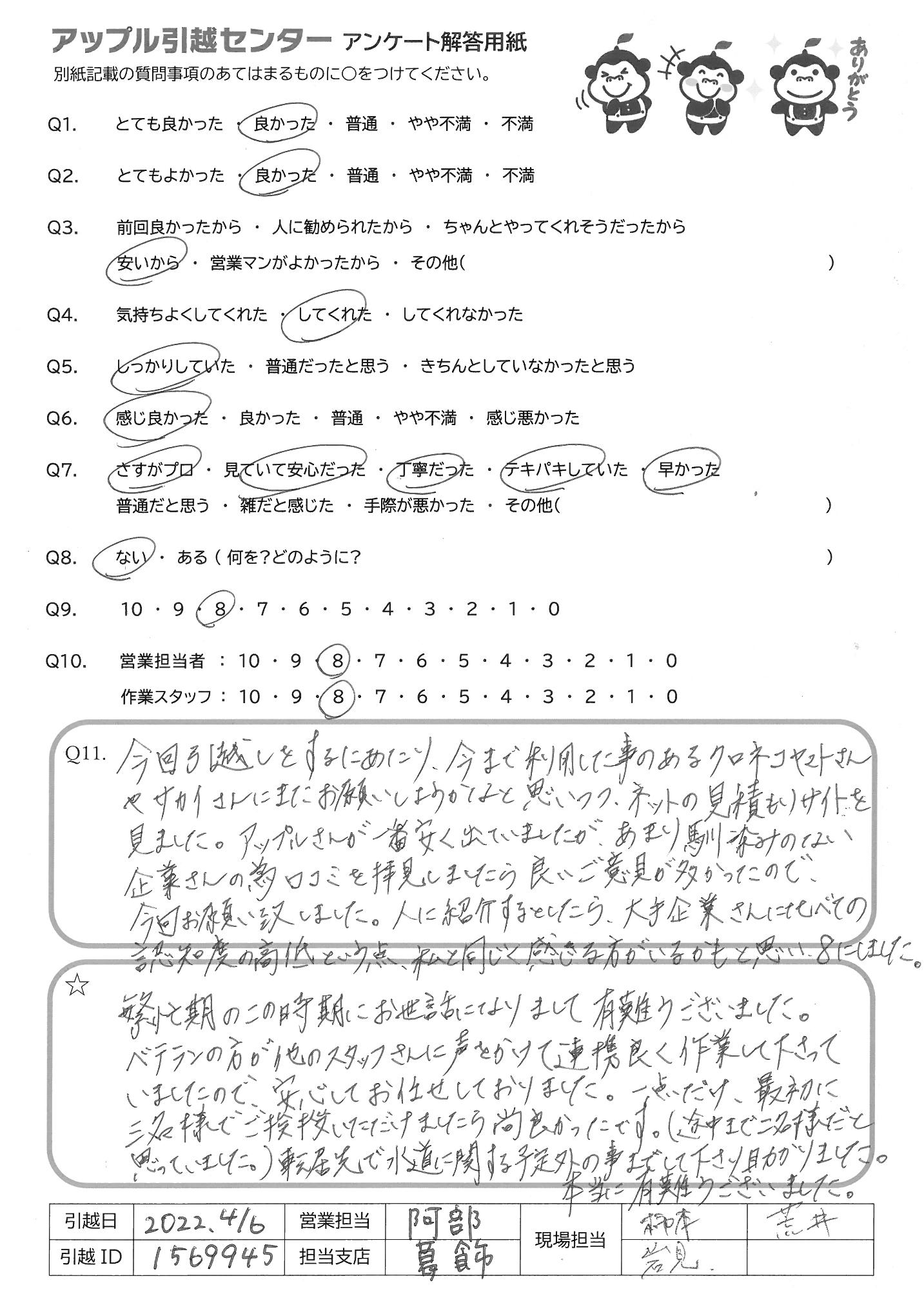 A.繁忙期のこの時期にお世話になりまして有難うございました。 ベテランの方が他のスタッフさんに声かけて連携良く作業して下さって いましたので、安心してお任せしておりました。一点だけ、最初に 三名様でご挨拶いただけましたら、尚良かったです。(途中まで二名様だと 思っていました)転居先で水道に関する予定外の事までして下さり助かりました 本当にありがとうございました
