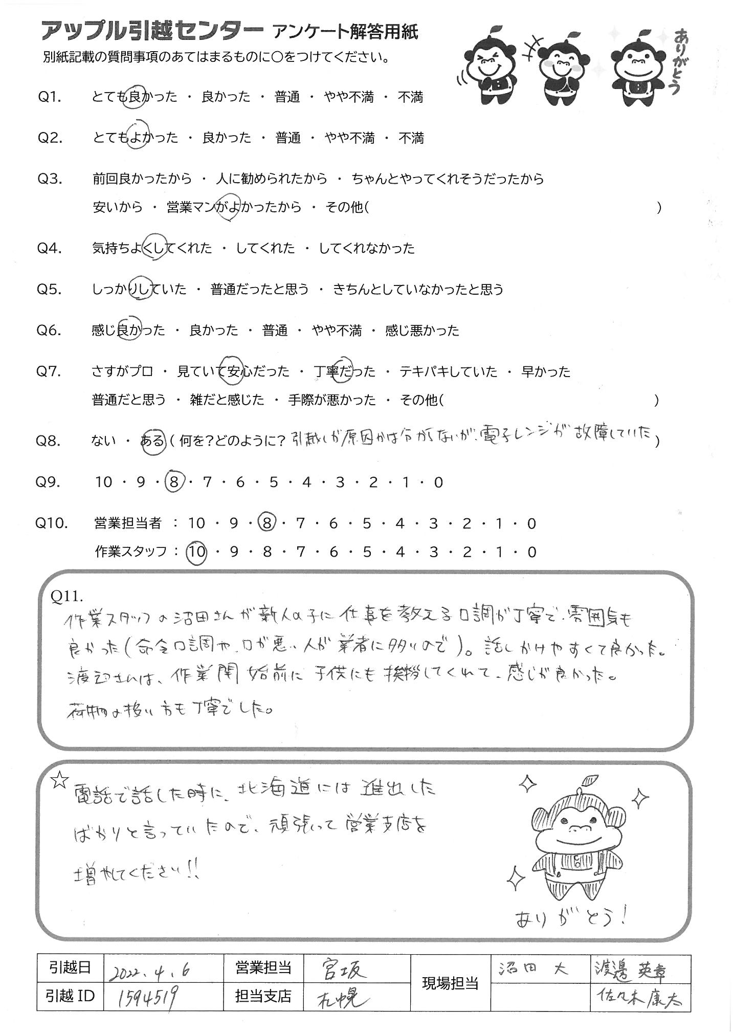 A.作業スタッフの沼田さんが新人の子に仕事を教える口調が丁寧で雰囲気も 良かった(命令口調が悪い人が業者に多いので)話しかけやすくて良かった 渡辺さんは、作業開始前に、子供にも挨拶してくれて、感じが良かった 荷物の扱い方も丁寧でした