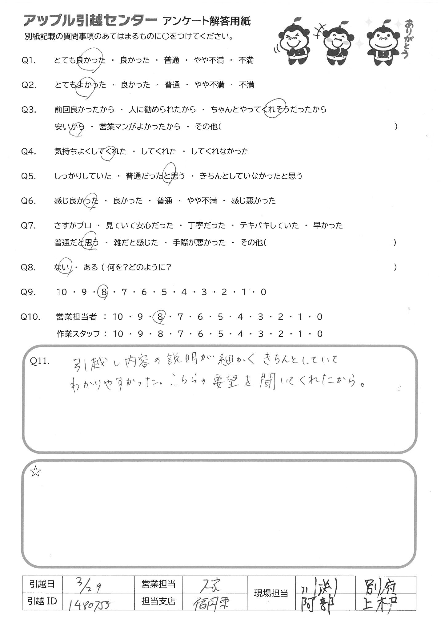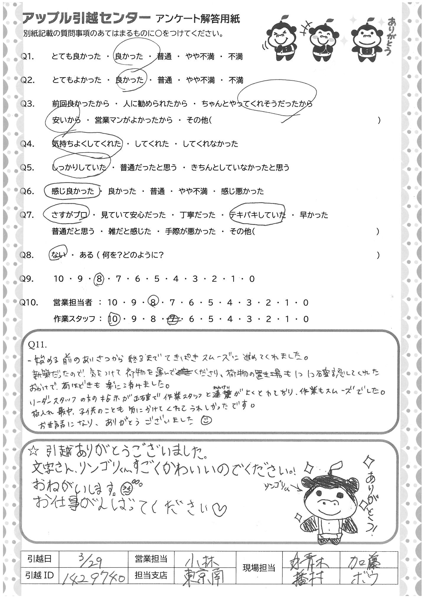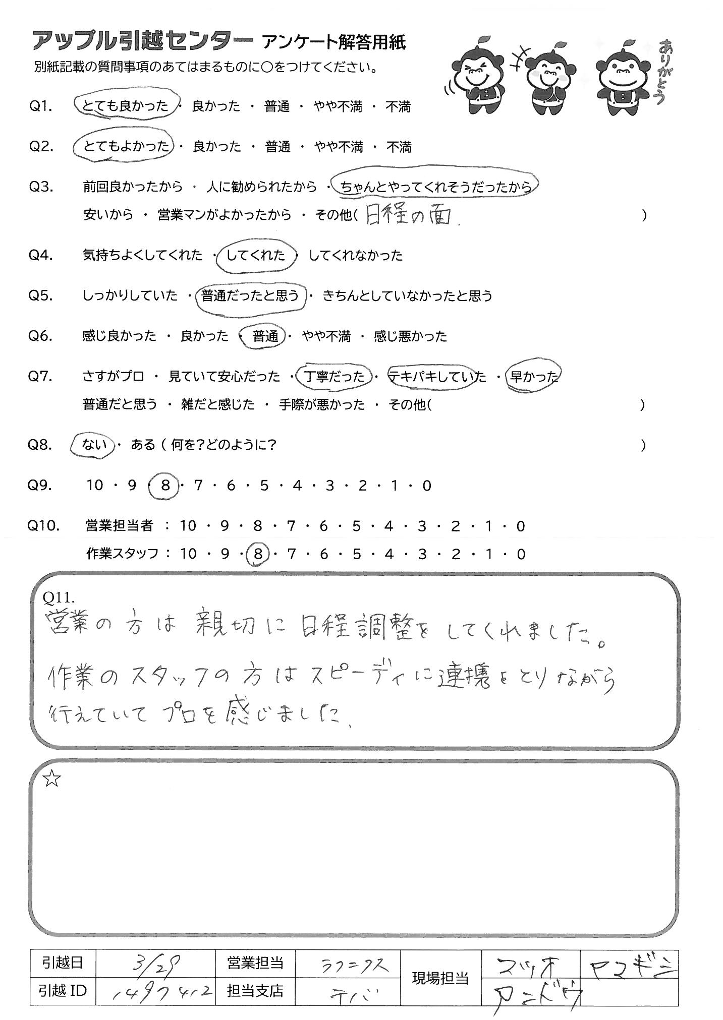 A.・始める前のあいさつから終了までてきぱきスムーズに進めてくれました。 新築だったので、気をつけて、荷物を運んでくださり、荷物の置き場も1つ1つ確認してくれた おかげで荷ほどきも楽に済みました リーダースタッフの方の指示が正確で作業スタッフと連携がよくとれており、作業もスムーズでした。 荷入れ最中、子供のことも気にかけてくれてうれしかったです。 お世話になりました。ありがとうございました