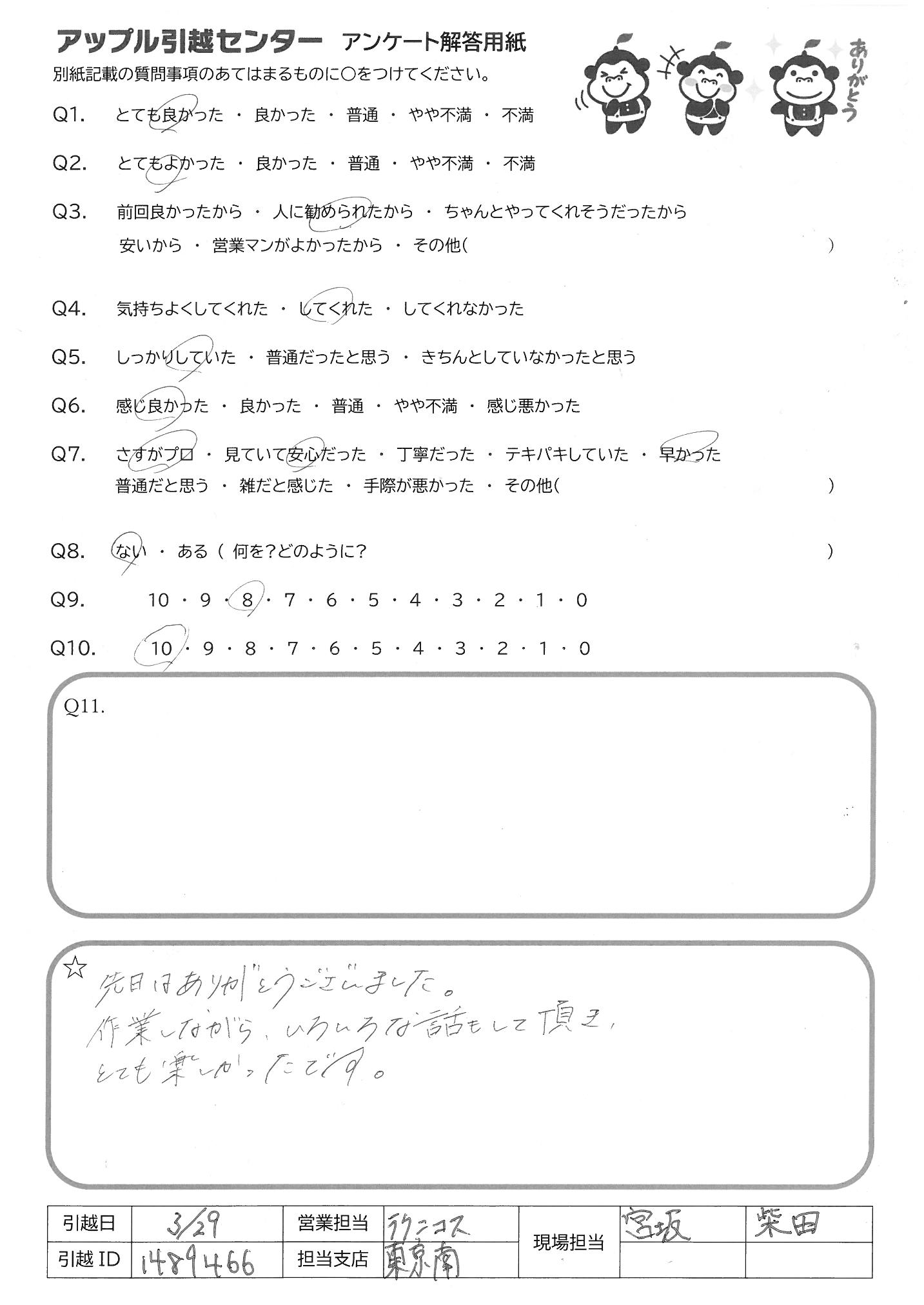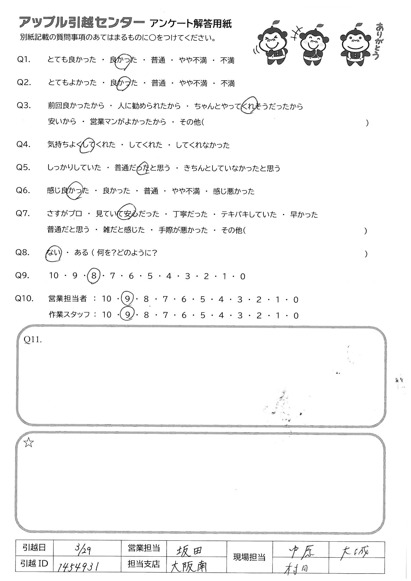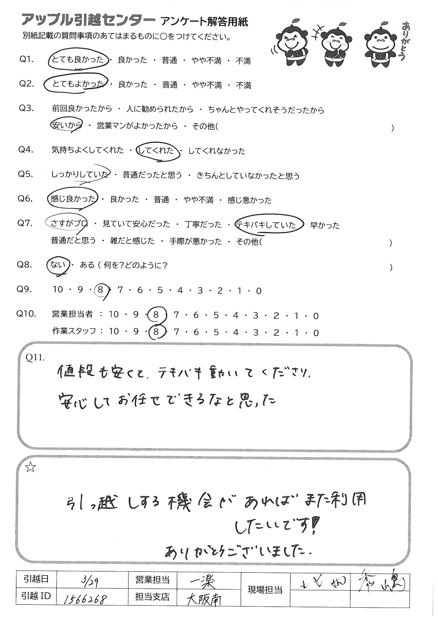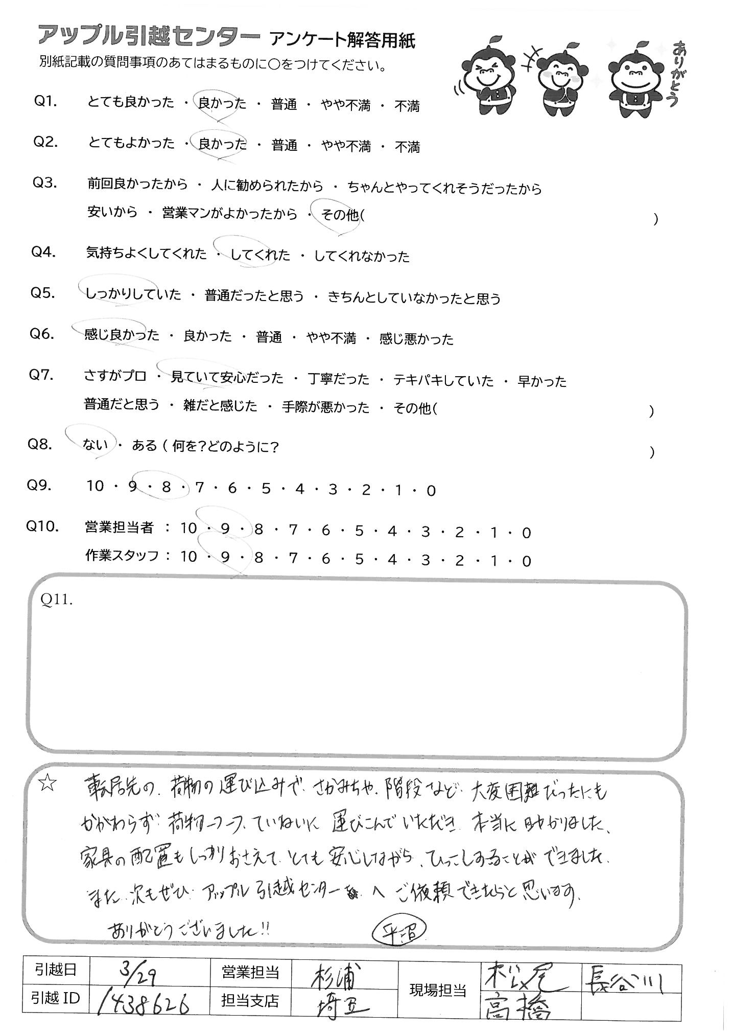A.・始める前のあいさつから終了までてきぱきスムーズに進めてくれました。 新築だったので、気をつけて、荷物を運んでくださり、荷物の置き場も1つ1つ確認してくれた おかげで荷ほどきも楽に済みました リーダースタッフの方の指示が正確で作業スタッフと連携がよくとれており、作業もスムーズでした。 荷入れ最中、子供のことも気にかけてくれてうれしかったです。 お世話になりました。ありがとうございました