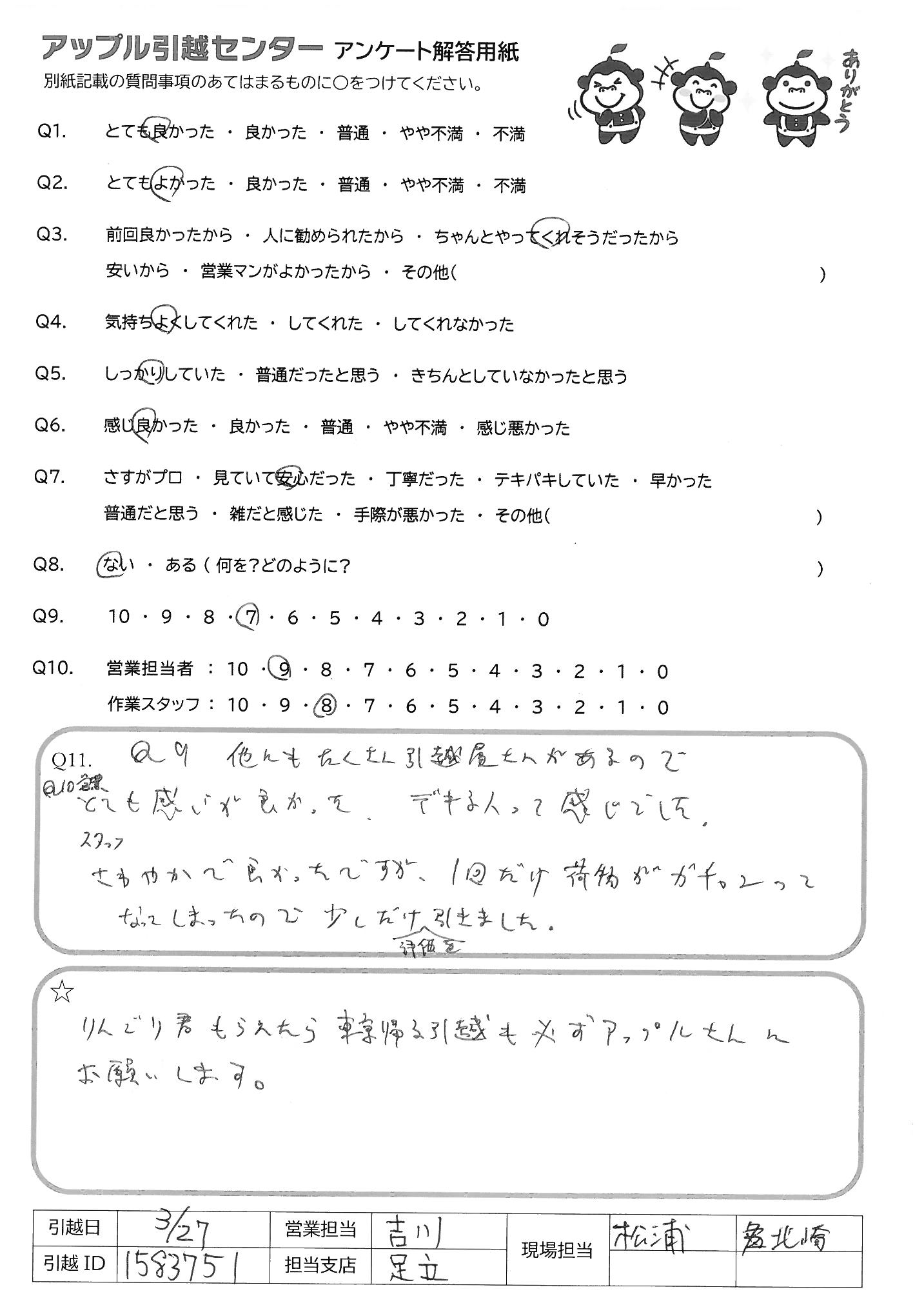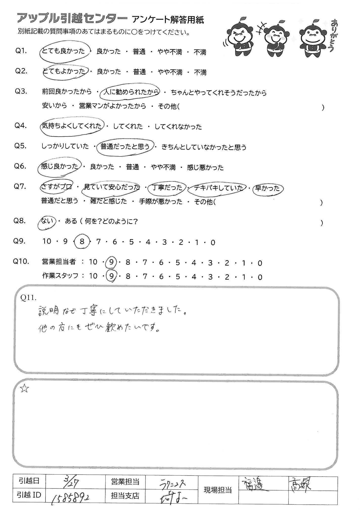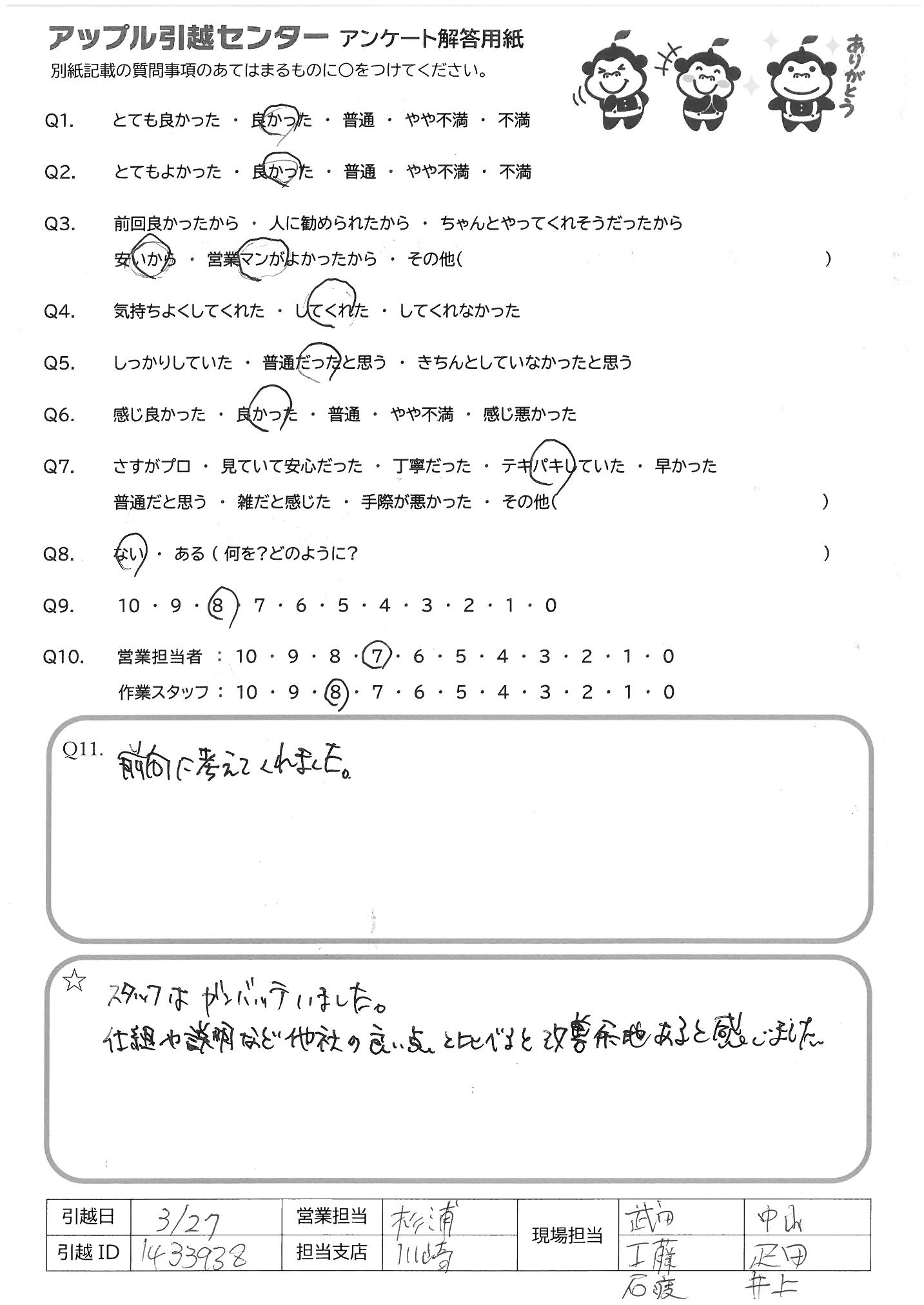 A.Q10 理由→繁忙期ということもあって、何とか27日に 入れ込んでくれて本当に助かりました 少しでも値下げして頂き、気持ちが 嬉しかったです。また引っこしの時は お願いしたいと思います