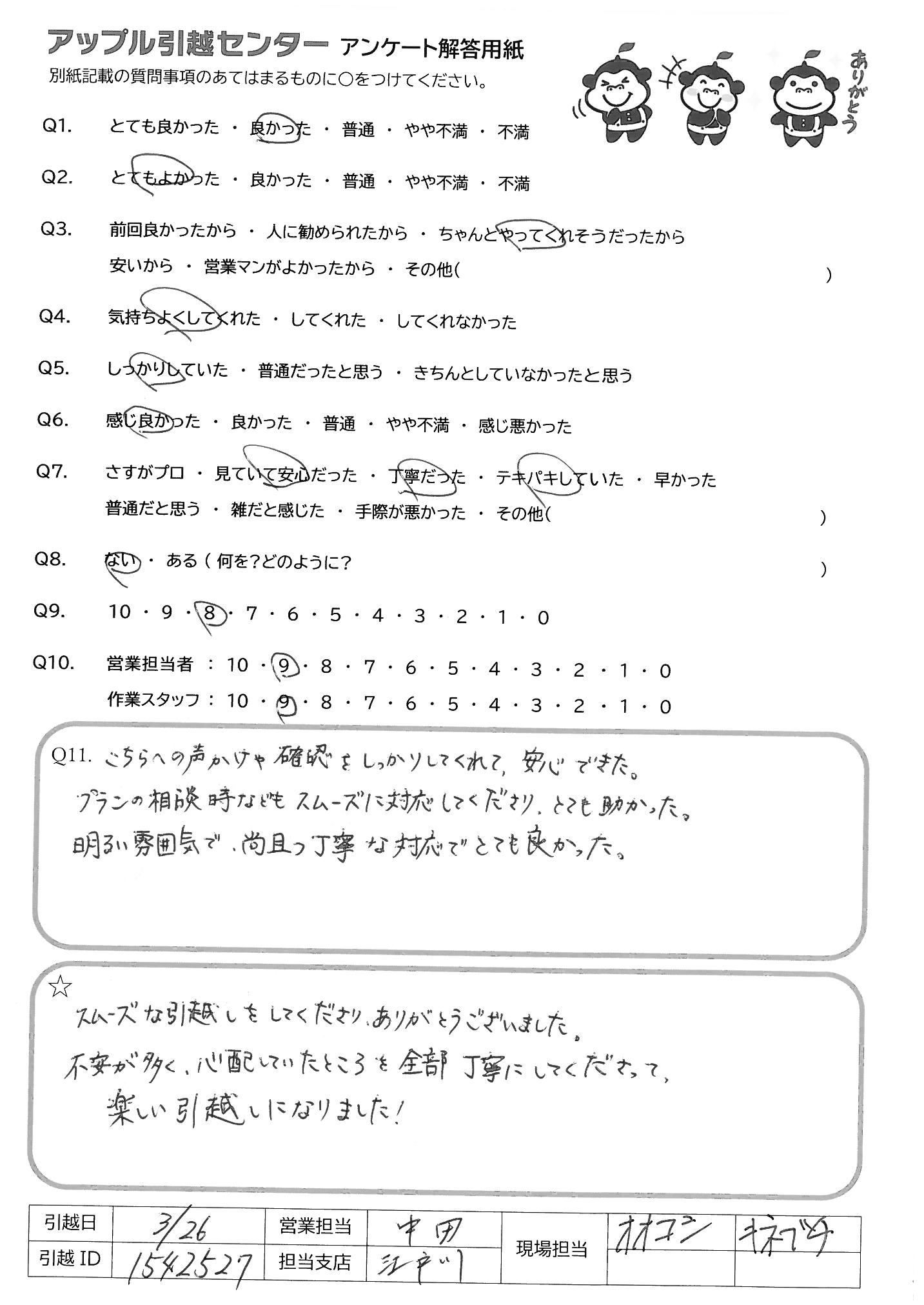A.スムーズな引越しをしてくださりありがとうございました 不安が多く、心配していたところを全部丁寧にしてくださって 楽しい引越しになりました!