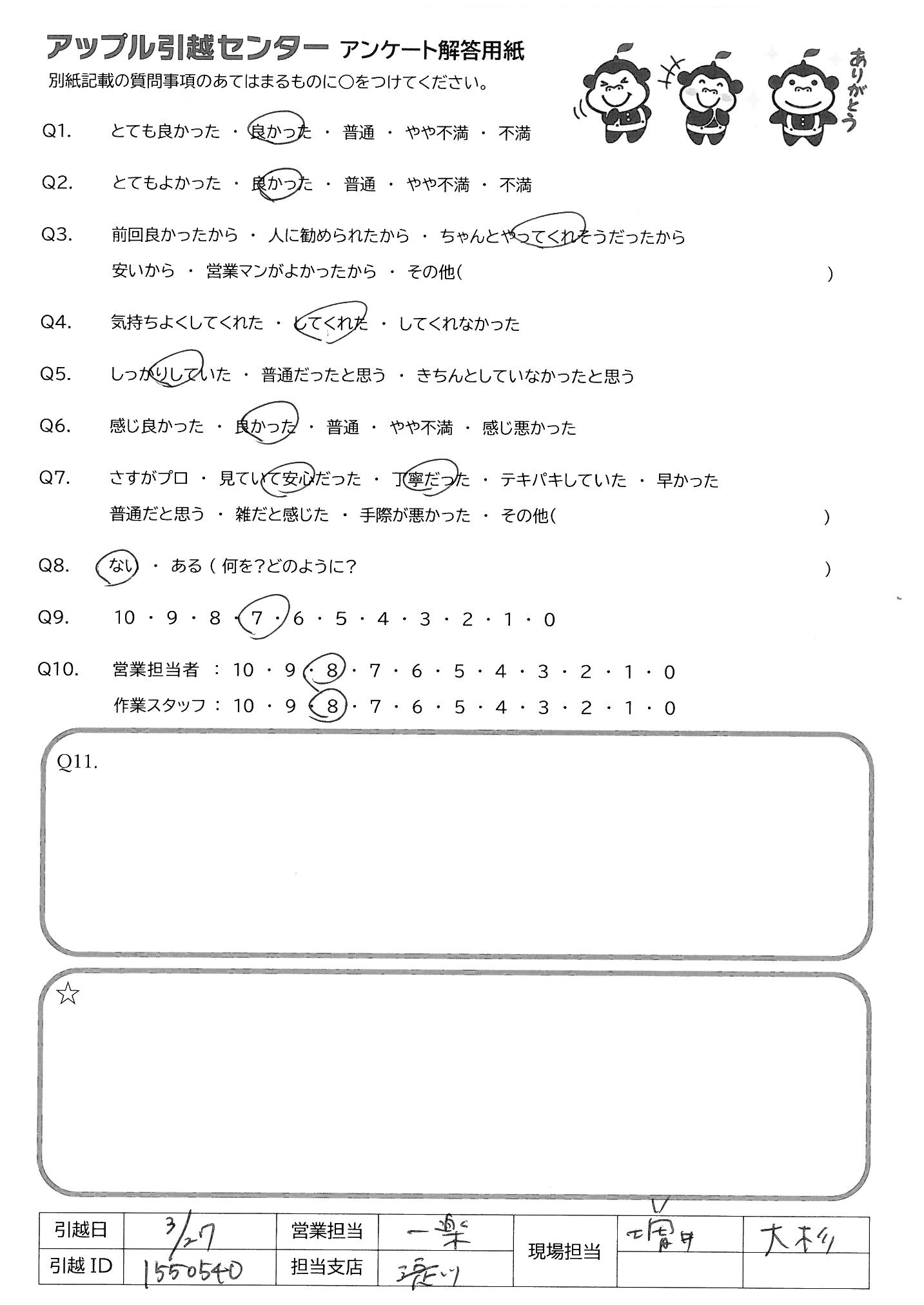 A.・新居に入る際、入居前の傷や汚れのチェックポイントについて丁寧に教えていただき助かりました。 ・搬入時、マスクをつけないで作業していた方がおり、少し残念に思えた。ご時世柄、引っ越しをする事態慎重になっていたので、お願いしてる手前申し訳ないですがスタッフさんにも気をつけていただきたかったです。