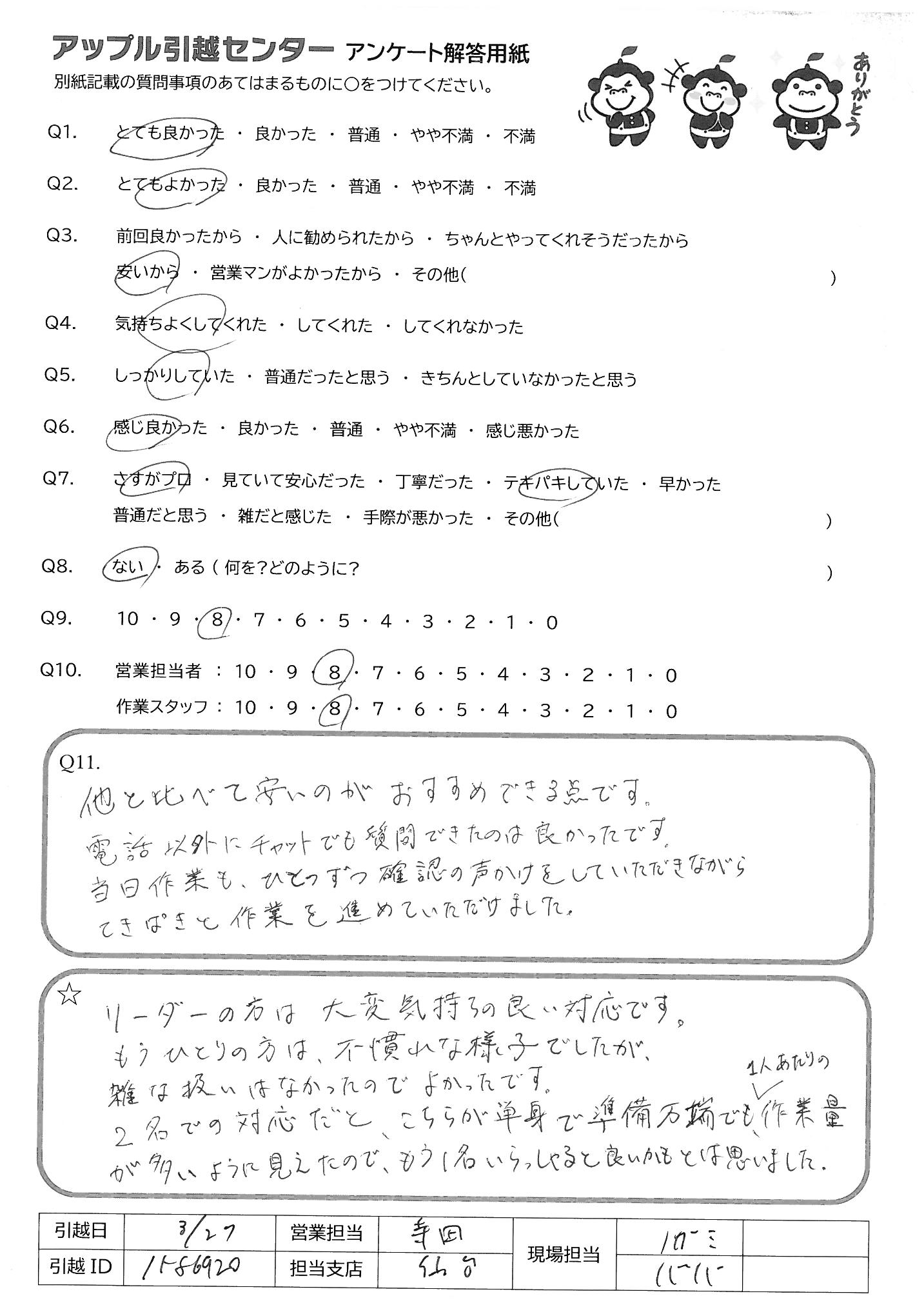 引越し日:2022年03月26日 エリア:宮城県仙台市宮城野区