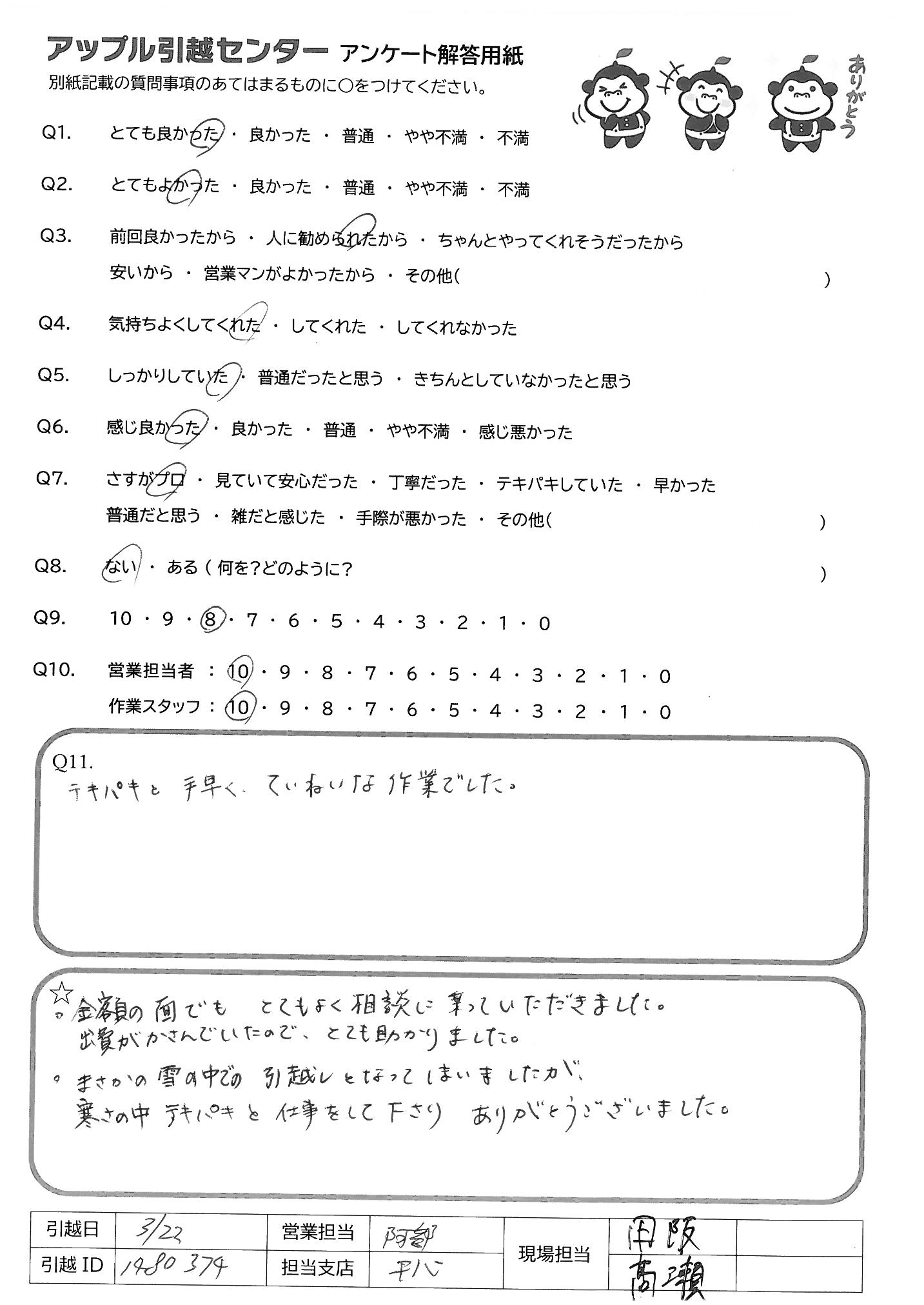 A.繁忙期でしたが、ご対応いただきありがとうございました。荷物を搬出した神戸、搬入した東京のいずれでも迅速に対応いただきました。特に東京で担当いただいたお二人は長い一日だったと思いますが、遅い時間にありがとうございました。荷ほどきをしている中で今のところ荷物が壊れている等は見つかっておりませんが、何かありましたら期限内にお知らせいたします。