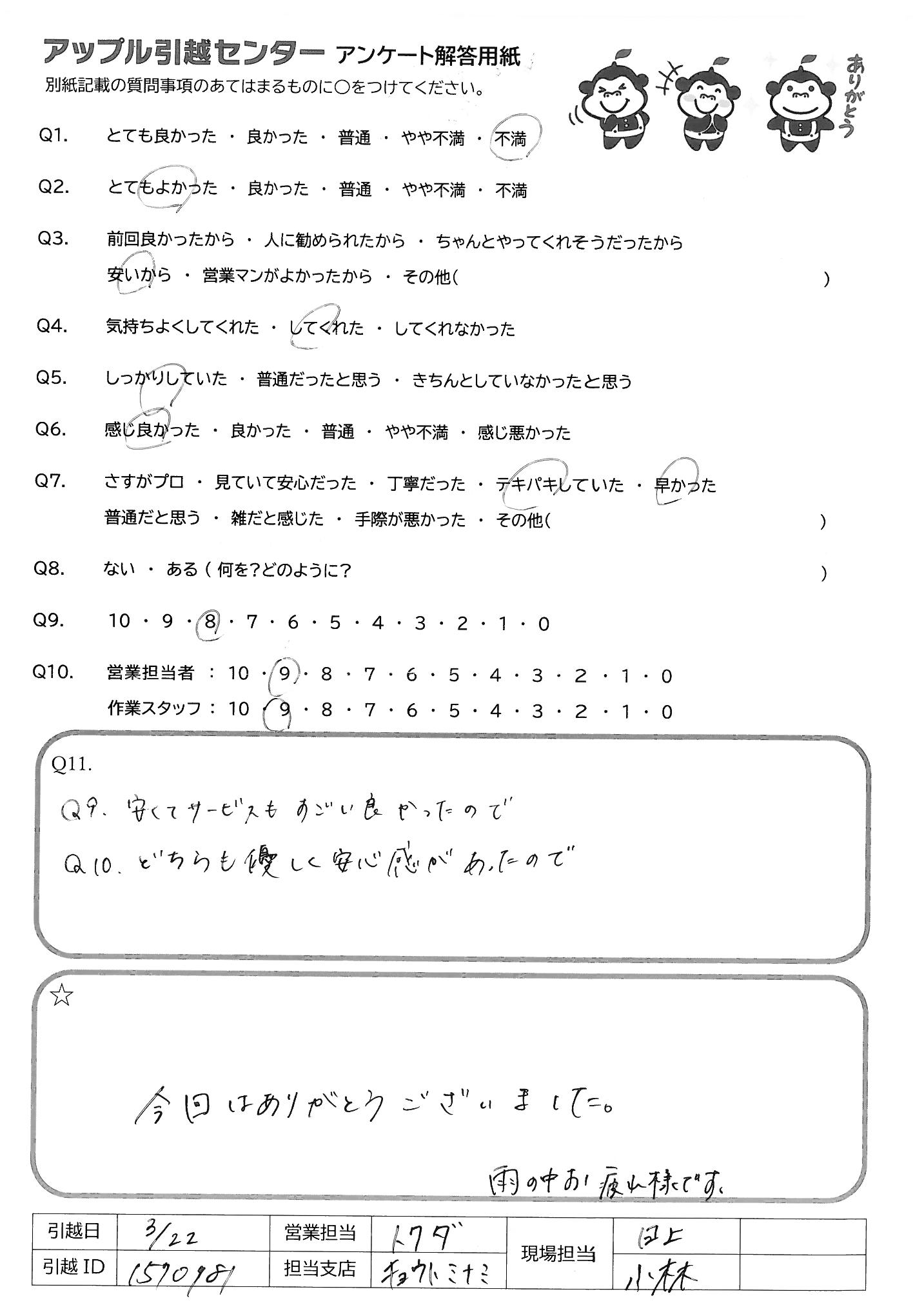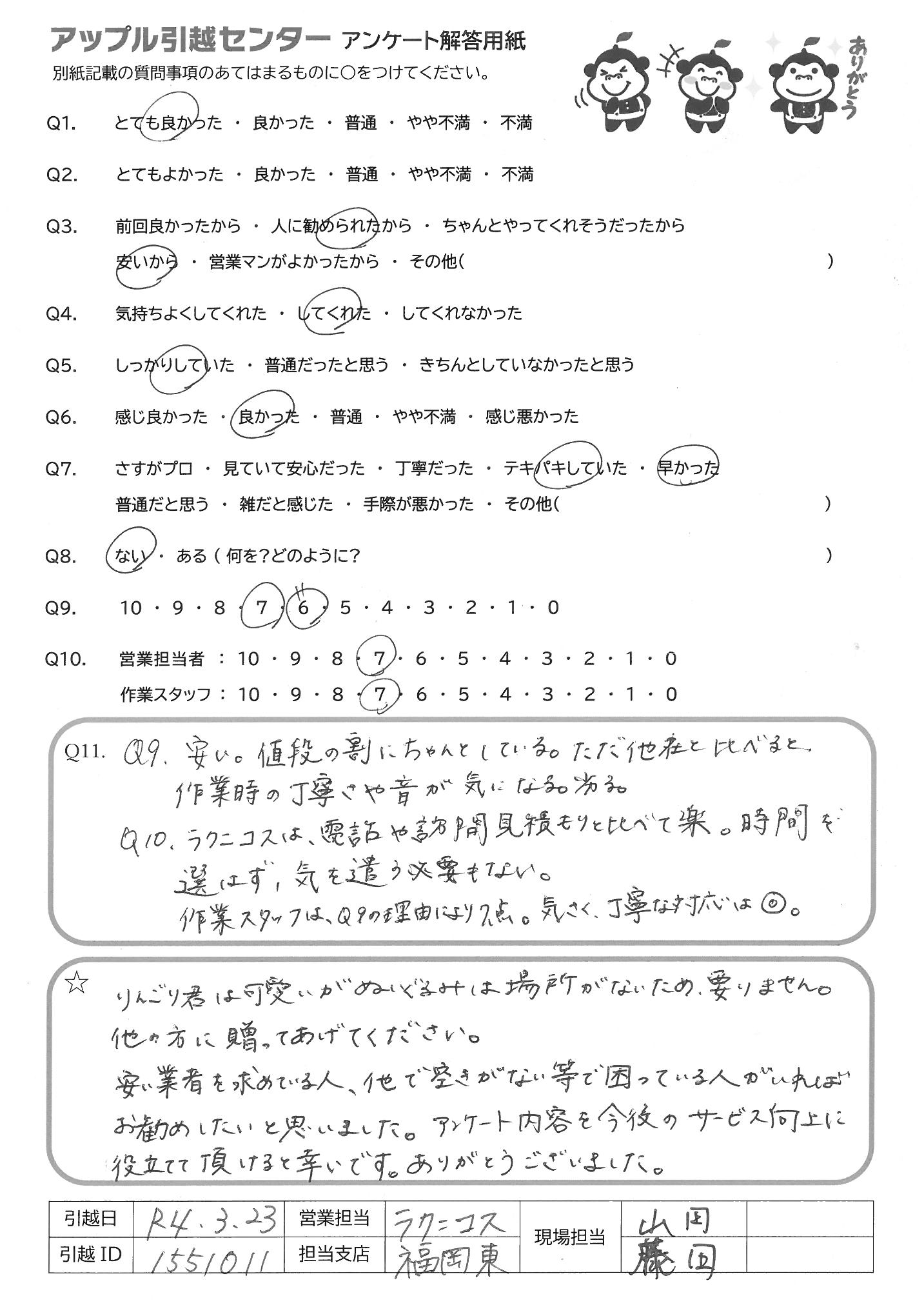 A.Q9.安い値段の割にちゃんとしている。ただ他社に比べると 作業時の丁寧さや音が気になる。劣る。 Q10.ラクニコスは電話や訪問見積もりと比べて楽。時間を 選べず、気を遣う必要もない。 作業スタッフはQ9の理由により7点 気さく丁寧な対応は◎