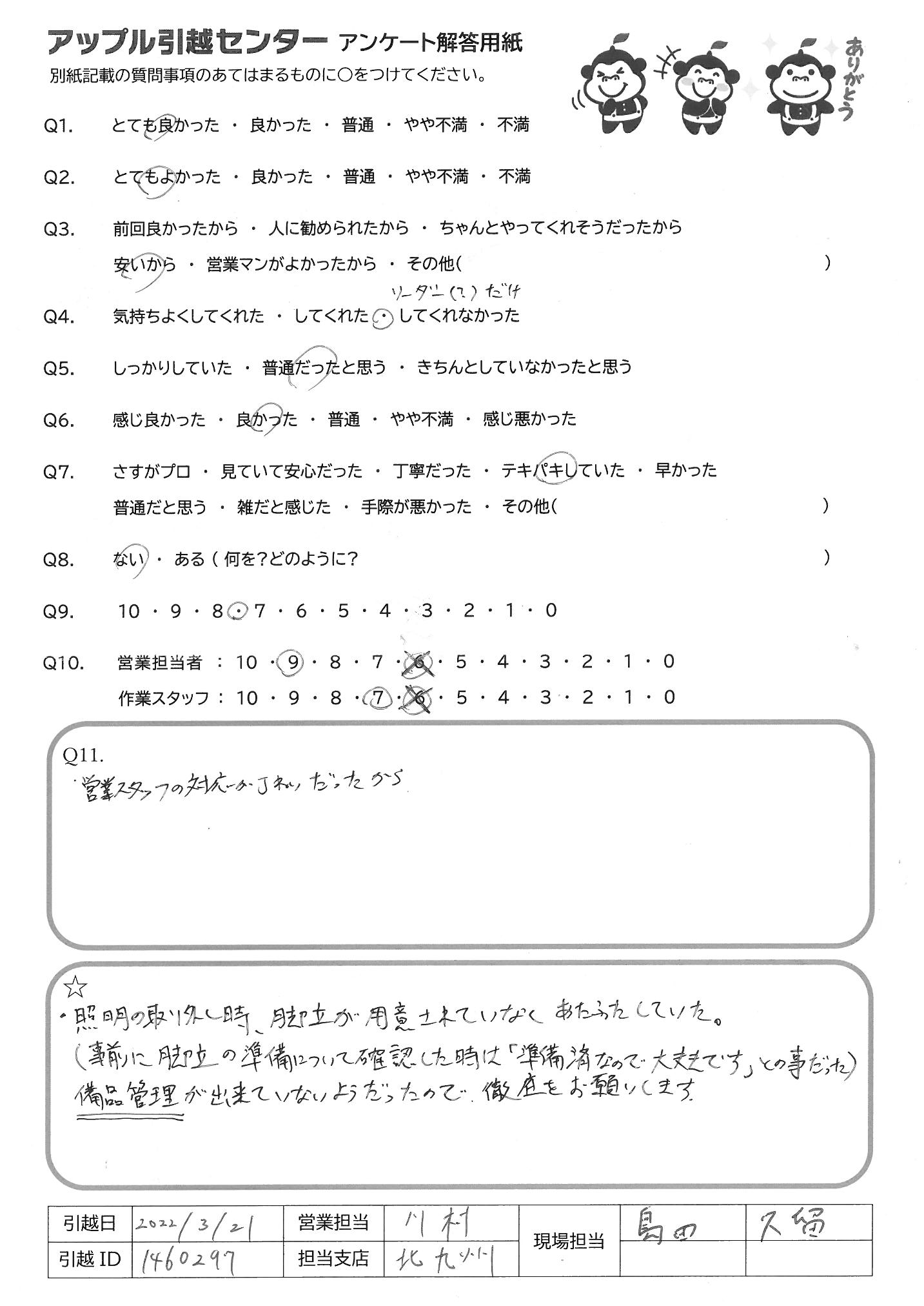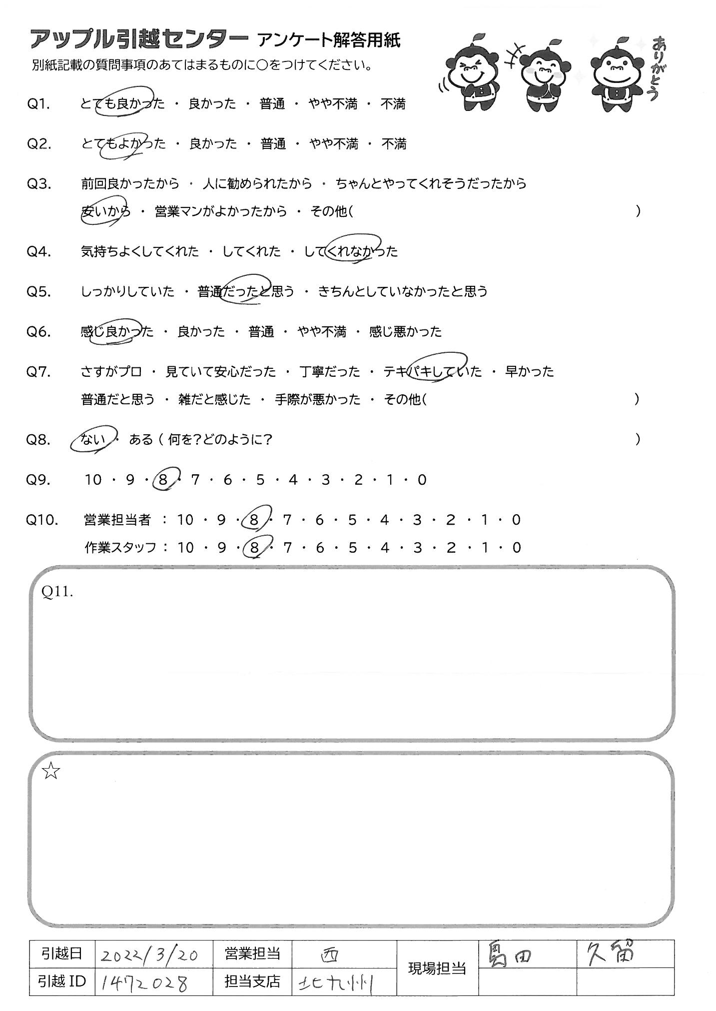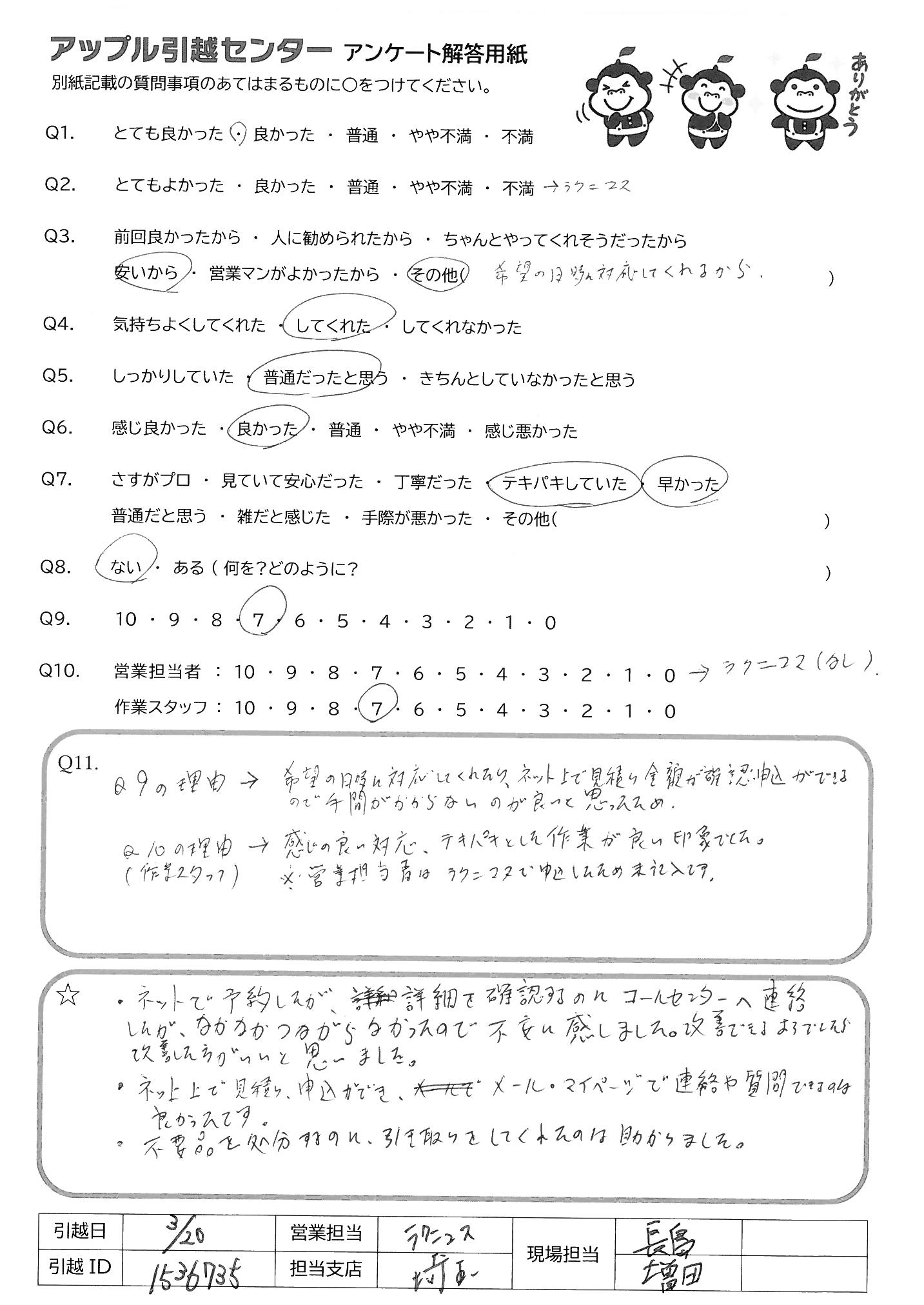 A.Q9の理由→希望の日時に対応してくれたり、ネットで見積り金額が確認申込ができる ので、手間がかからないのが良いと思ったため Q10の理由→感じの良い対応、テキパキとした作業が良い印象でした ※営業担当はラクニコスで申込したため未記入です
