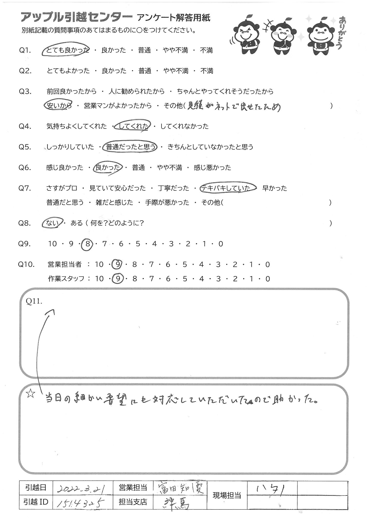 A.3人で来る予定が1人が体調不良で急遽2人になってしまったと伺いましたが、テキパキと作業を進めてくださり感謝しています。繁忙期、かつ、分譲のタワーマンションということもあり、前回お願いしたときよりもだいぶお値段は高かったですが、総合的には満足しています。また引っ越すことがあれば、お願いしたいと思います。ありがとうございました。