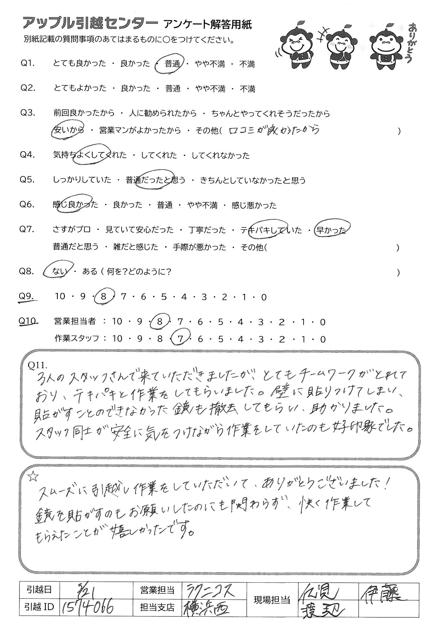 A.スムーズに引越し作業をしていただいて、ありがとうございました! 鏡を貼がすのもお願いしたのにも関わらず、快く作業して もらえたことが嬉しかったです