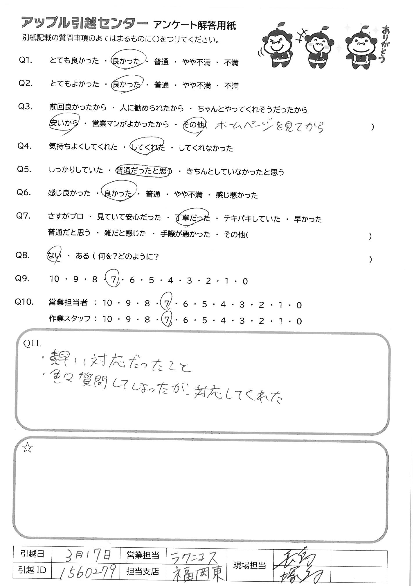 A.引越し申し込み完了後の数回のメールも含めて全体的に対応がとてもよかった。