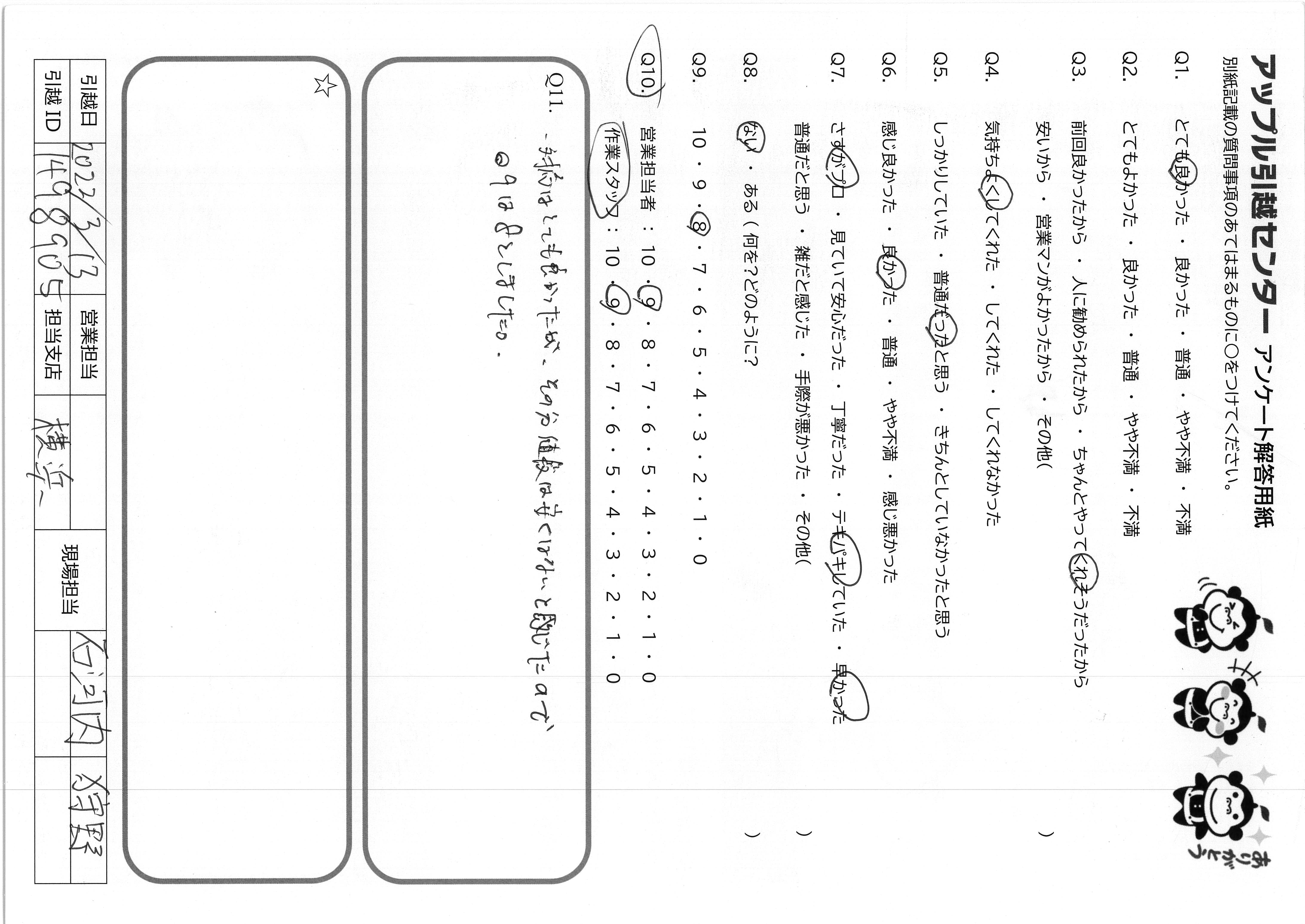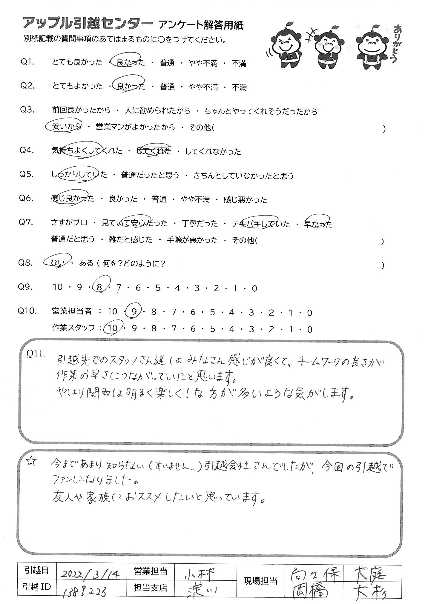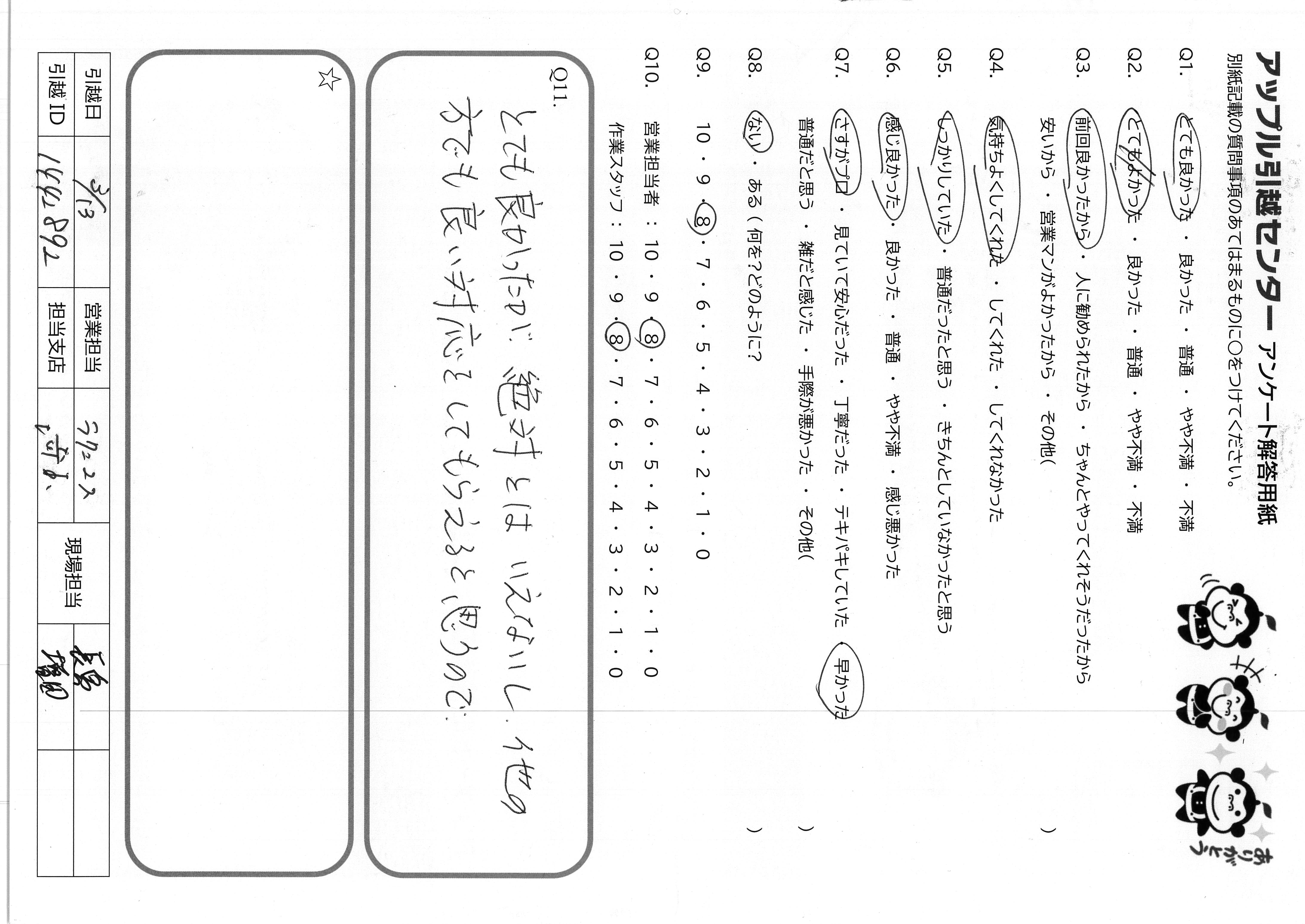 A.今まであまり知らない(すいません…)引越会社さんでしたが、今回の引越でファンになりました。友人や家族におススメしたいと思っています。