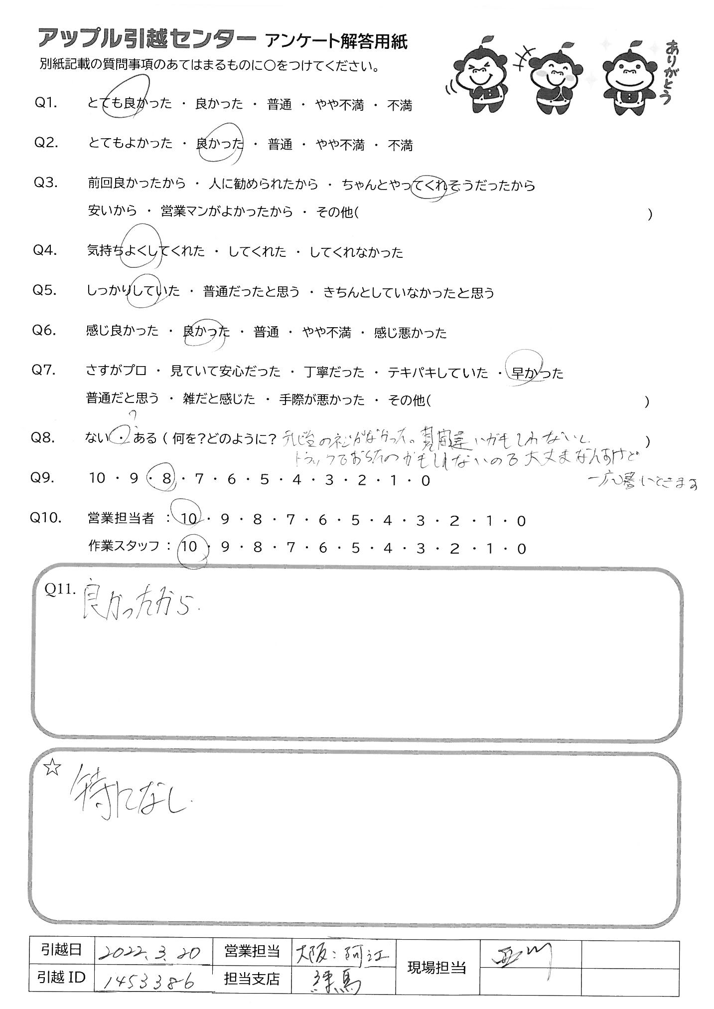 A.現場担当して頂いた大塚さん大内さんはとても丁寧に 梱包して頂き運んで頂きました また退屈しないようにお声がけ頂いたり、何度も荷物忘れないか チェック頂きお気遣い頂き大変たすかりました 人数は少ないかな?と思いましたが、お二方の仕事を拝見させて頂き 私自身、またおねがいしたいので、家族や友人にもすすめたいなと思えました